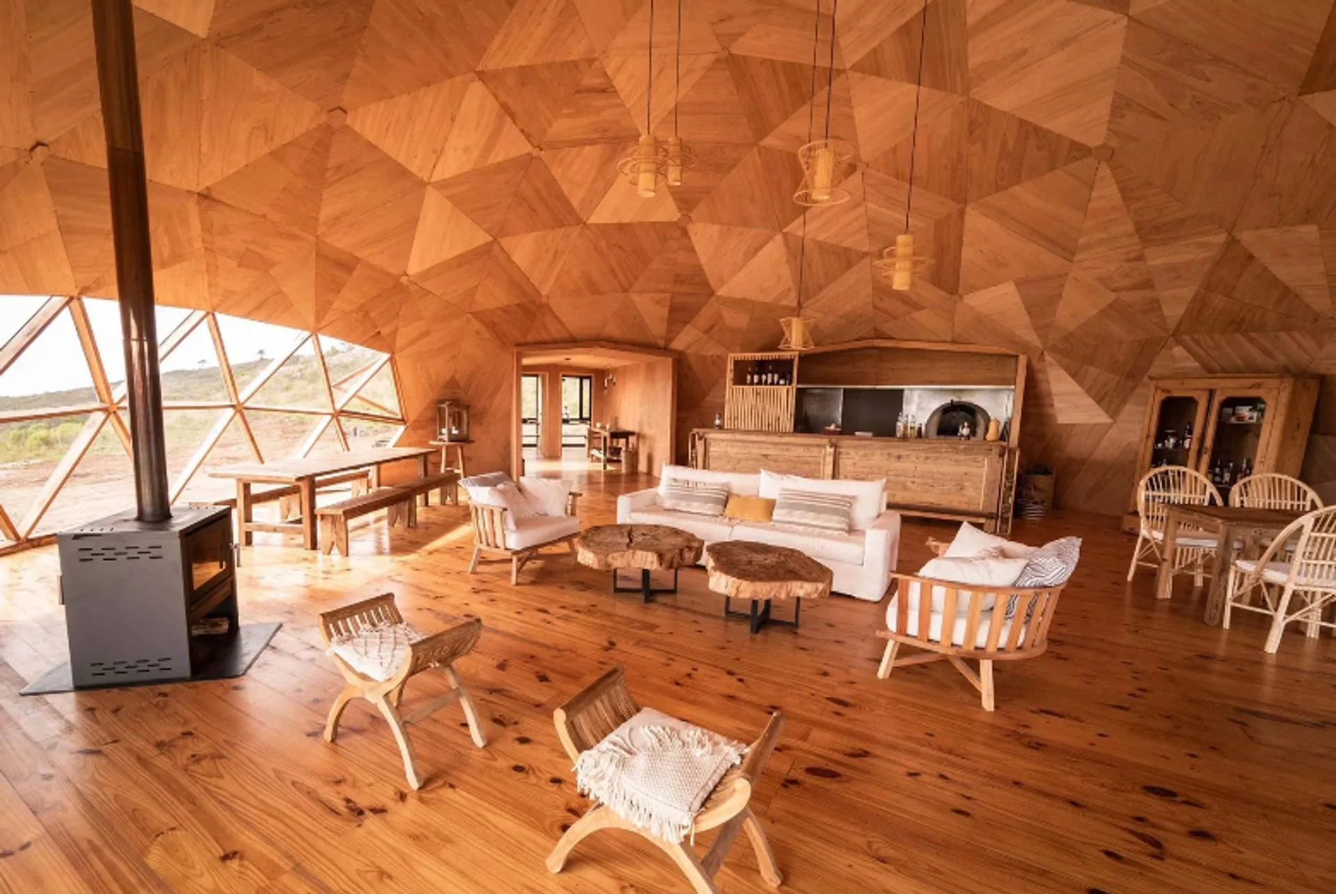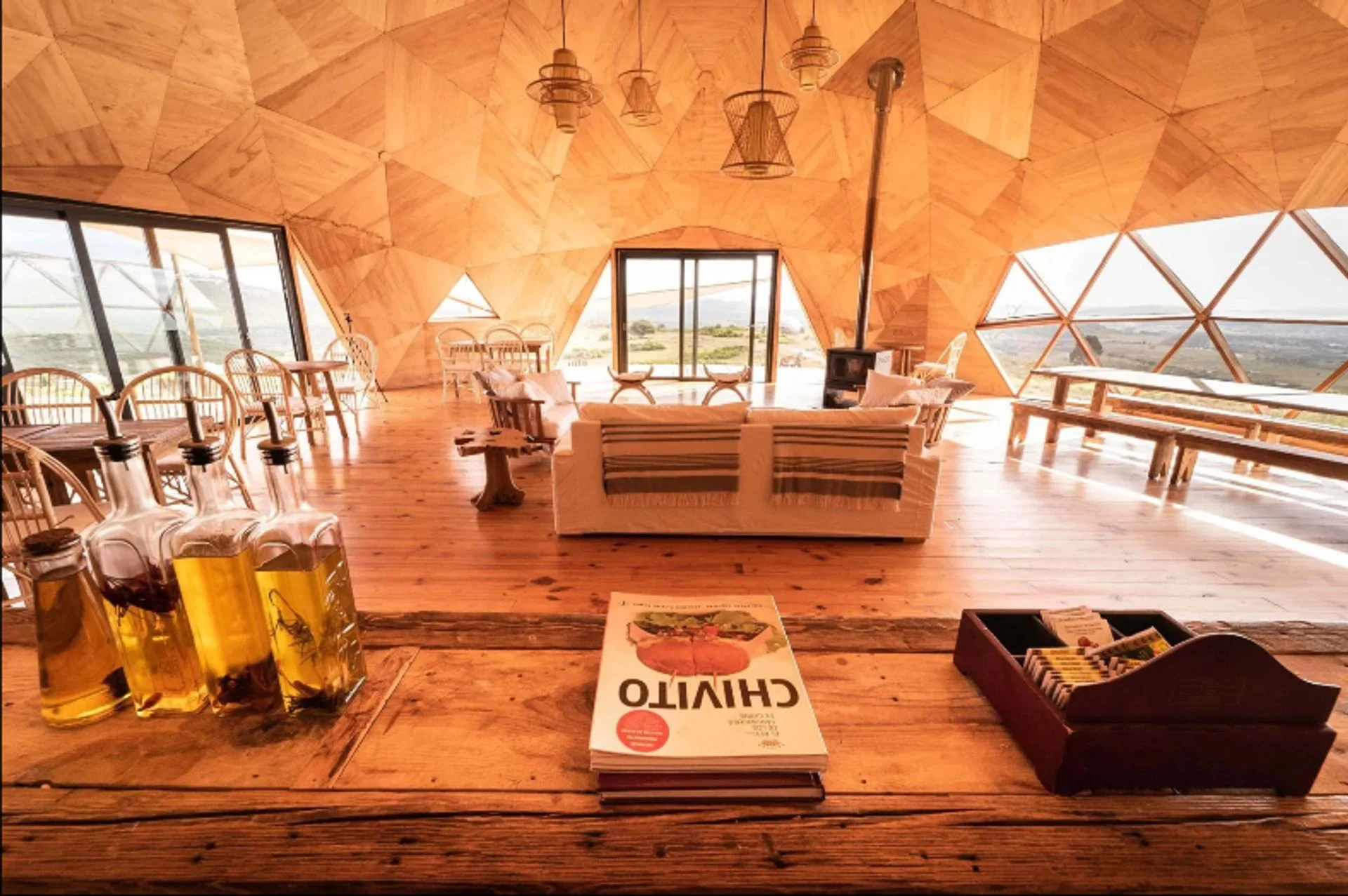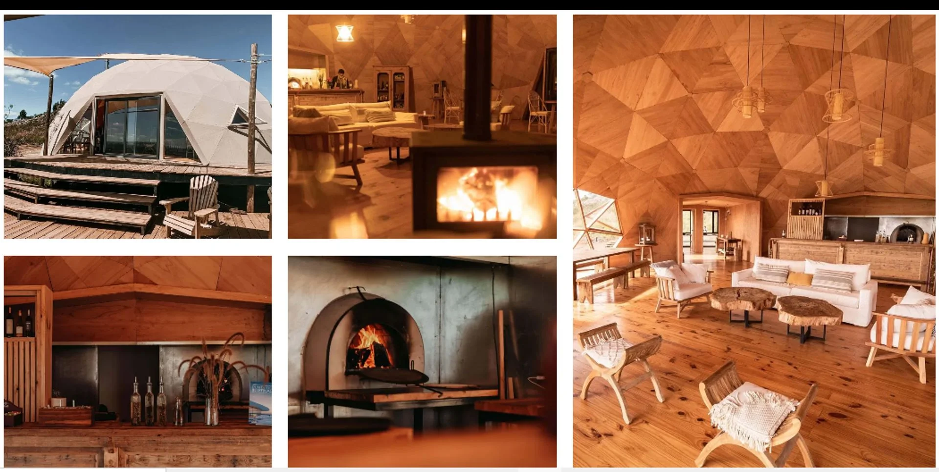 servicios: un hotel, un restaurante (que ofrece una infraestructura con vistas extraordinarias y take-away), así como unidades para alquiler temporario con estructuras de madera y ventanales enormes, distribuidos