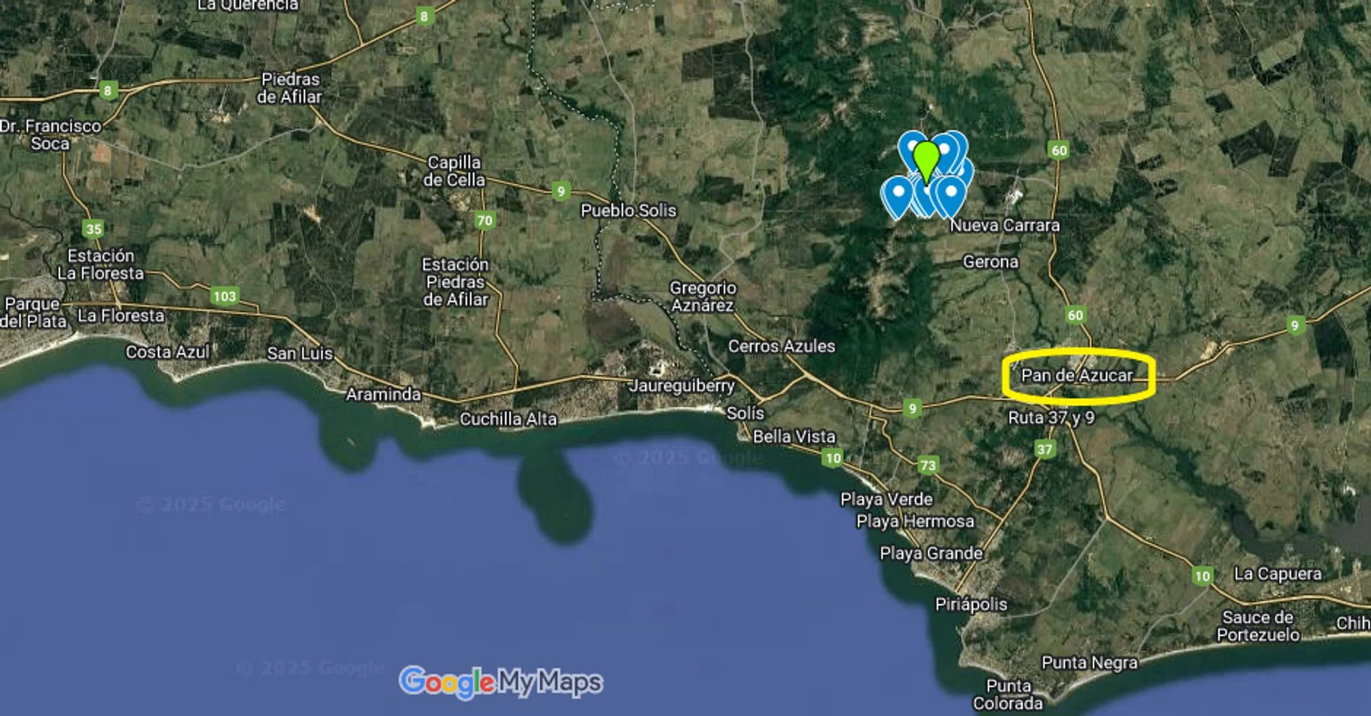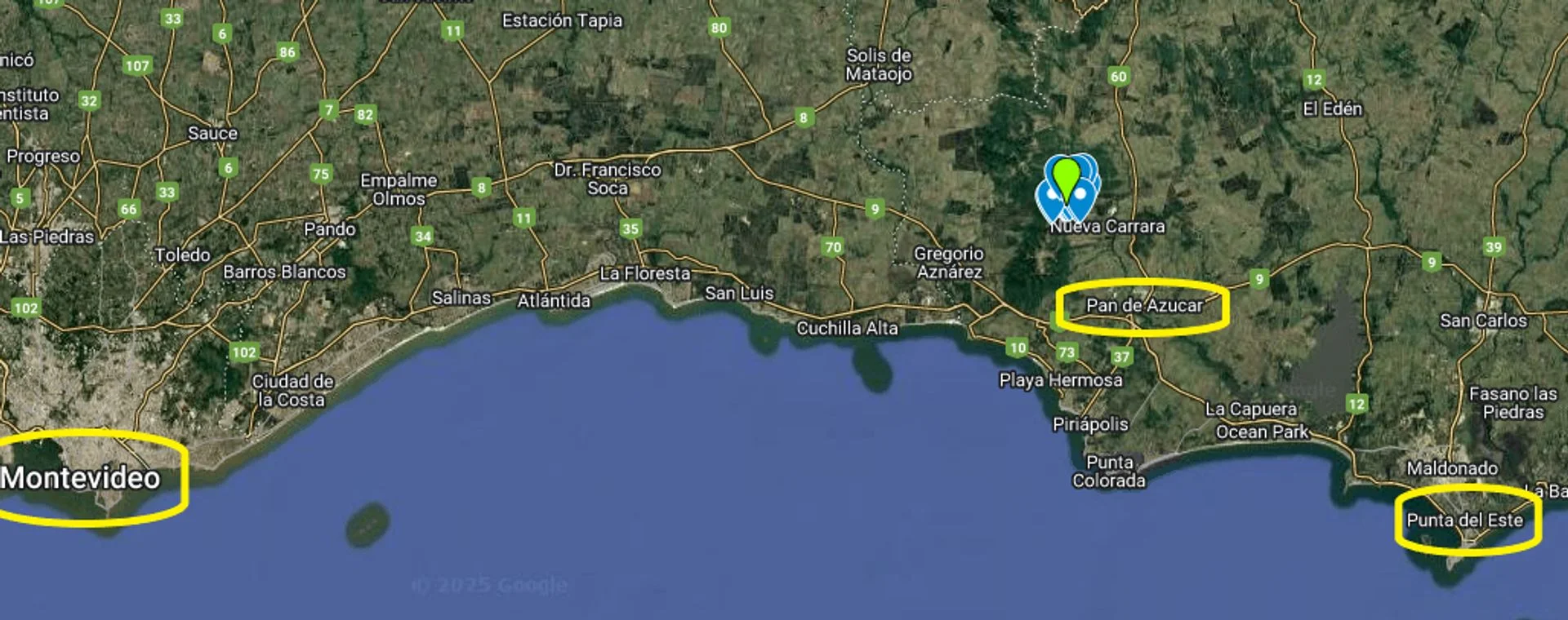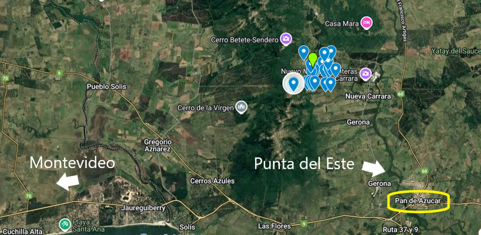chacras. El complejo está ubicado a 105 km de Montevideo, 55 km de Punta del Este, 20 minutos del balneario Piriápolis, con una interesante oferta de playas y gastronomía y a minutos de la ciudad de Pan de Azúcar, con todos los servicios disponibles (supermercado, ferretería, barracas de materiales de construcción, etc.).