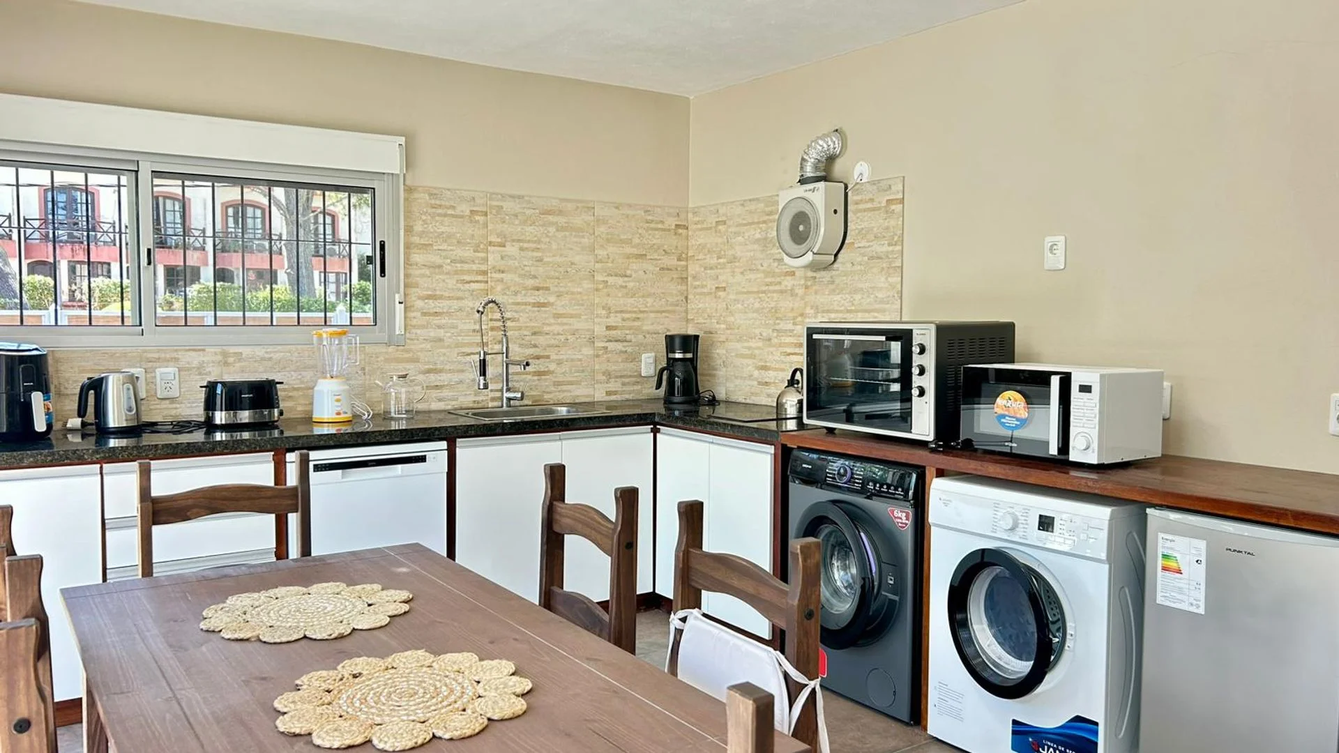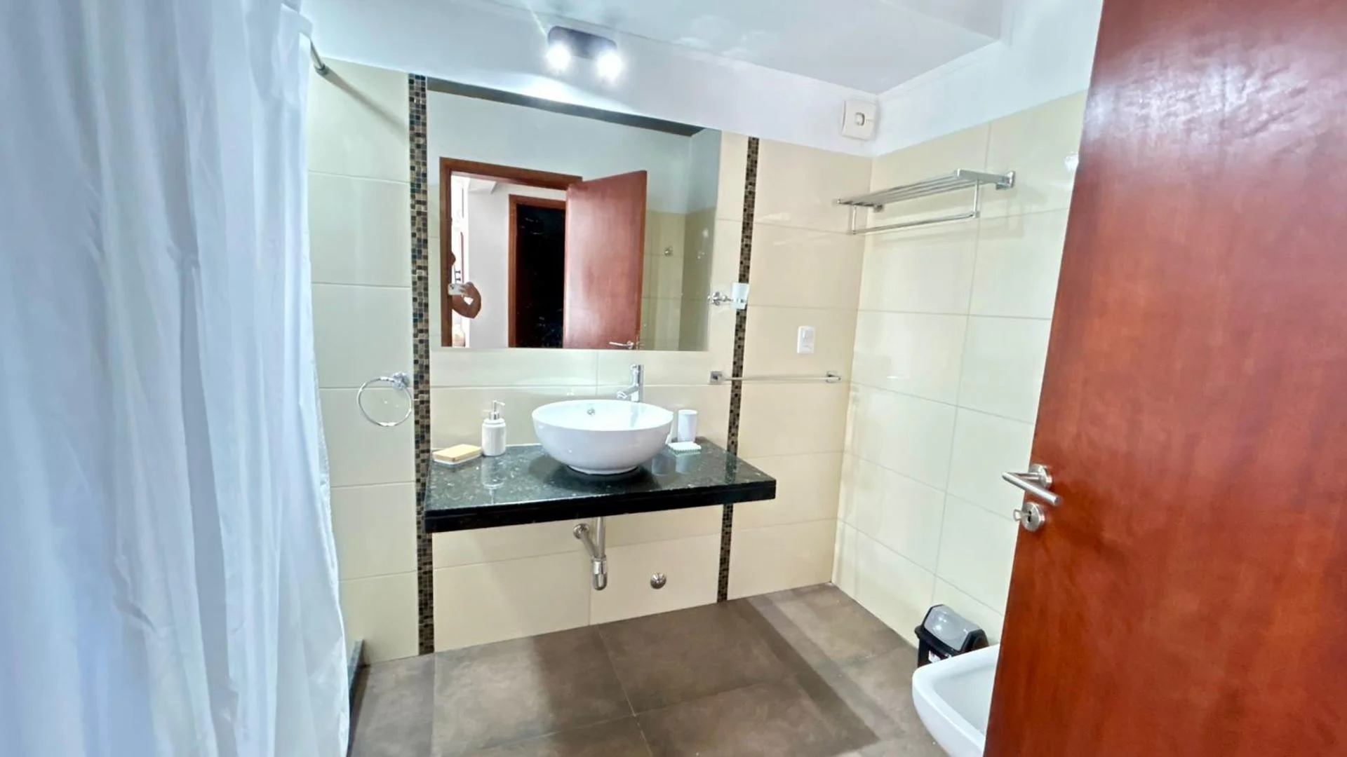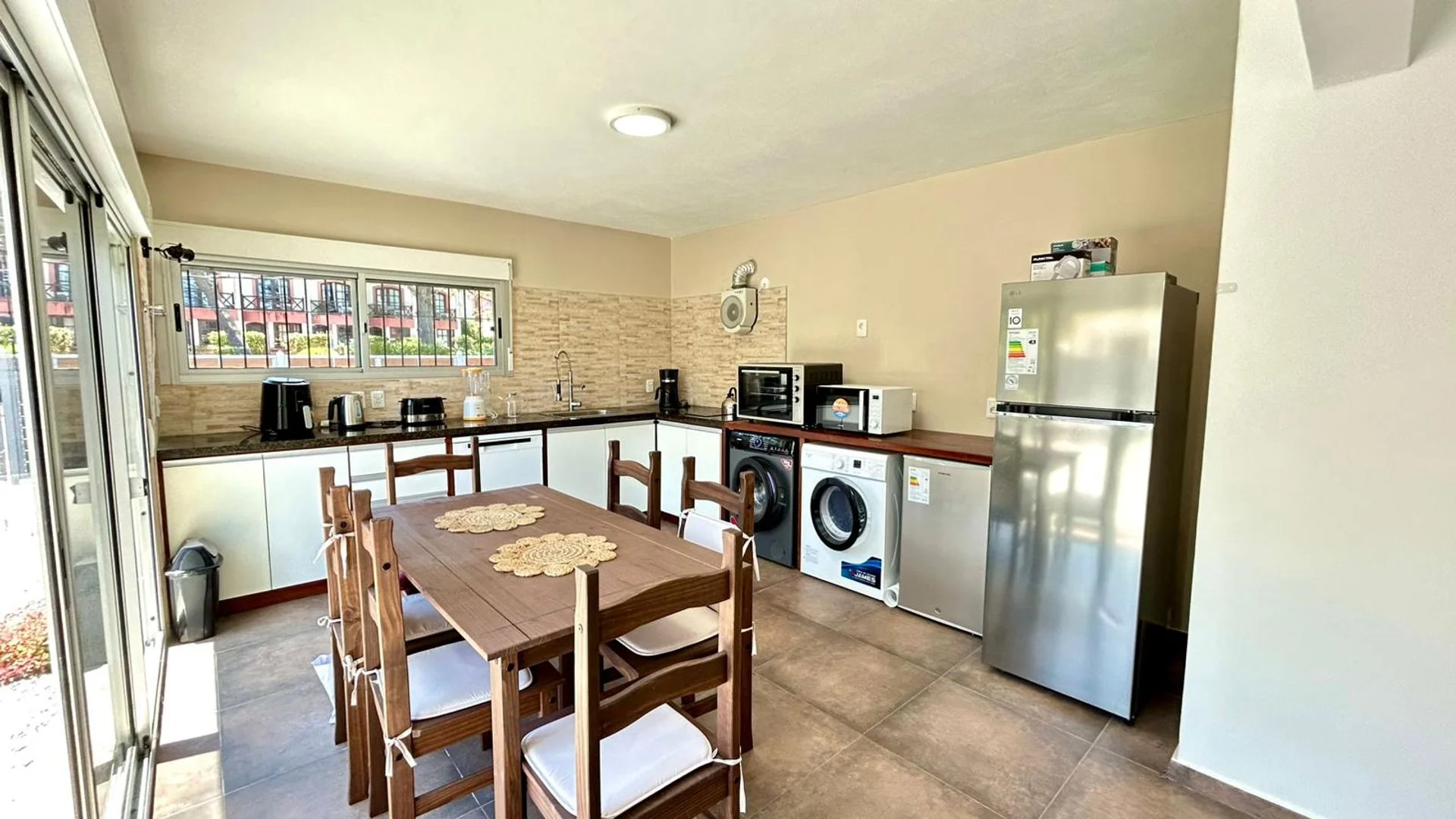 En planta baja se distribuye un amplio living comedor con aire acondicionado, cocina integrada totalmente equipada con horno eléctrico, anafe, lavarropas, secarropas y todos los utensilios necesarios para facilitar el día a día. También dispone de un dormitorio con cama matrimonial, aire acondicionado y dos baños completos.