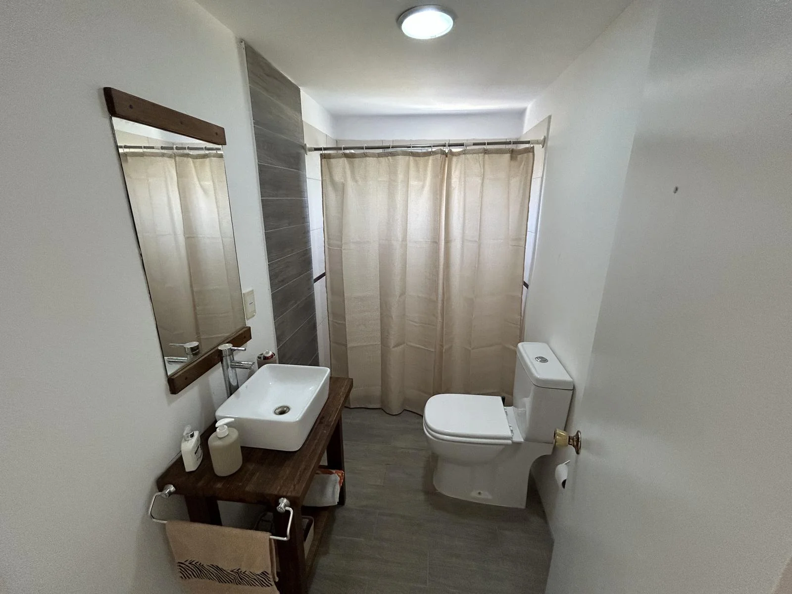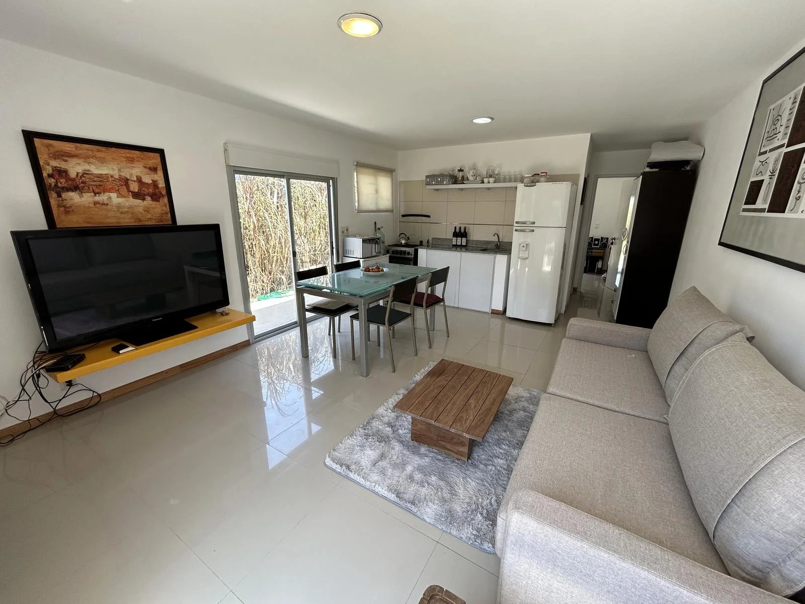 Living comedor con cocina integrada. Ventanales, todos con cortinas de enrollar. Dormitorio con vista y salida al fondo. Parrillero. Disfrutable fondo verde con árboles de palta y níspero,