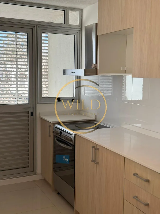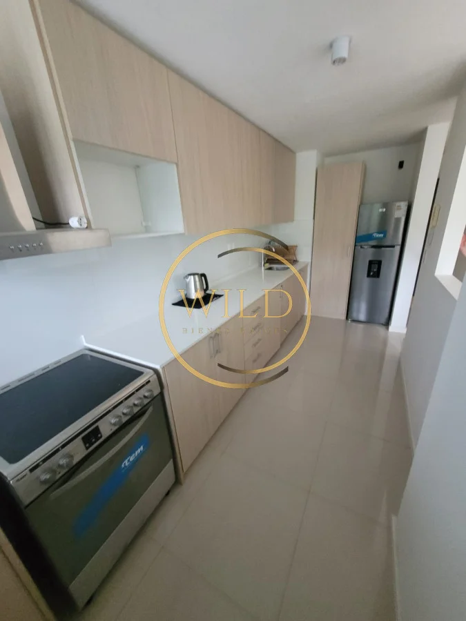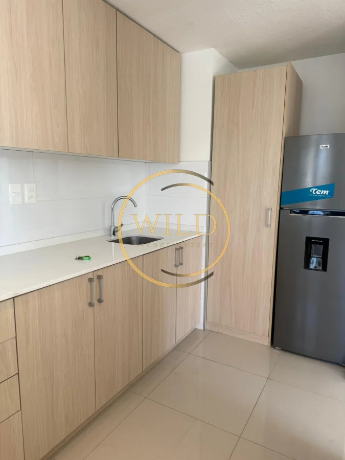 La cocina, definida y equipada, se integra perfectamente con un amplio living comedor, creando un ambiente acogedor.