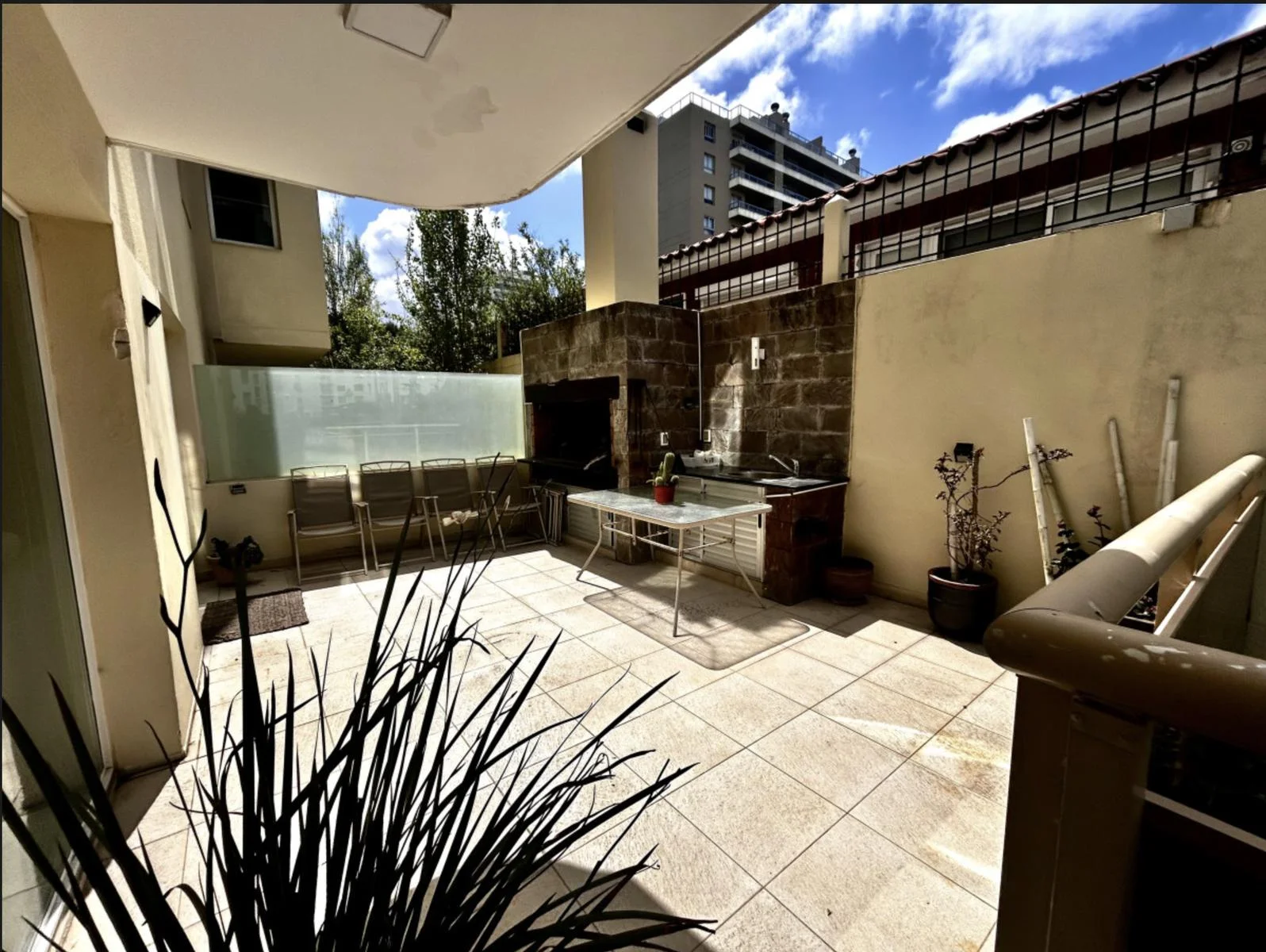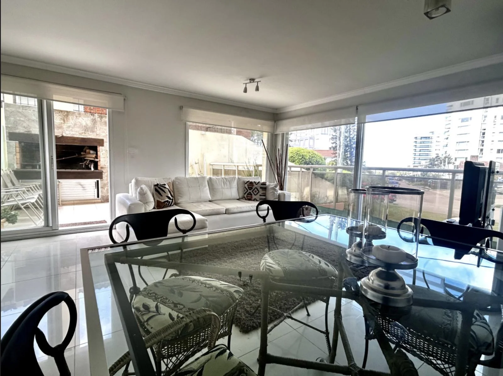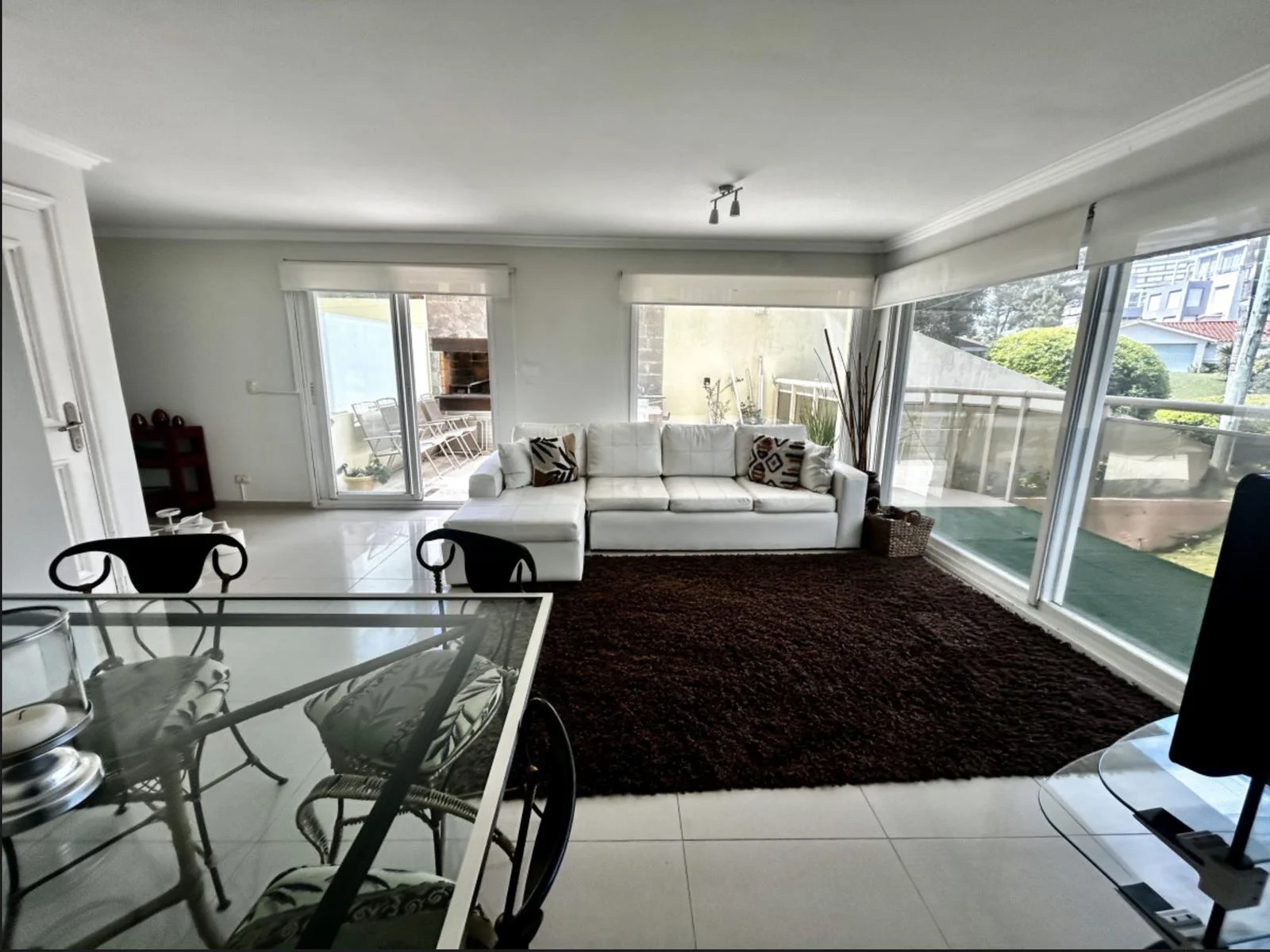 Living comedor con salida a una amplia terraza con parrillero y vista parcial al mar