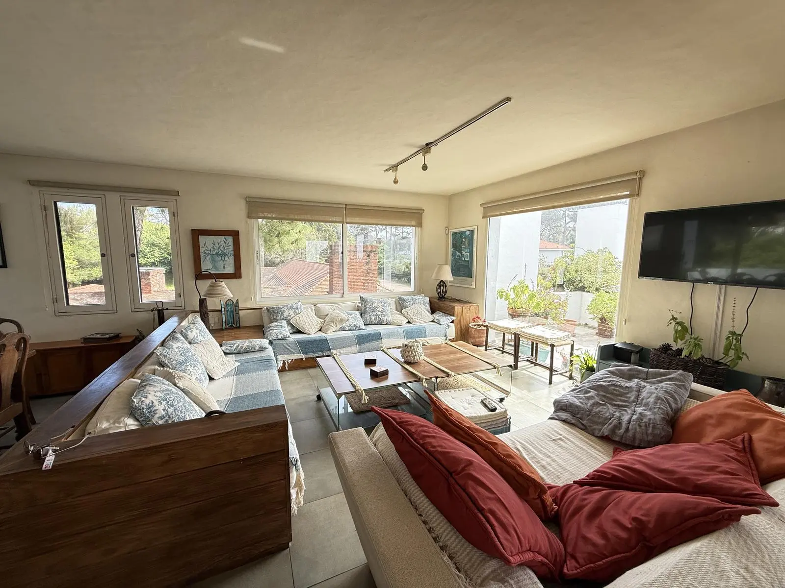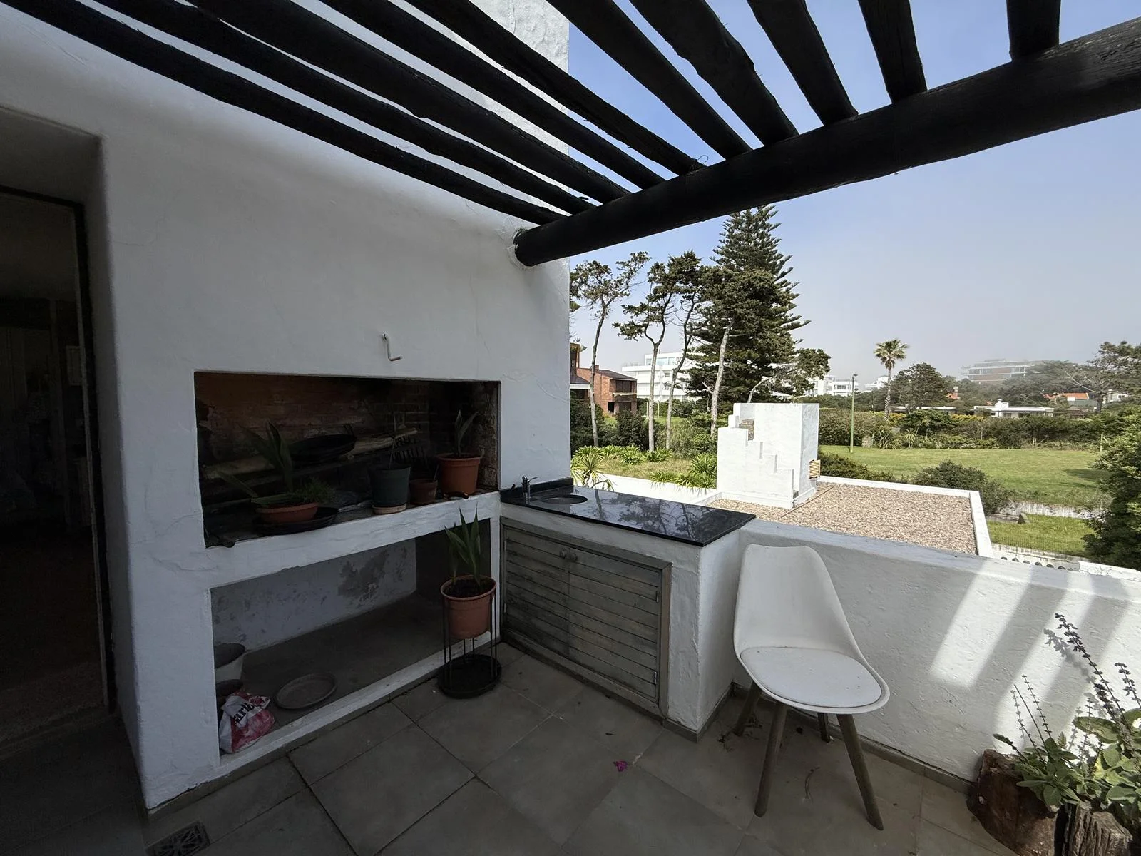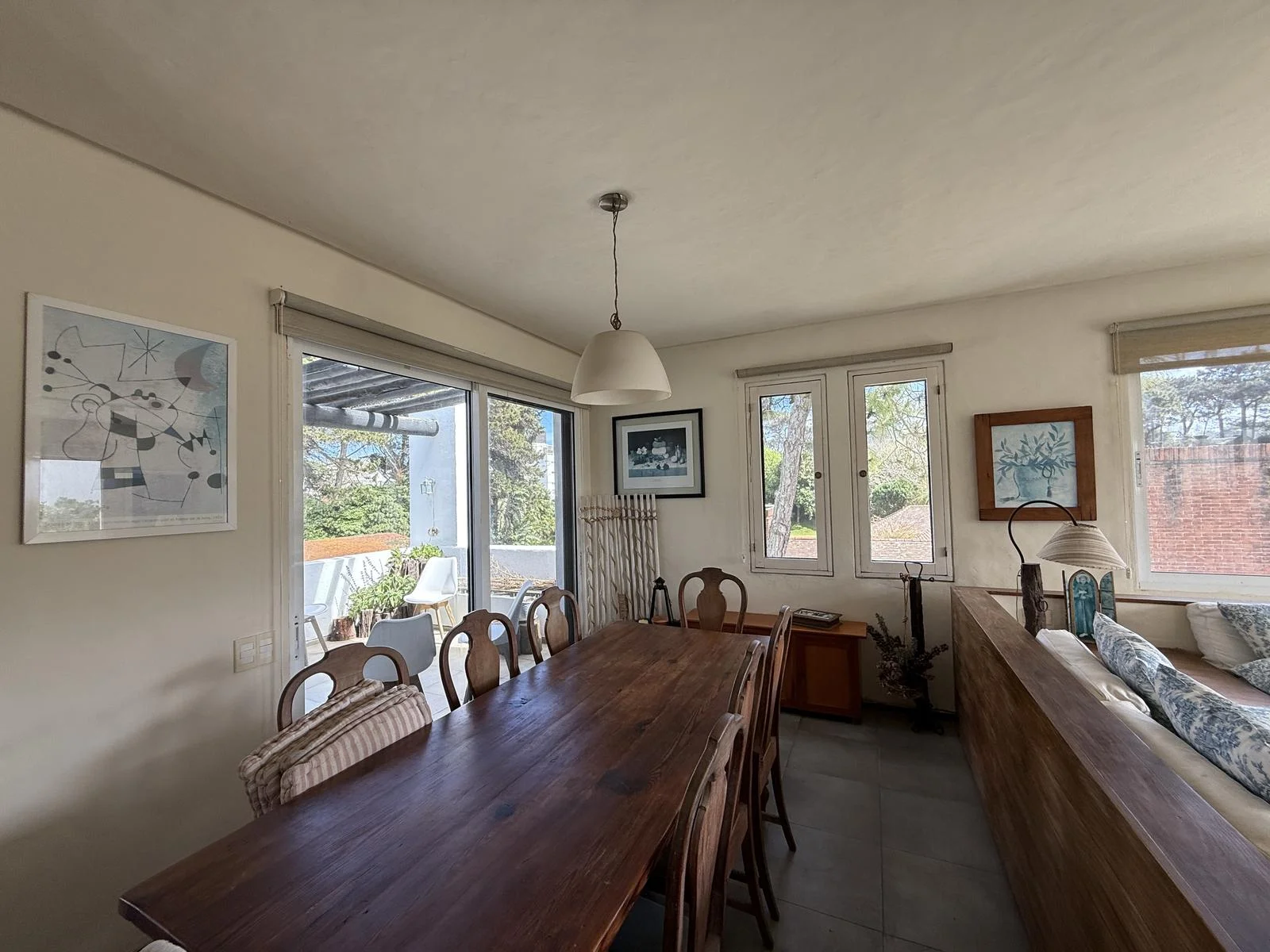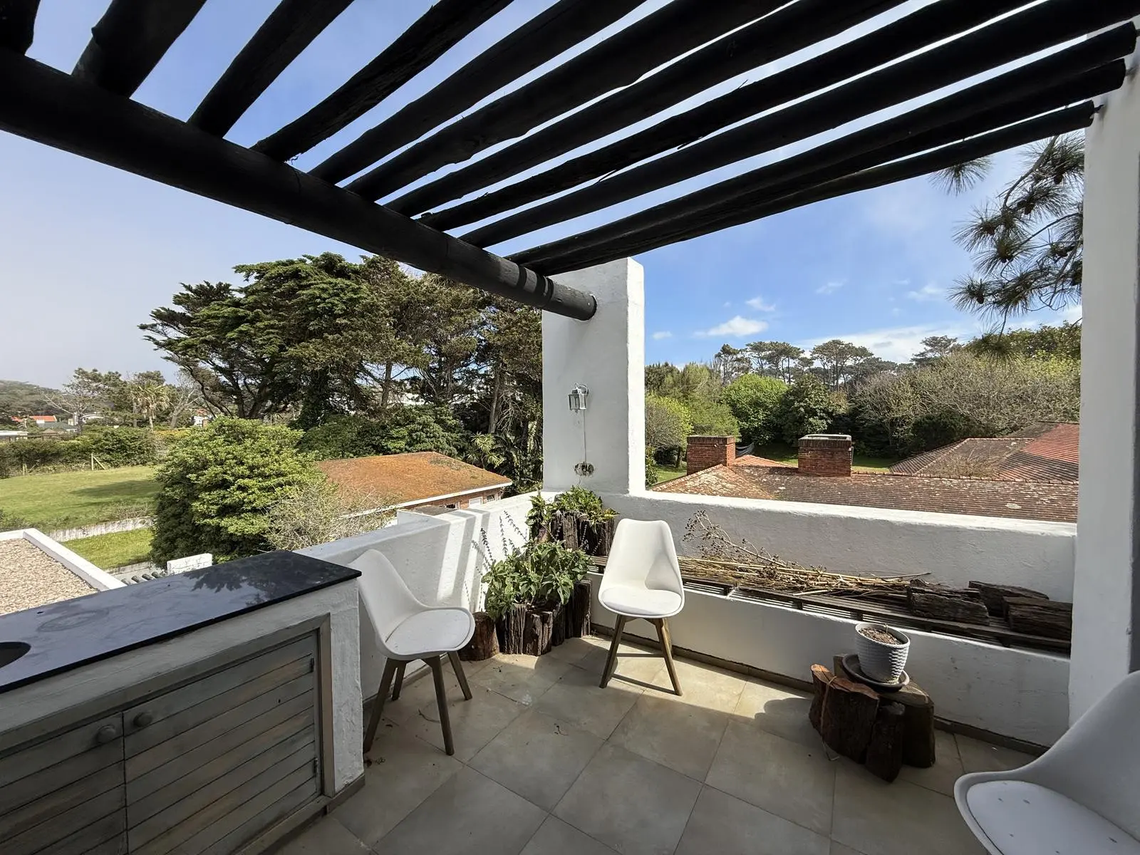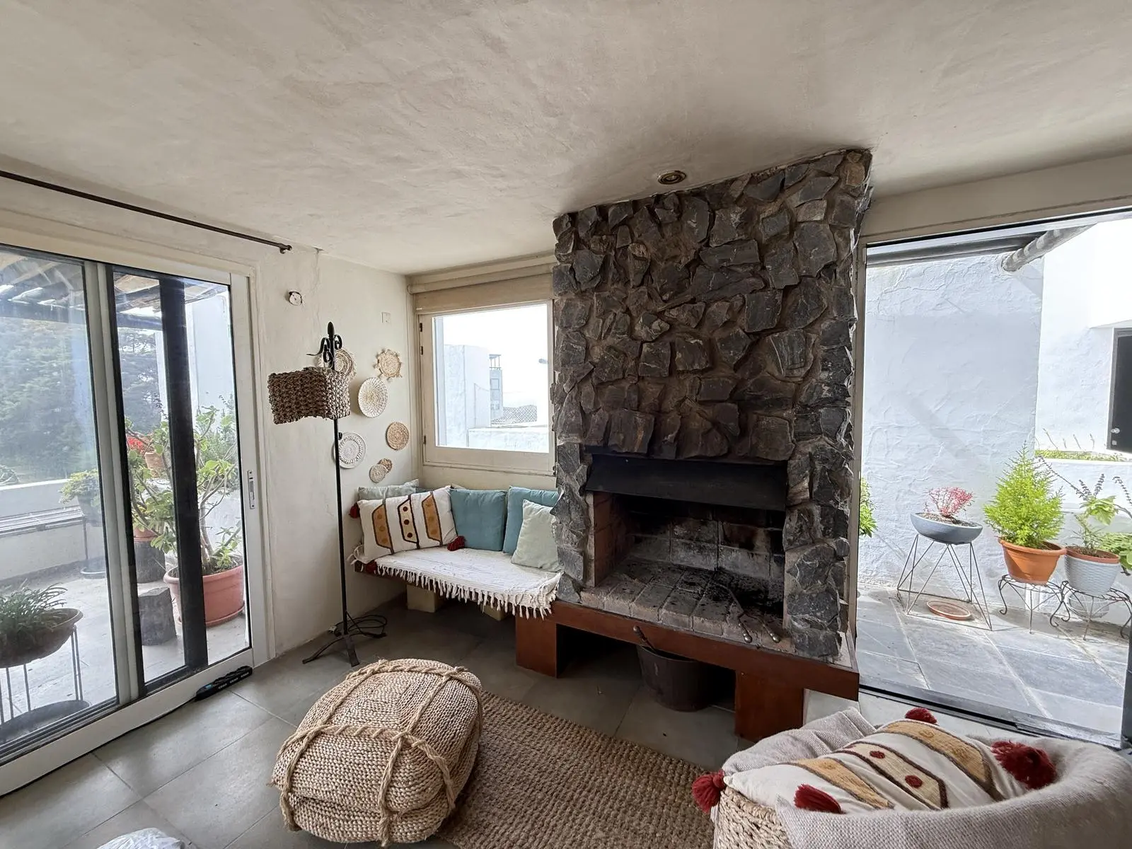 Primer planta: amplio living-comedor con estufa a leña, dos terrazas (una de ellas con parrillero), cocina definida muy luminosa y dormitorio de servicio con baño.
