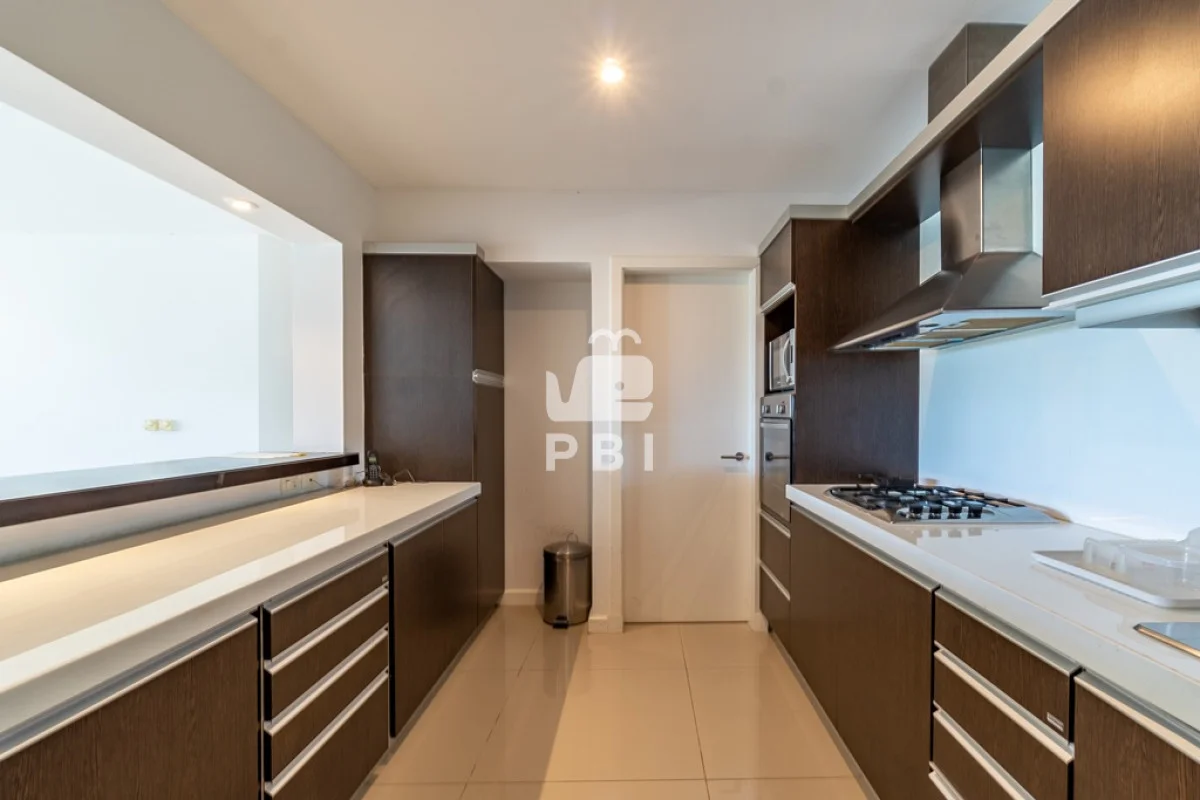 Cocina semi integrada totalmente equipada, barra desayunador y área de lavado.