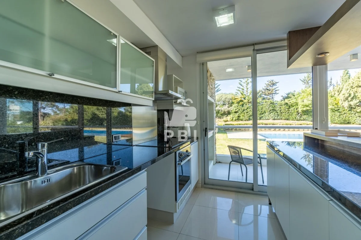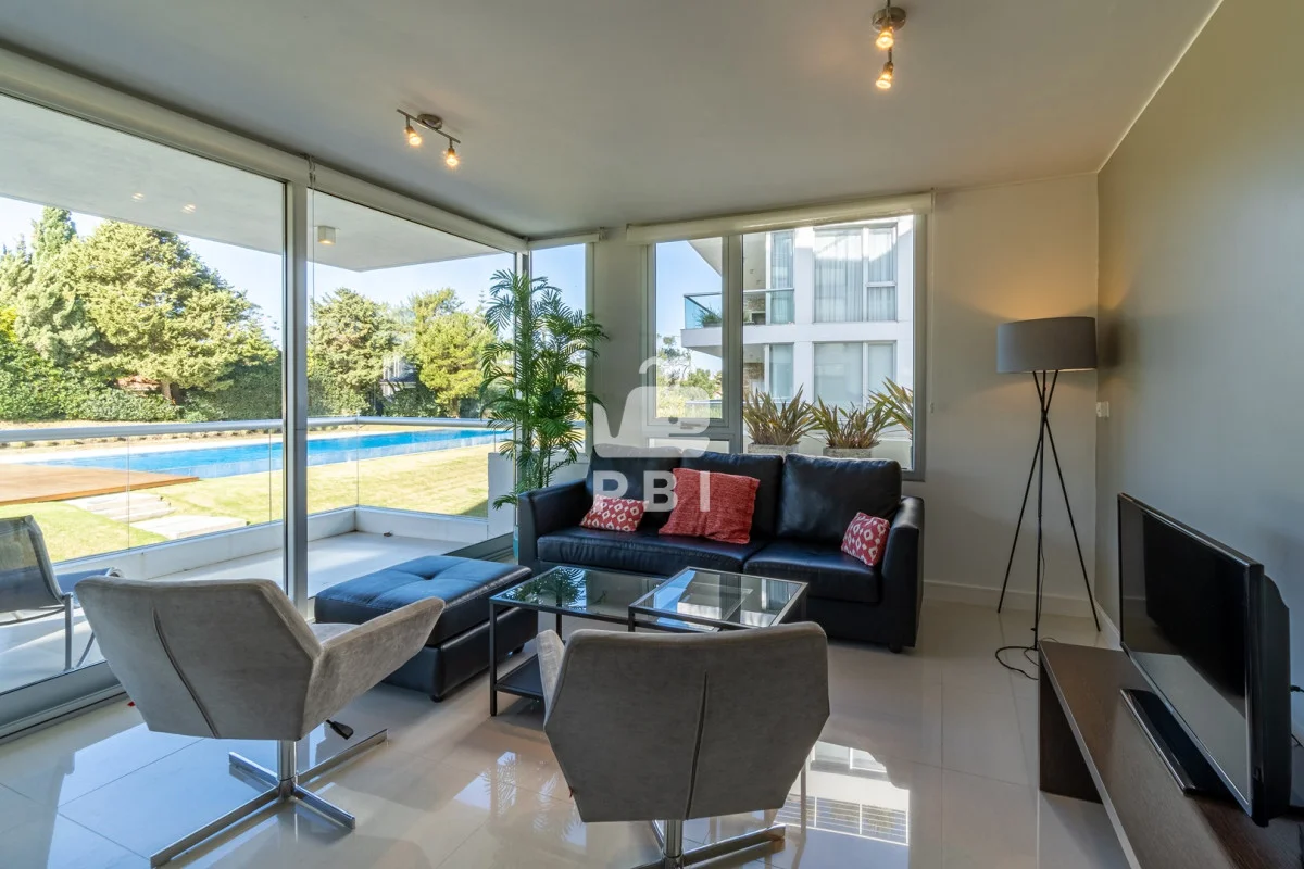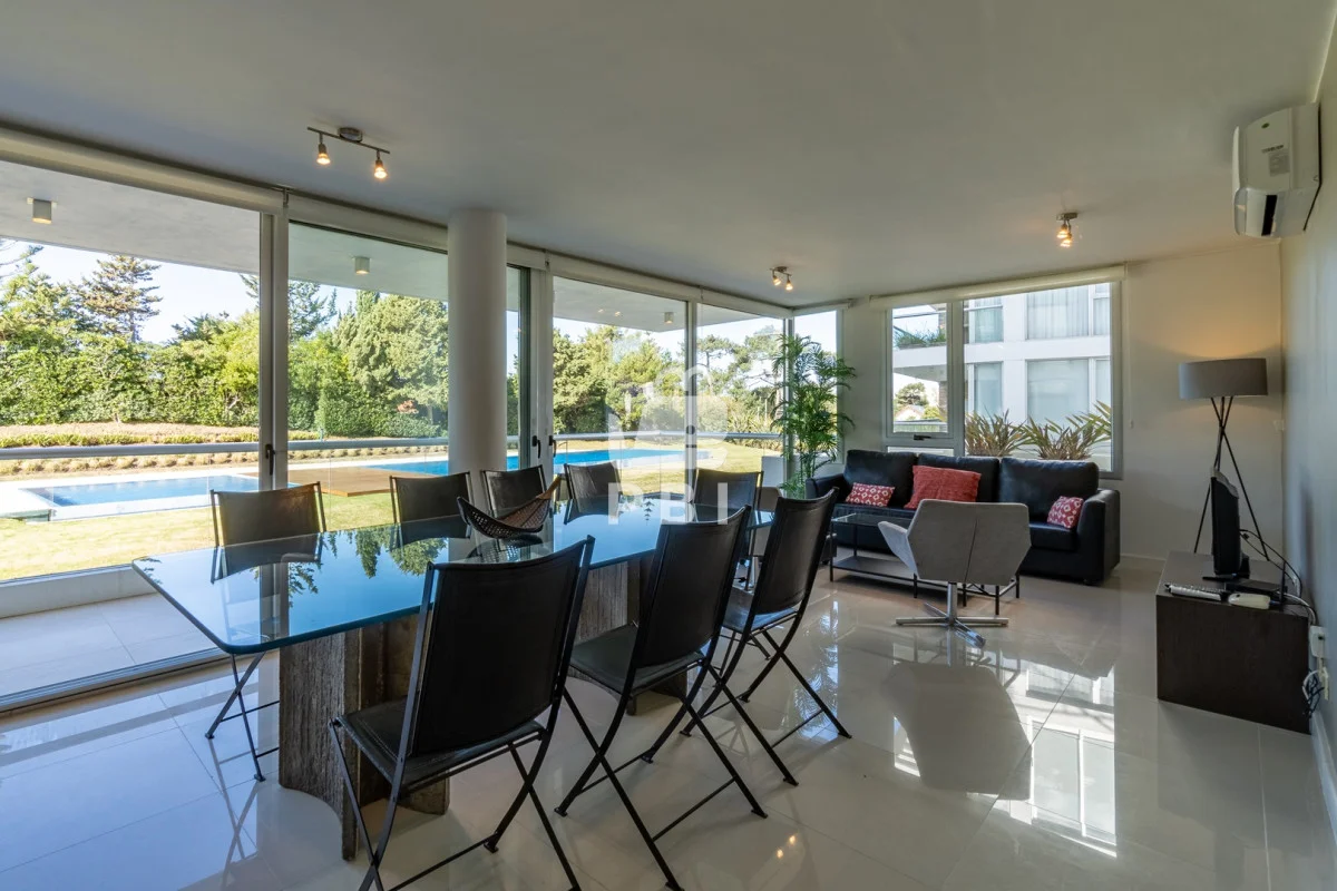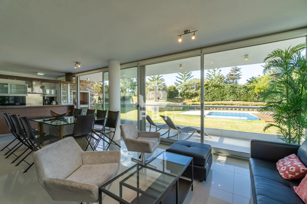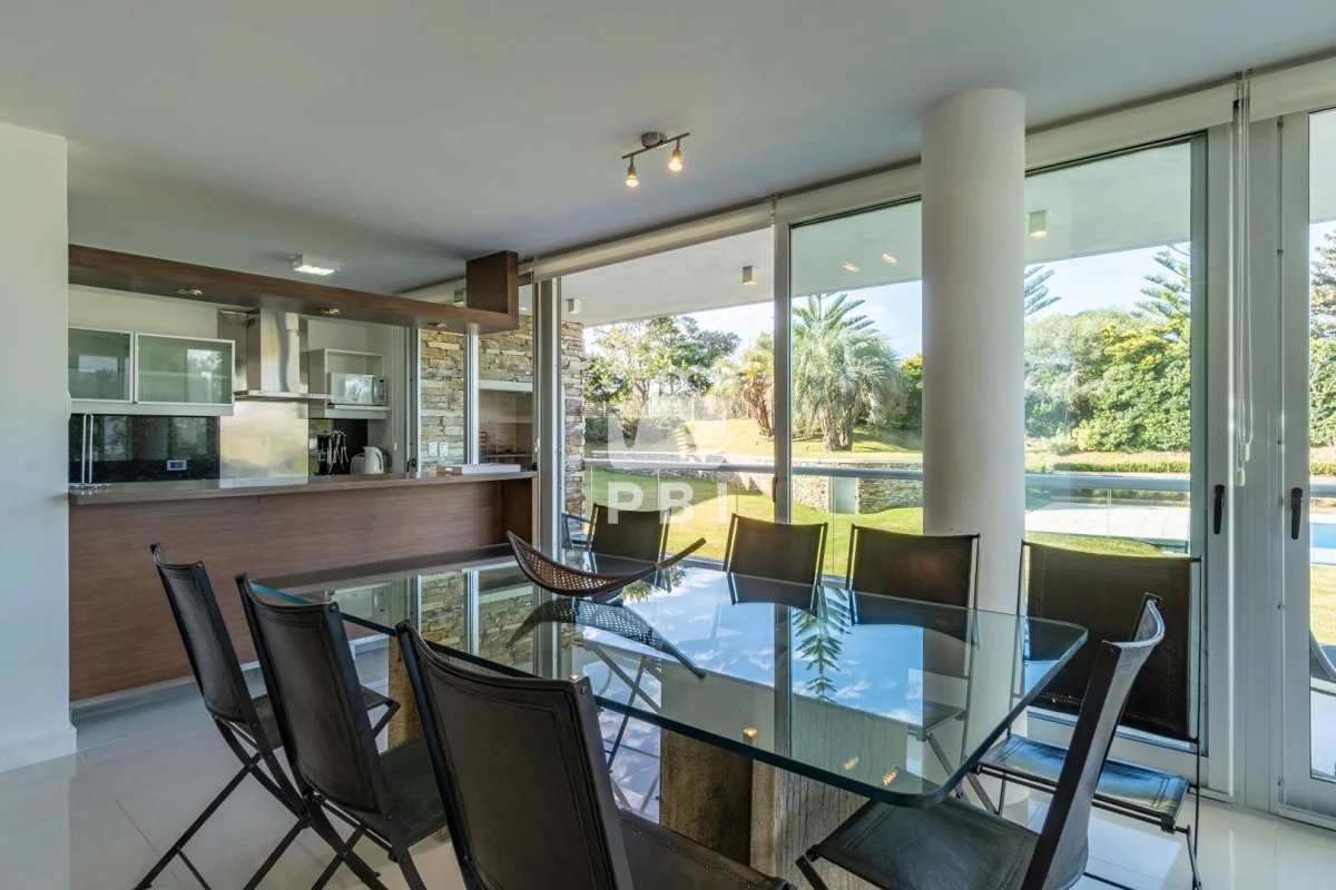 Hermoso living comedor con vista a la piscina, cocina definida con barra.