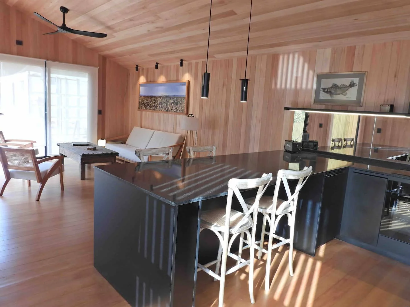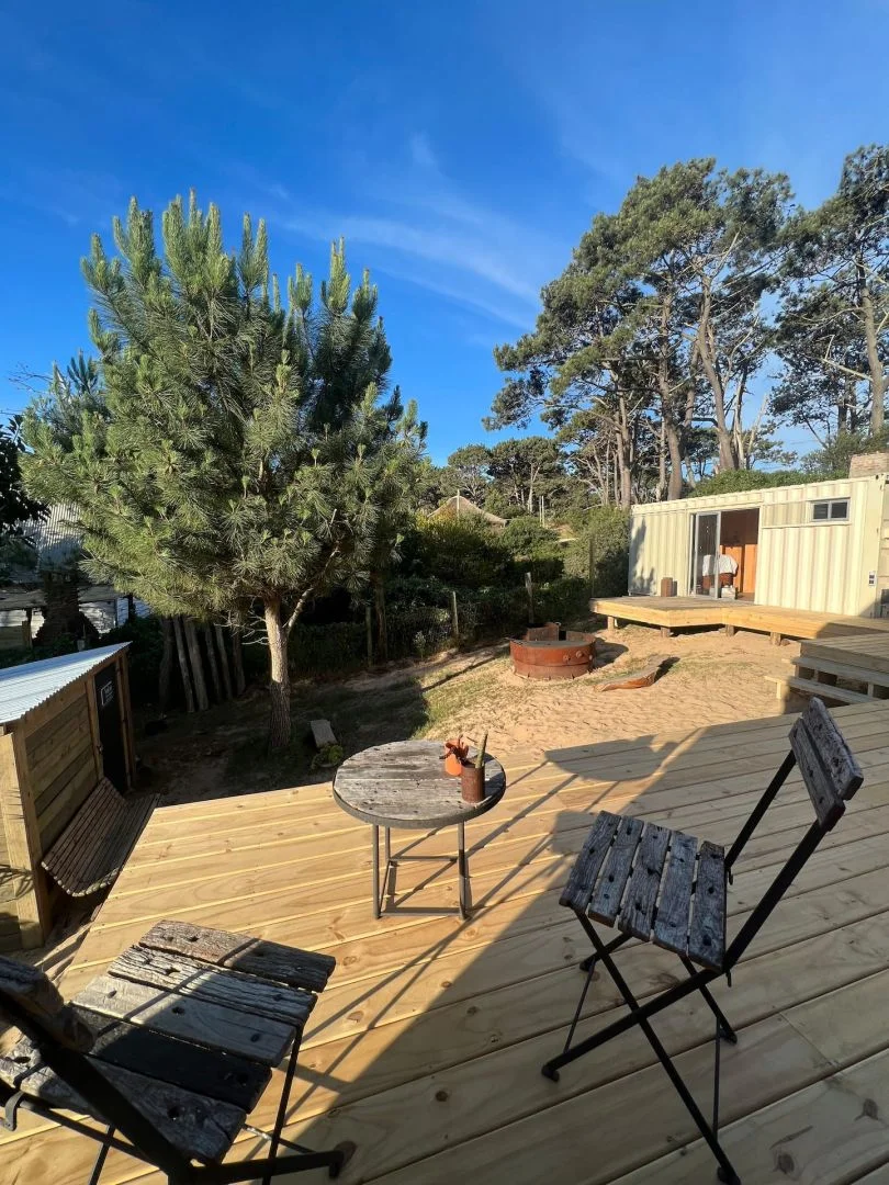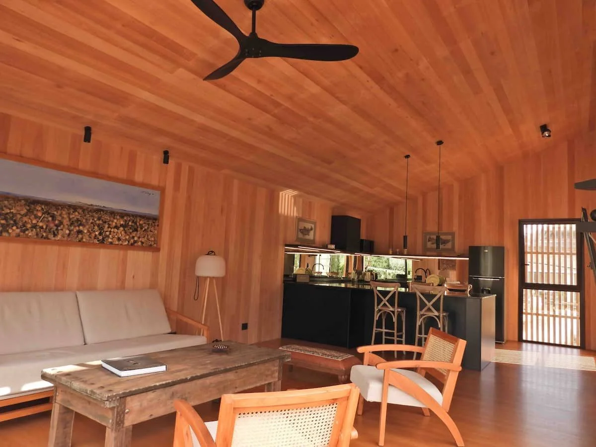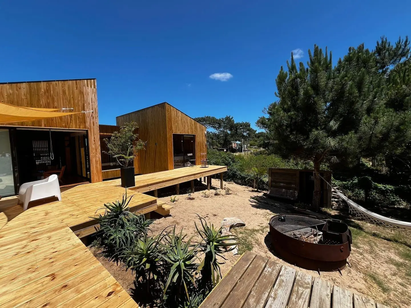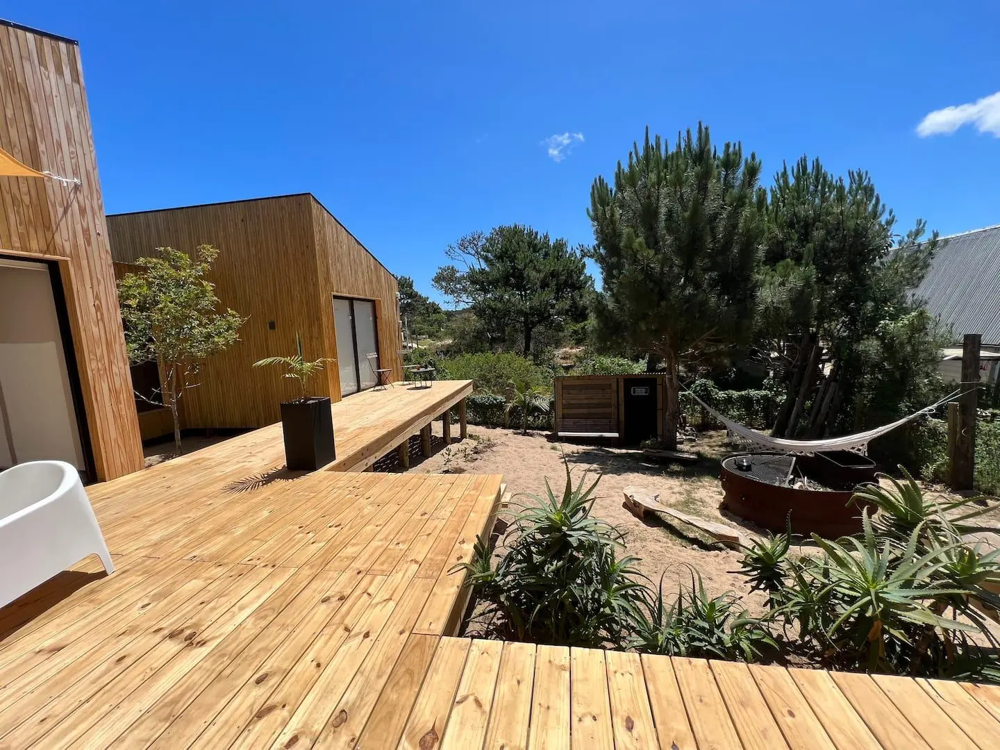 El espacio exterior es igualmente impresionante, con un extenso deck equipado con sillones exteriores, ideal para relajarse y disfrutar del entorno natural. Además, cuenta con un jardín cuidado y un fogón para hacer asados, permitiéndote disfrutar de deliciosas comidas al aire libre.