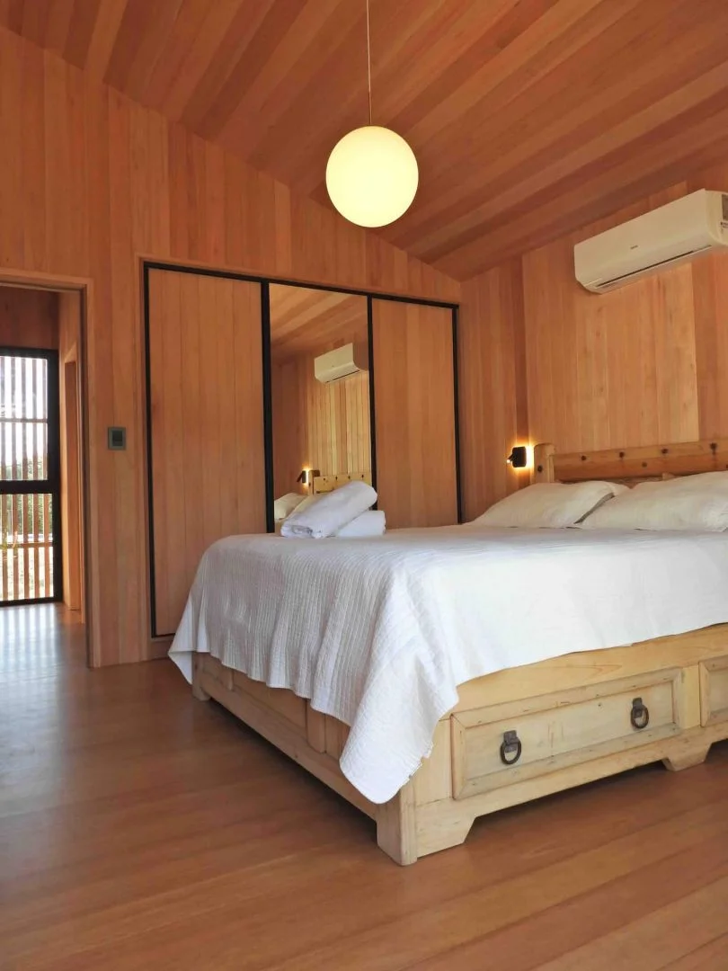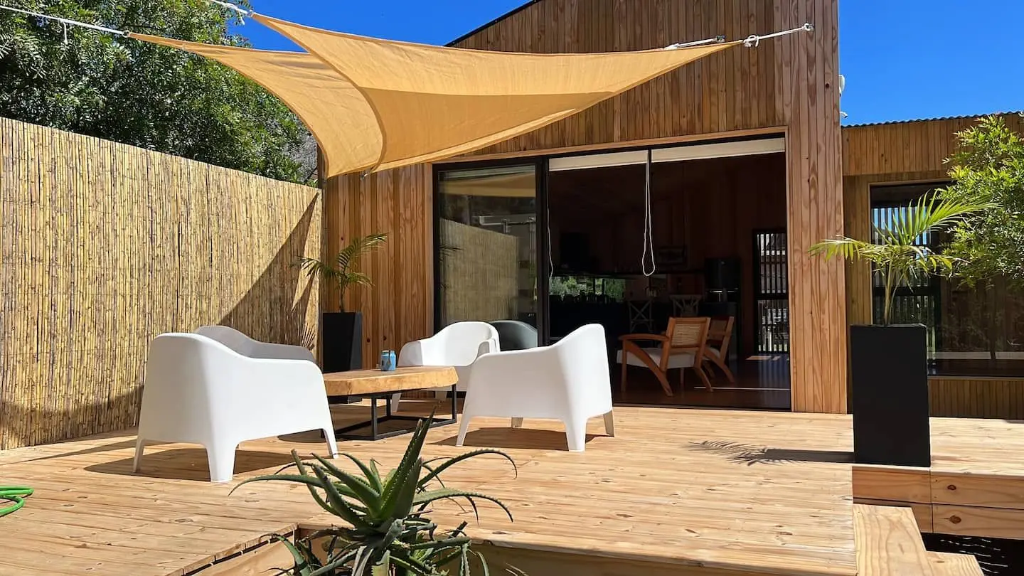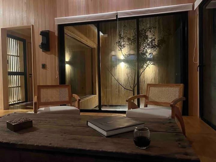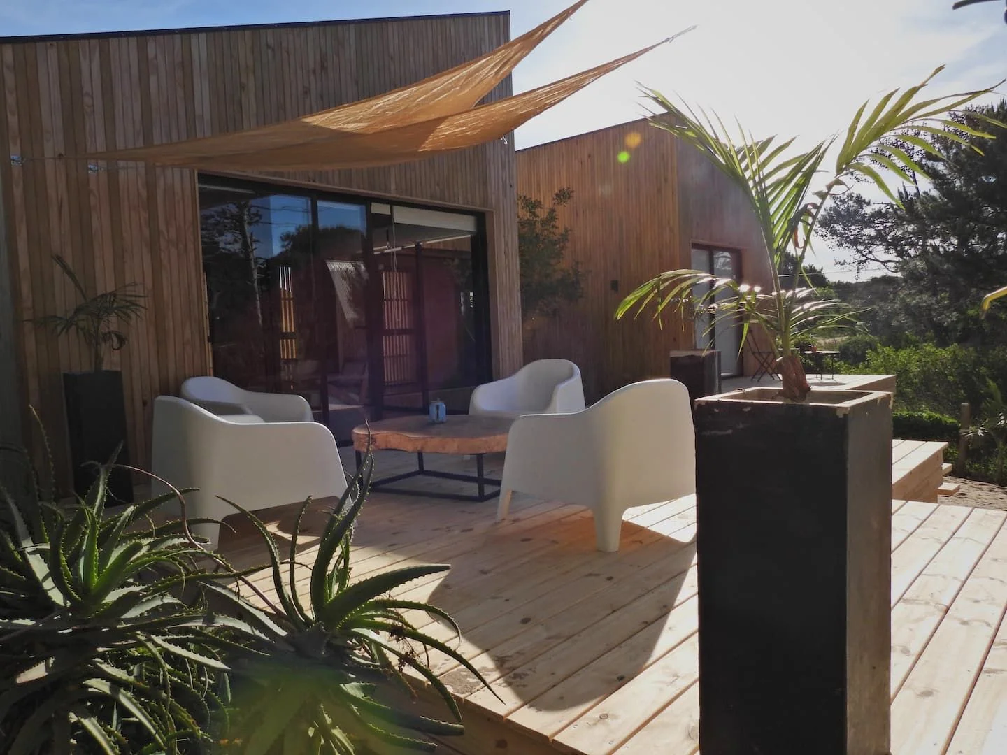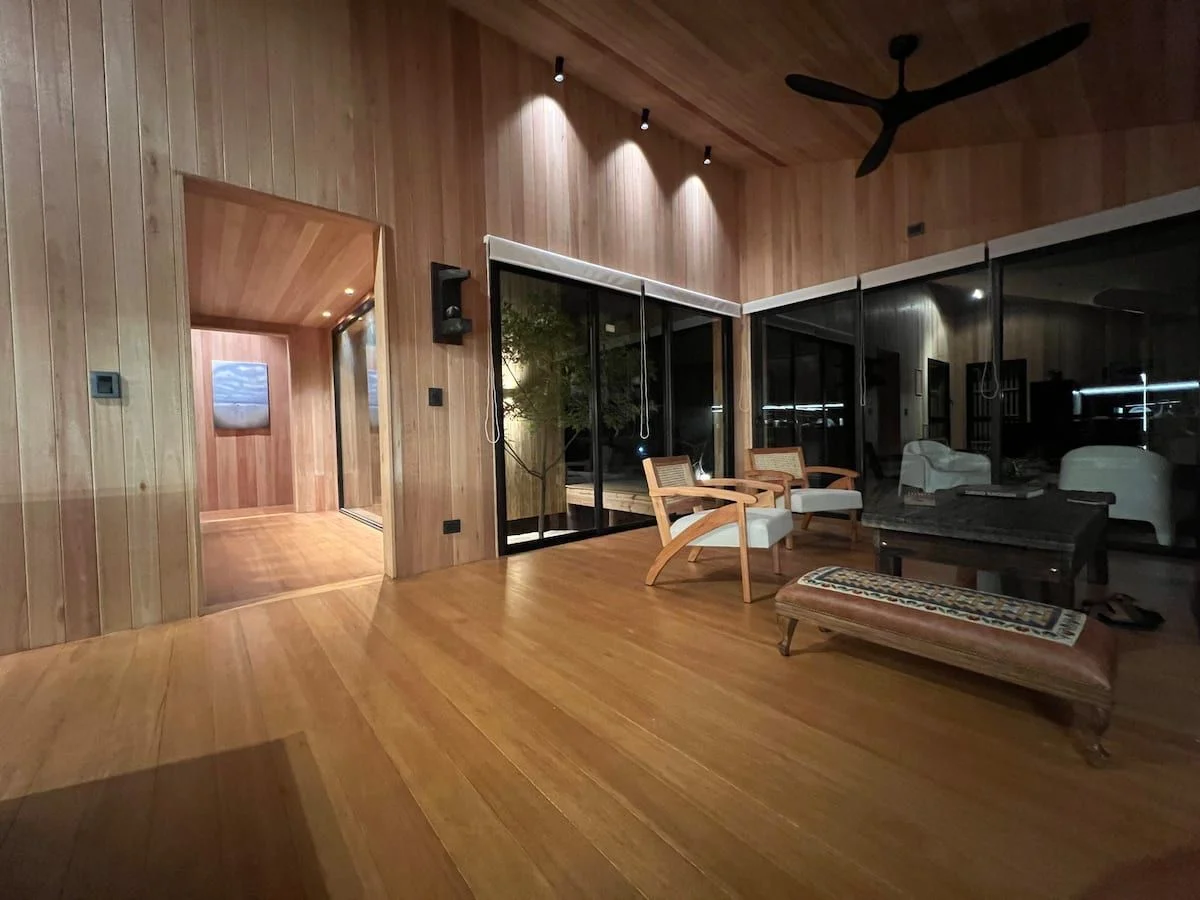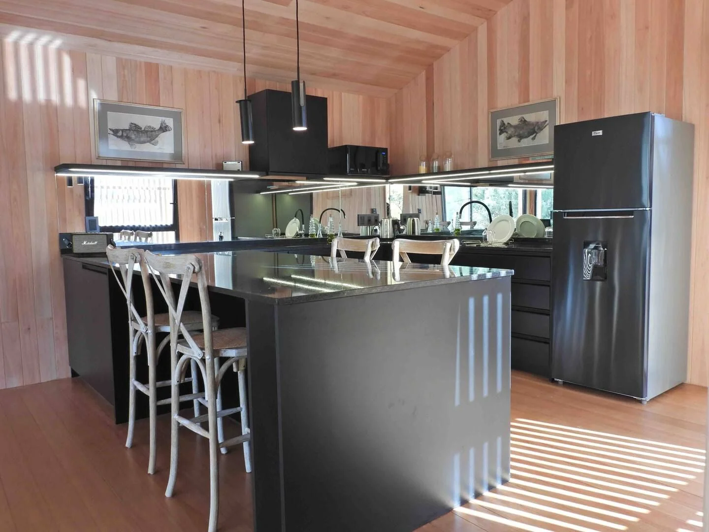 El espacio exterior es igualmente impresionante, con un extenso deck equipado con sillones exteriores, ideal para relajarse y disfrutar del entorno natural. Además, cuenta con un jardín cuidado y un fogón para hacer asados, permitiéndote disfrutar de deliciosas comidas al aire libre.