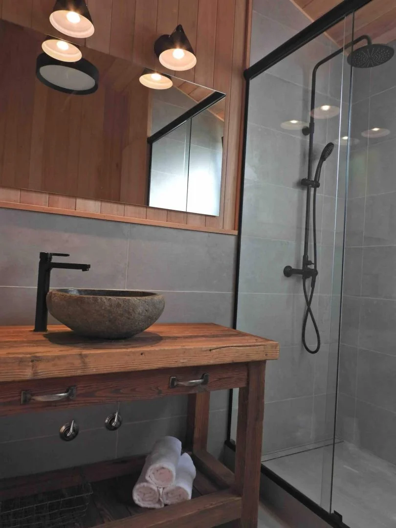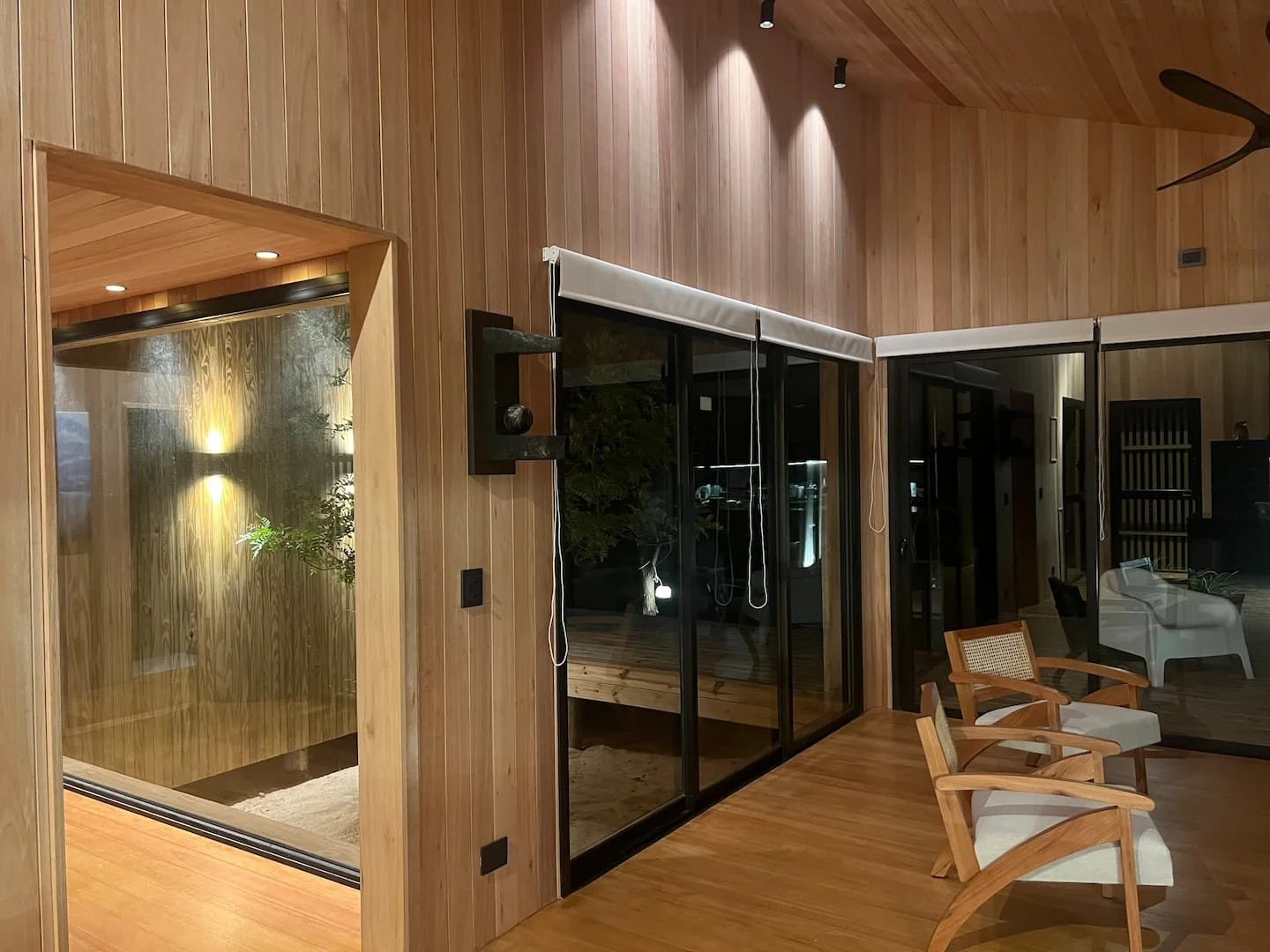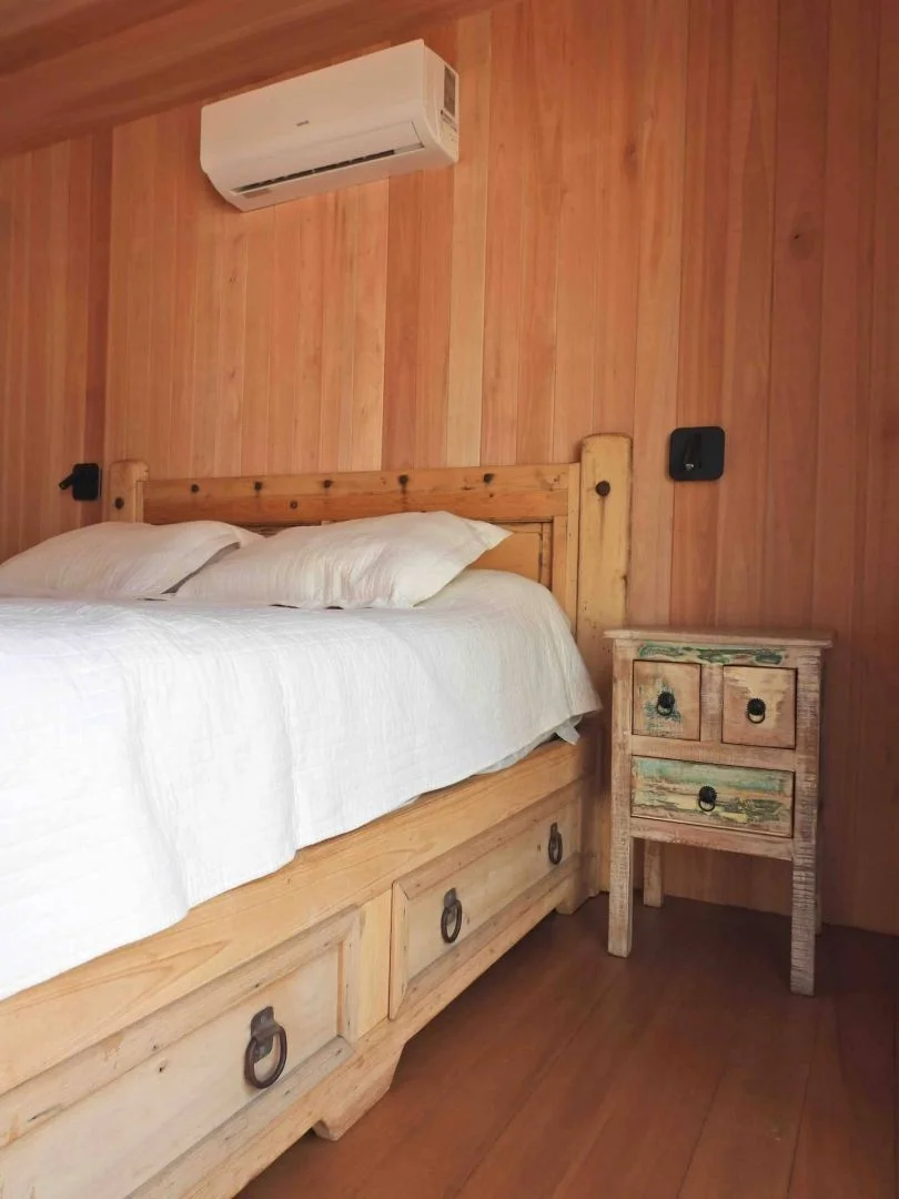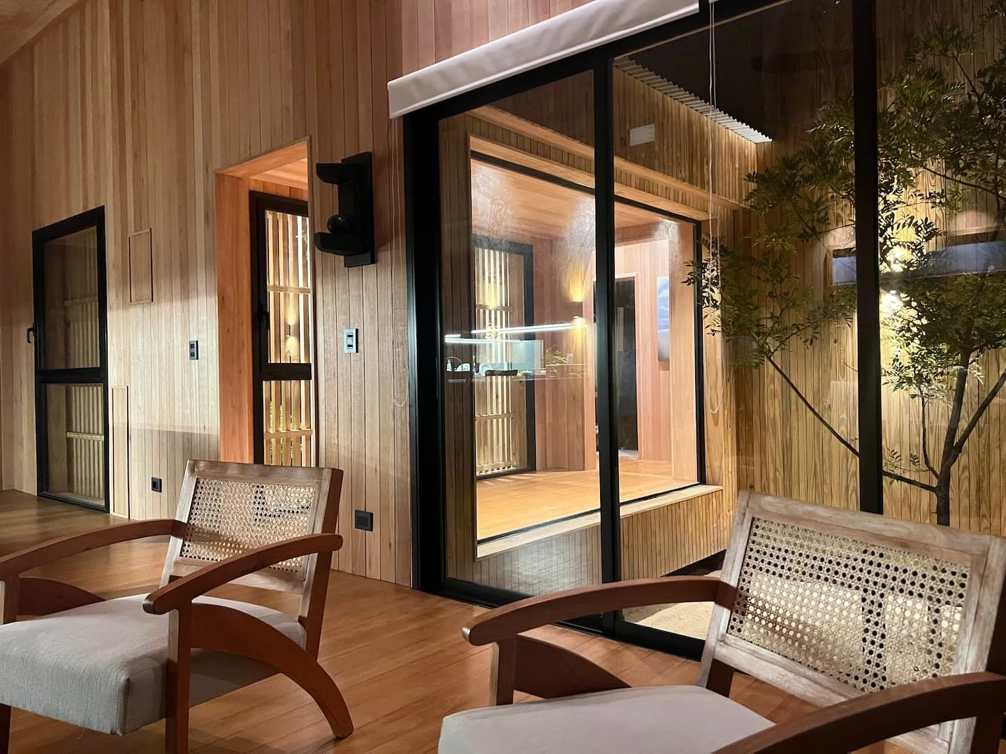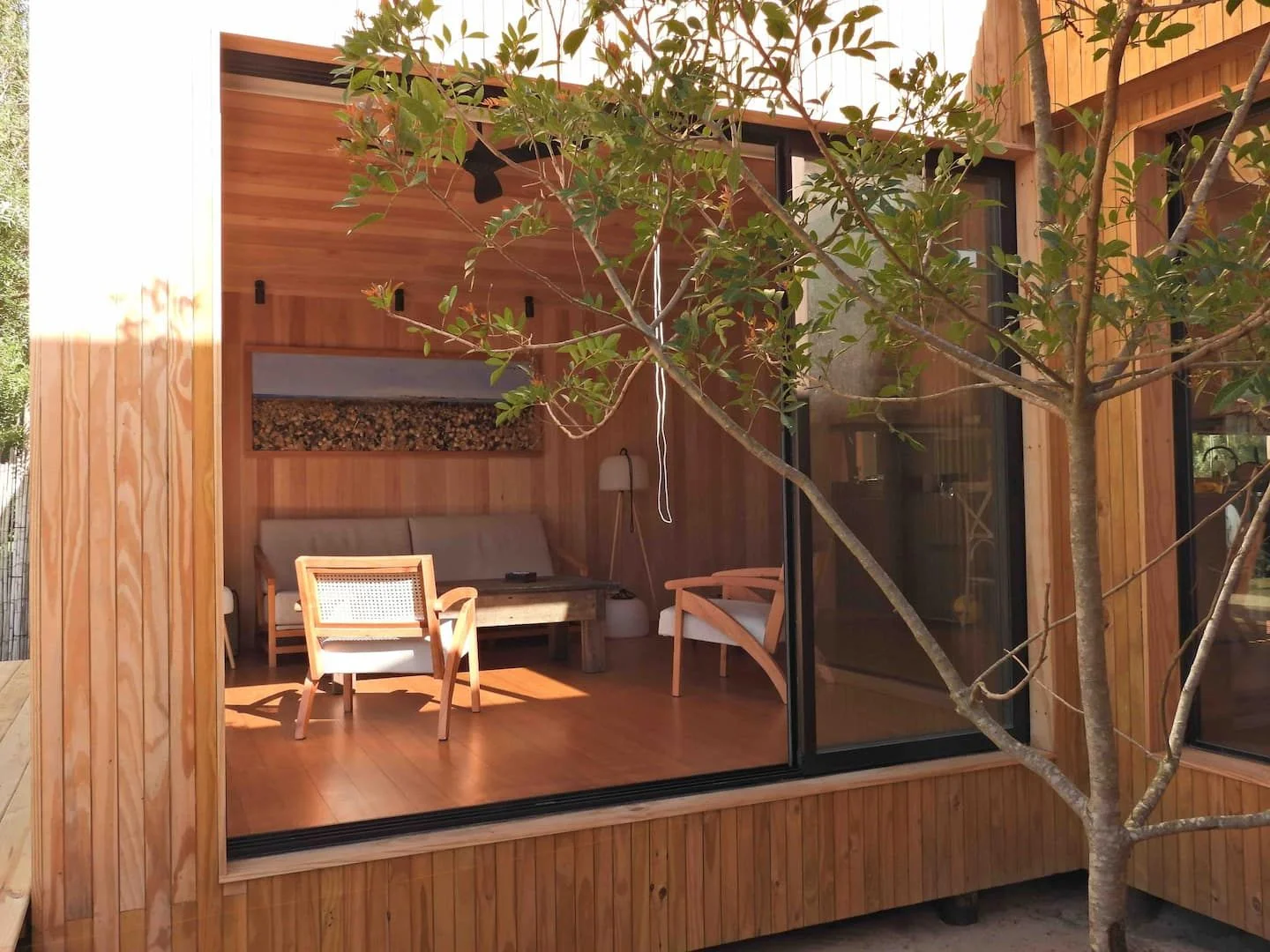 El espacio exterior es igualmente impresionante, con un extenso deck equipado con sillones exteriores, ideal para relajarse y disfrutar del entorno natural. Además, cuenta con un jardín cuidado y un fogón para hacer asados, permitiéndote disfrutar de deliciosas comidas al aire libre.