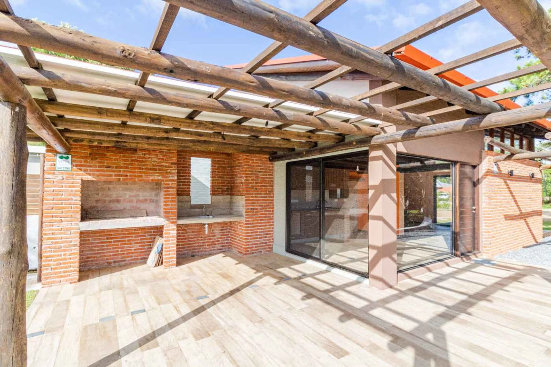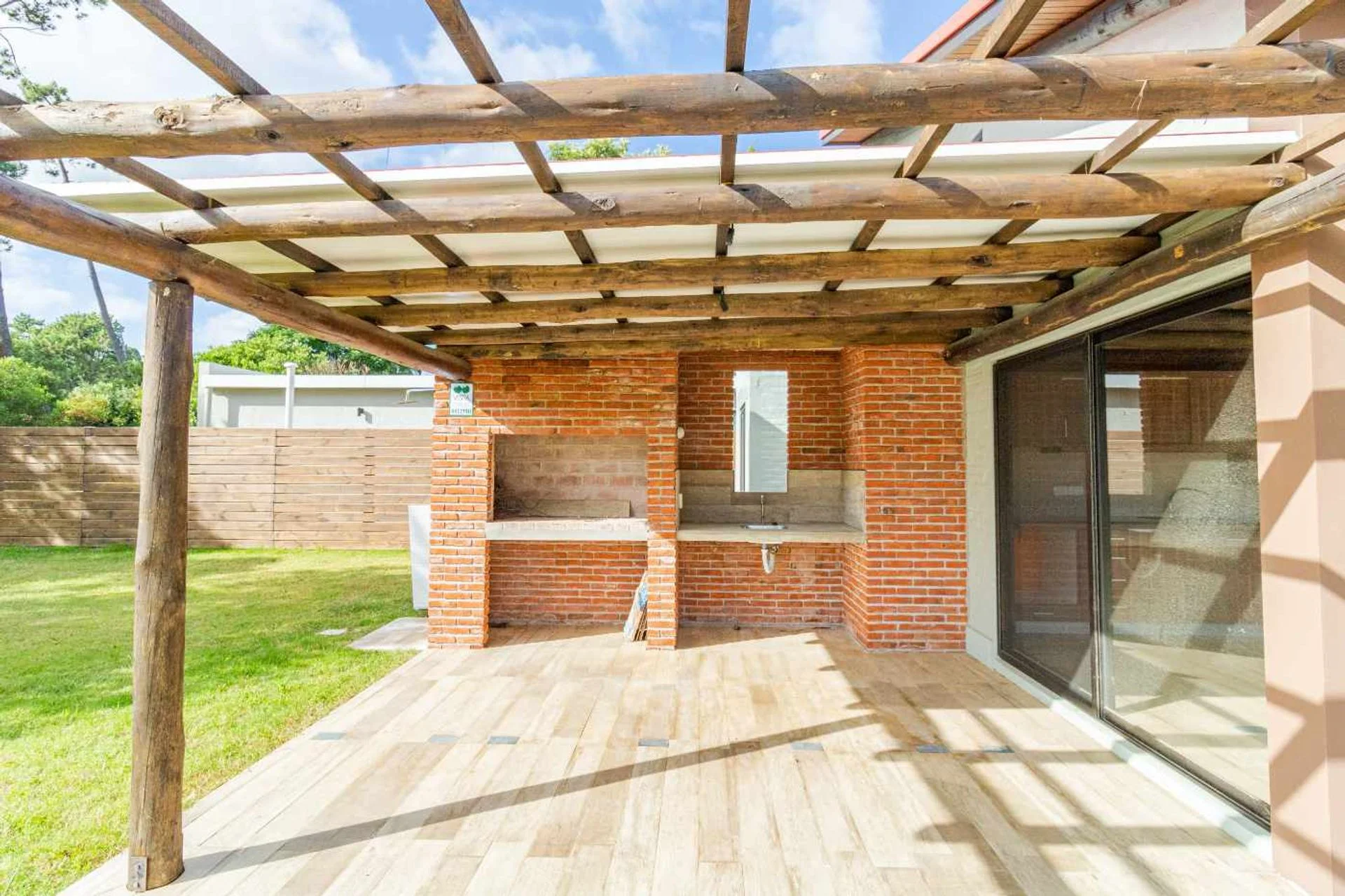 Parrillero ubicado bajo pérgola de madera, ideal para disfrutar al aire libre.