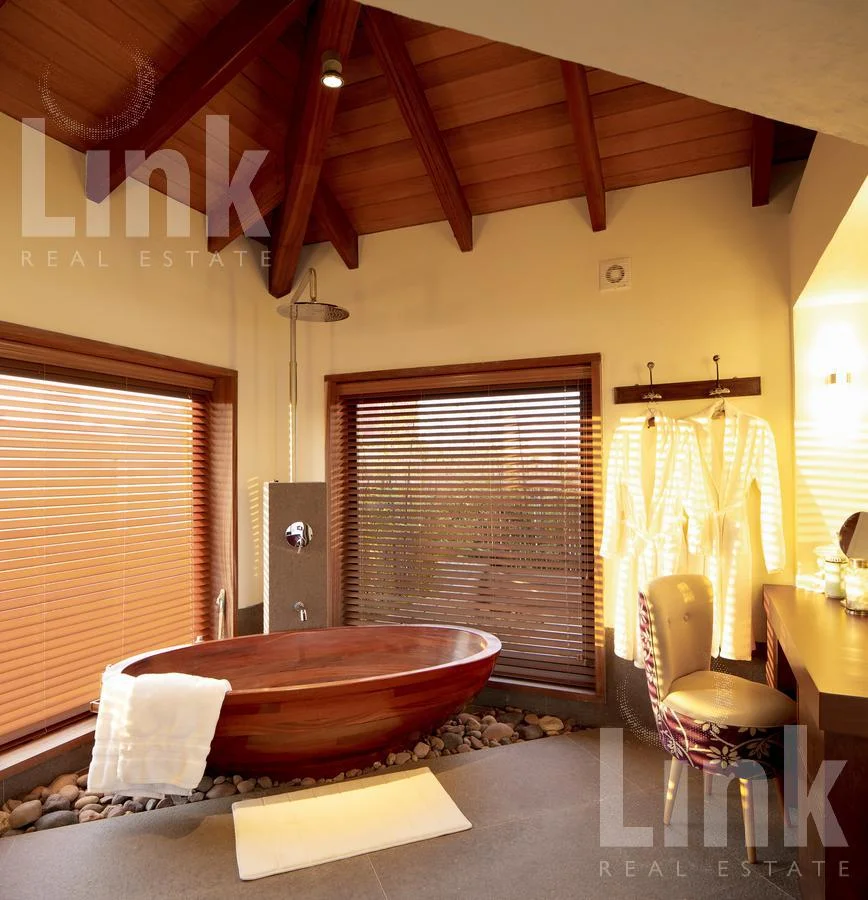 El segundo bloque contiene la suite principal, y una biblioteca. En el baño destaca la espectacular bañera de madera tallada en una sola pieza.