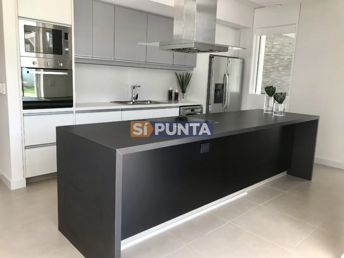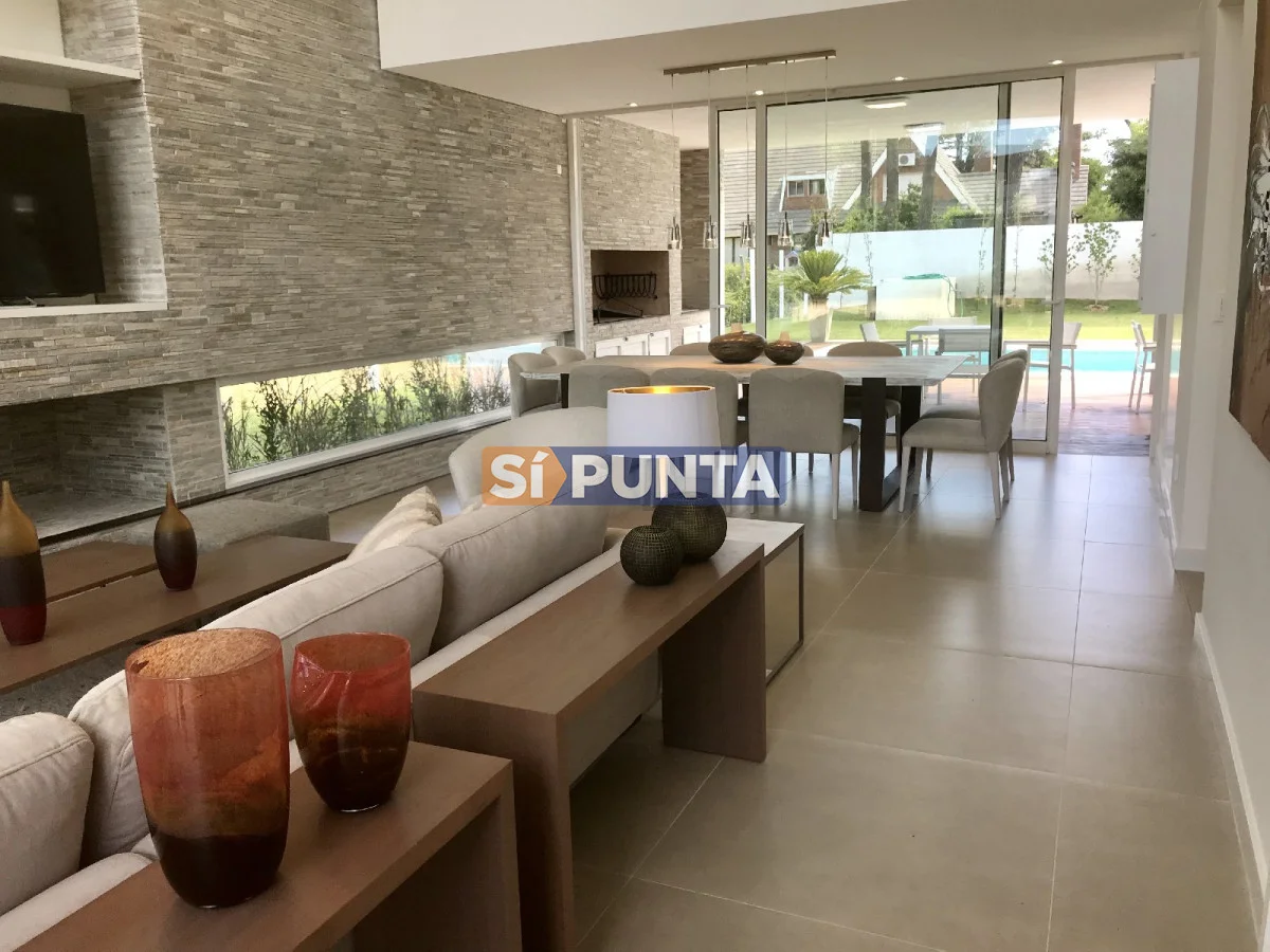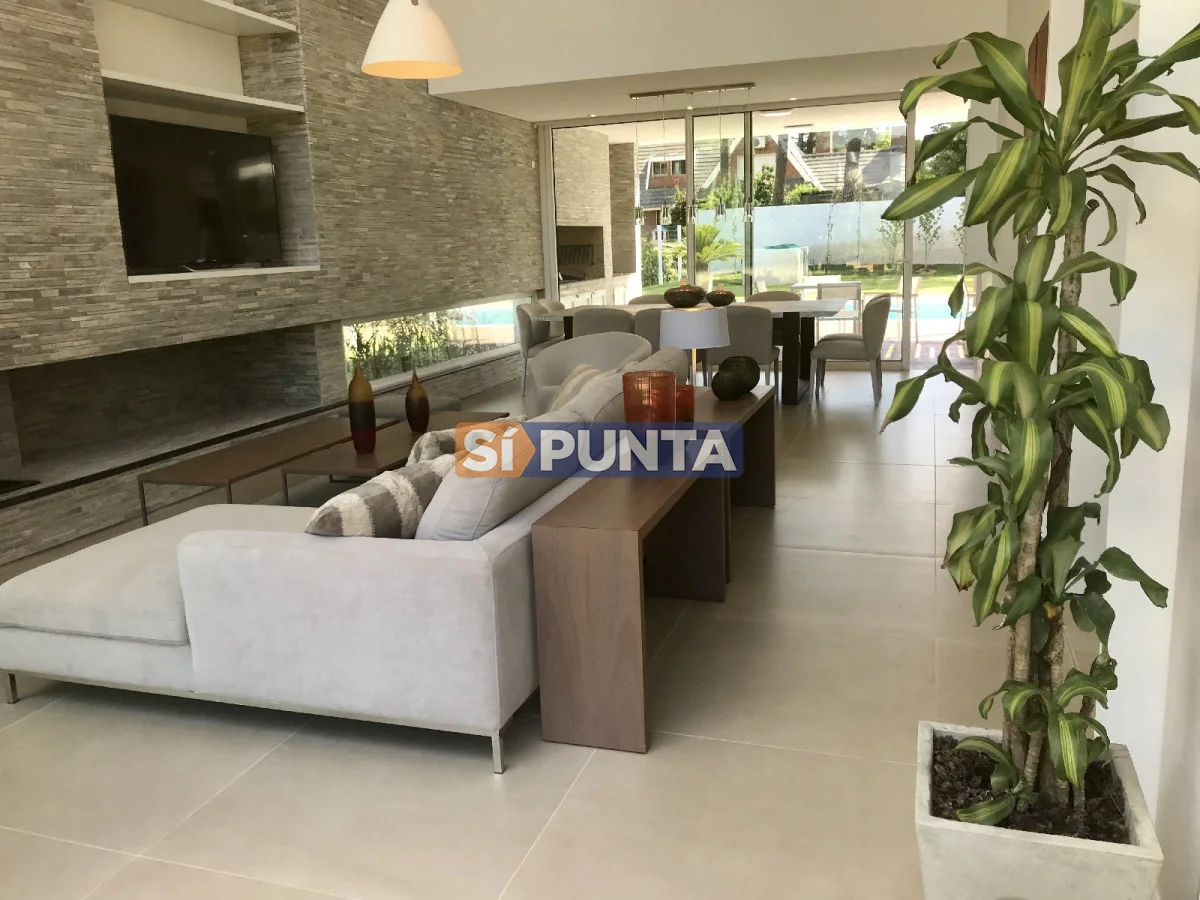 Hermosa casa ubicada dentro de exclusivo barrio privado de Punta del Este. Diseño elegante y moderno desarrollado en dos niveles. Se implanta en un predio de 880 m2 donde predomina un entorno verde y tranquilo. Parrillero techado, pérgola exterior y solárium, piscina climatizada. Comodidades: - Living - Estufa a leña - Comedor - Cocina - 4 Dormitorios (4 suites) - 4 Baños - Dependencia de servicio - Hermoso jardín - Piscina climatizada - Parrillero techado - Garaje para 2 autos Referencia Interna : Tera-2677