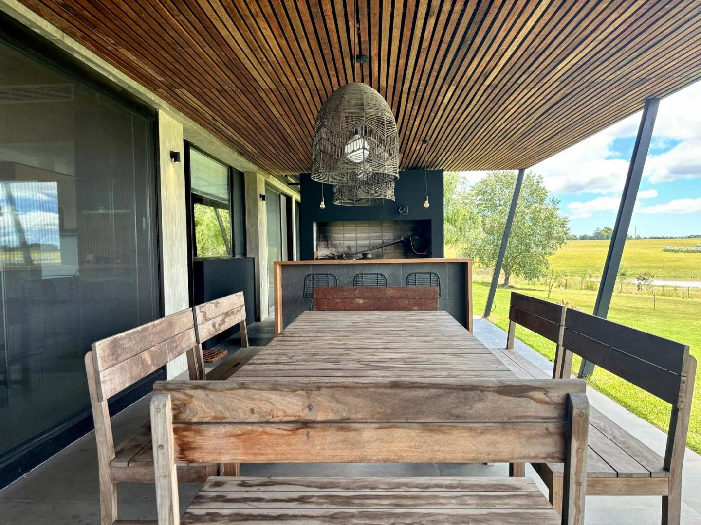 Gran area de barbacoa con barra, living y comedor exterior que se abre hacia la piscina climatizada.