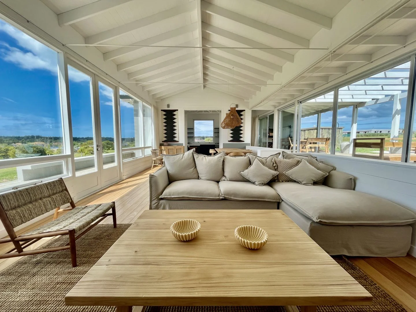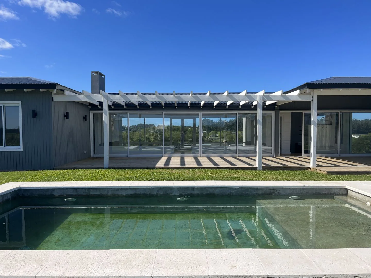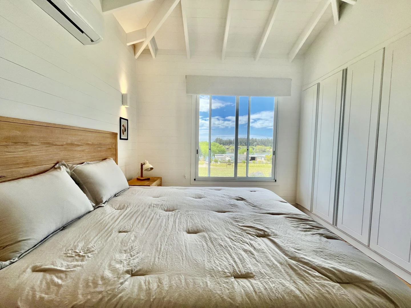 En Pueblo Mio, sobre un lote con gran altura en el centro del barrio con vistas hacia el este y la laguna principal del barrio, una casa a estrenar, construida con un estilo arquitectónico tendencioso en la zona y el barrio, de madera y con techos de cuatro aguas