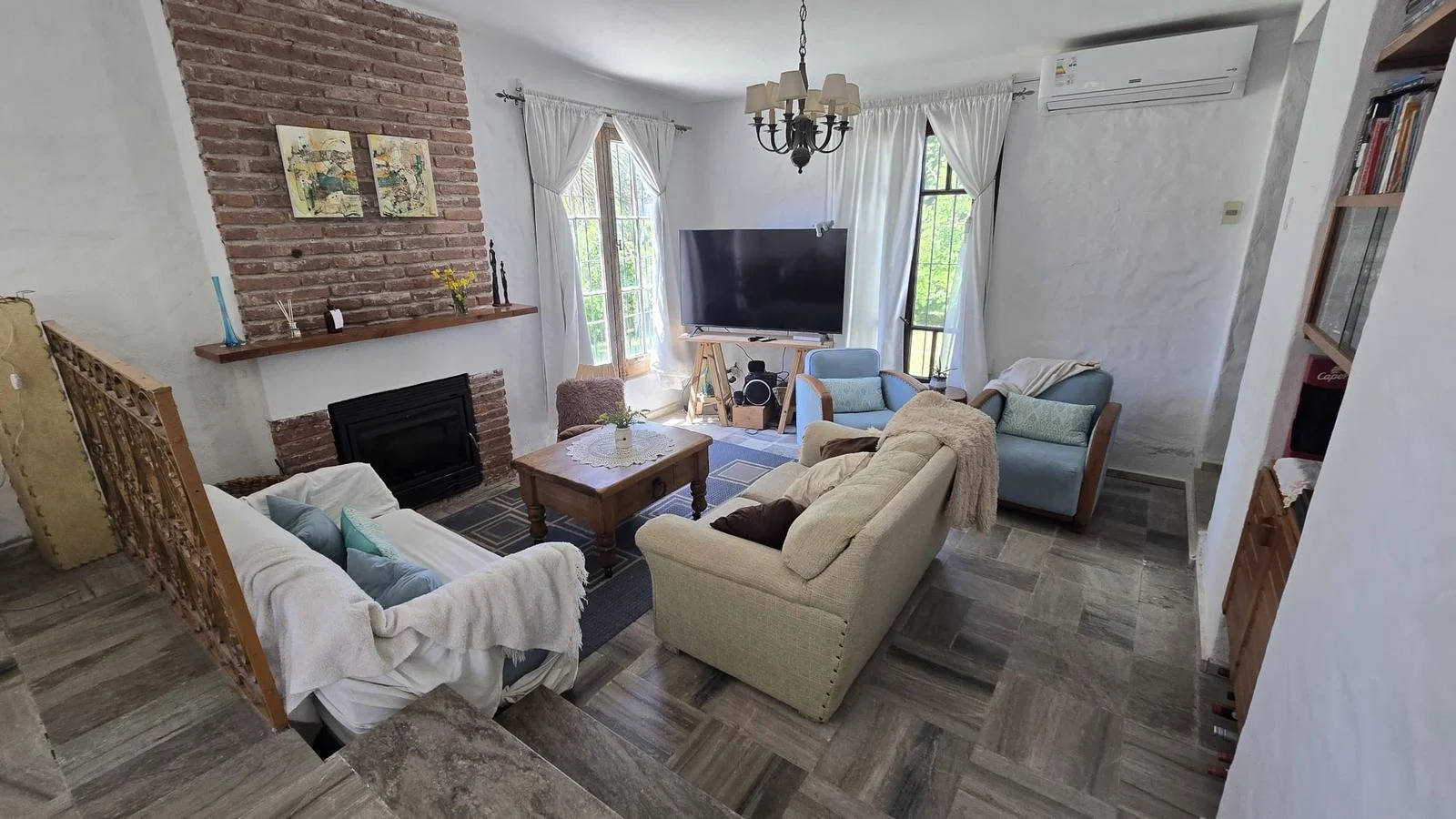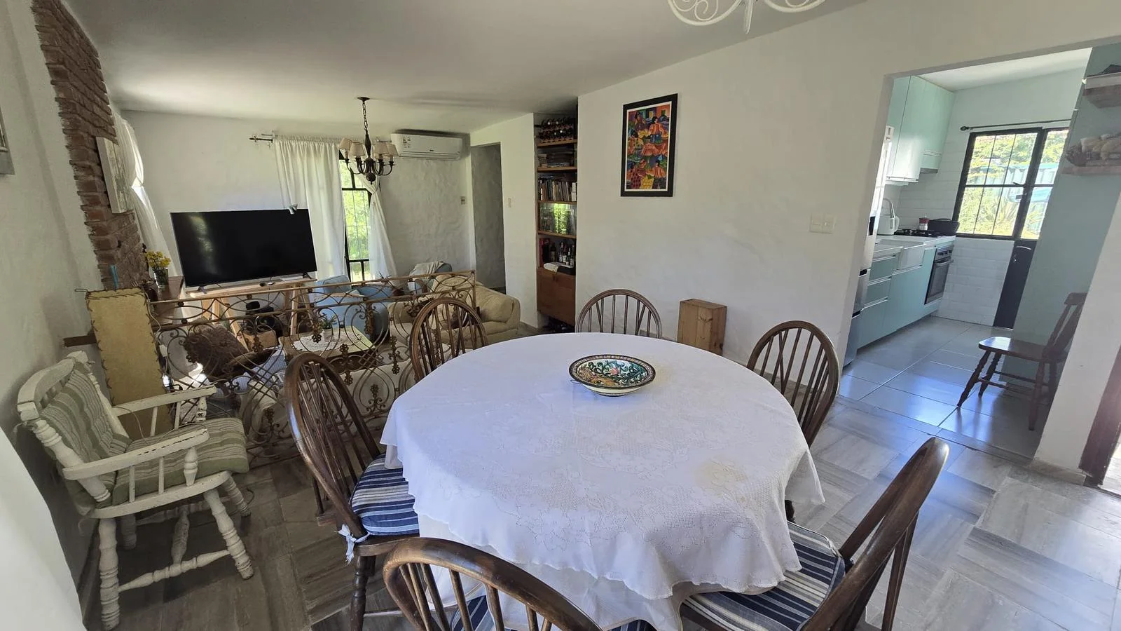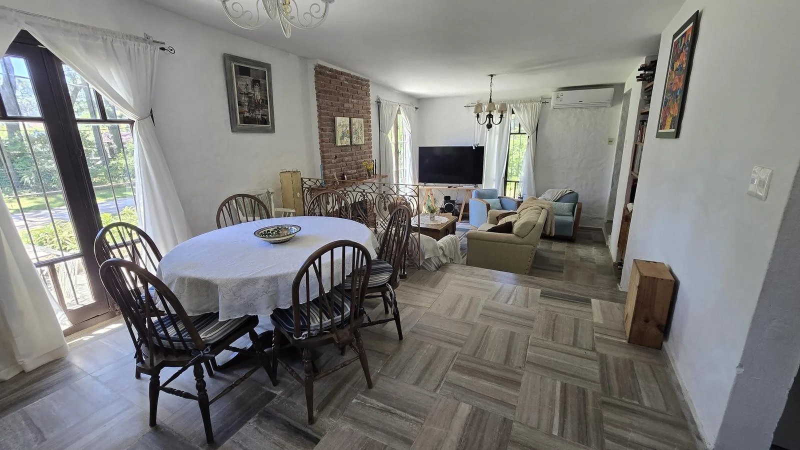 La casa se desarrolla en una sola planta. Cuenta con un amplio y luminoso living comedor con estufa a leña y aire acondicionado.