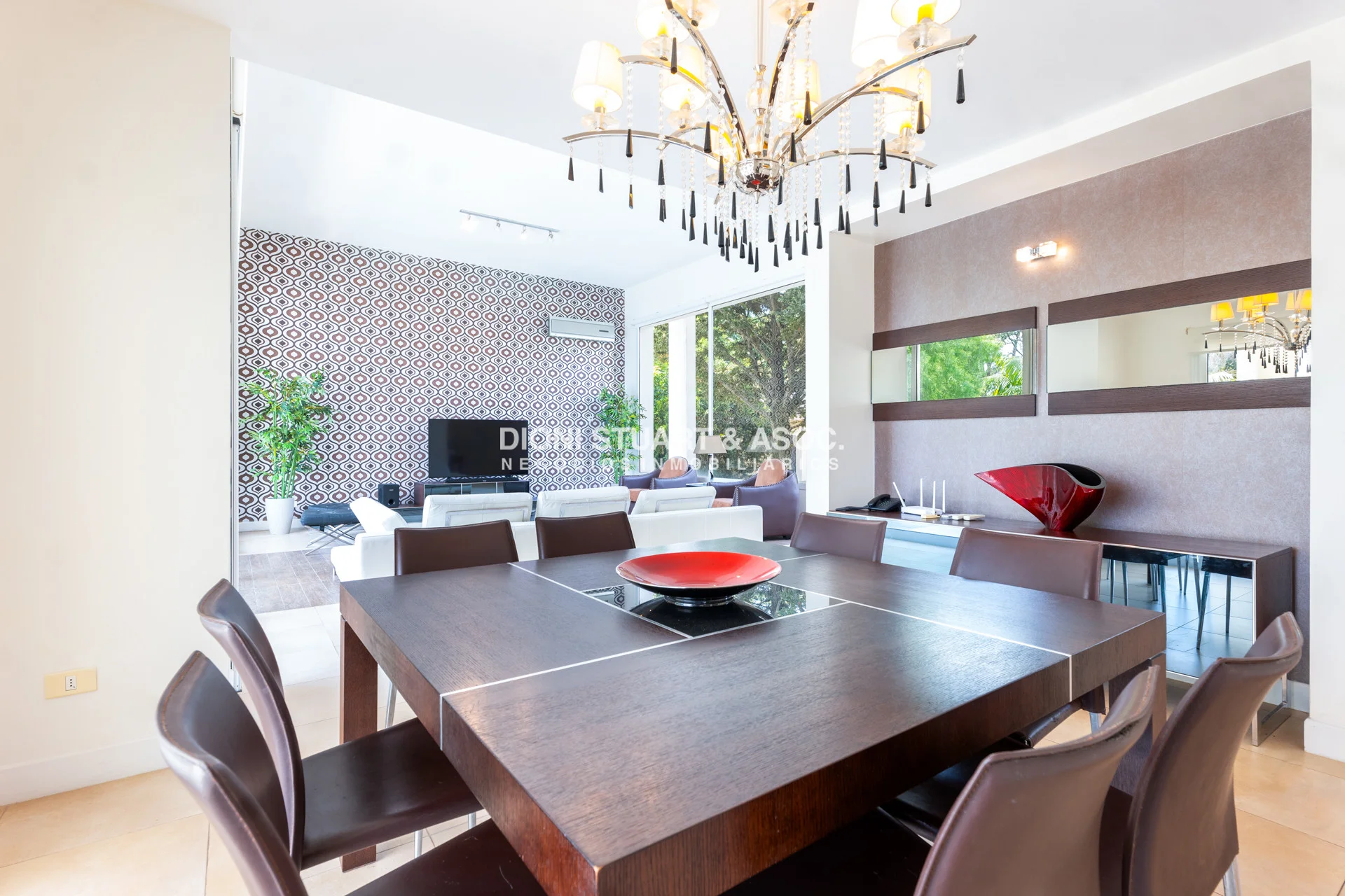 La casa en si se divide en dos plantas, obteniendo asi en planta baja un amplio living-comedor, un dormitorio en suite con placar empotrado, toilette y una comoda cocina con comedor diario, lavadero y dependencia con baño. En el segundo piso la casa cuenta con tres dormitorios en suite todos con terraza, y el principal con hiromasaje en el baño y vestidor walk-in. Todos los ambientes cuentan con aire acondicionado y loza radiante sectorizada. Cuenta con piscina climatizada.