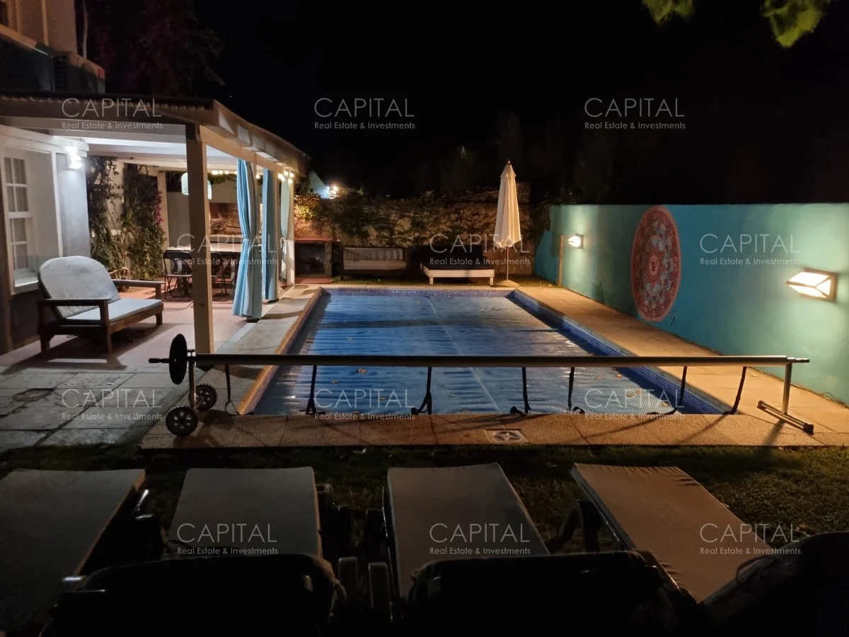 En el exterior, se destaca una gran piscina climatizada, con manta térmica y opción de cerco removible, rodeada de solárium y un parrillero techado con policarbonato, ideal para encuentros al aire libre.