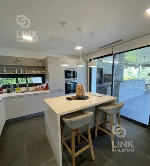 En planta baja encontramos el ingreso principal, la cocina, con posibilidad de permanecer cerrada y un amplio living, ambos con salida al parrillero, jardín y pileta.