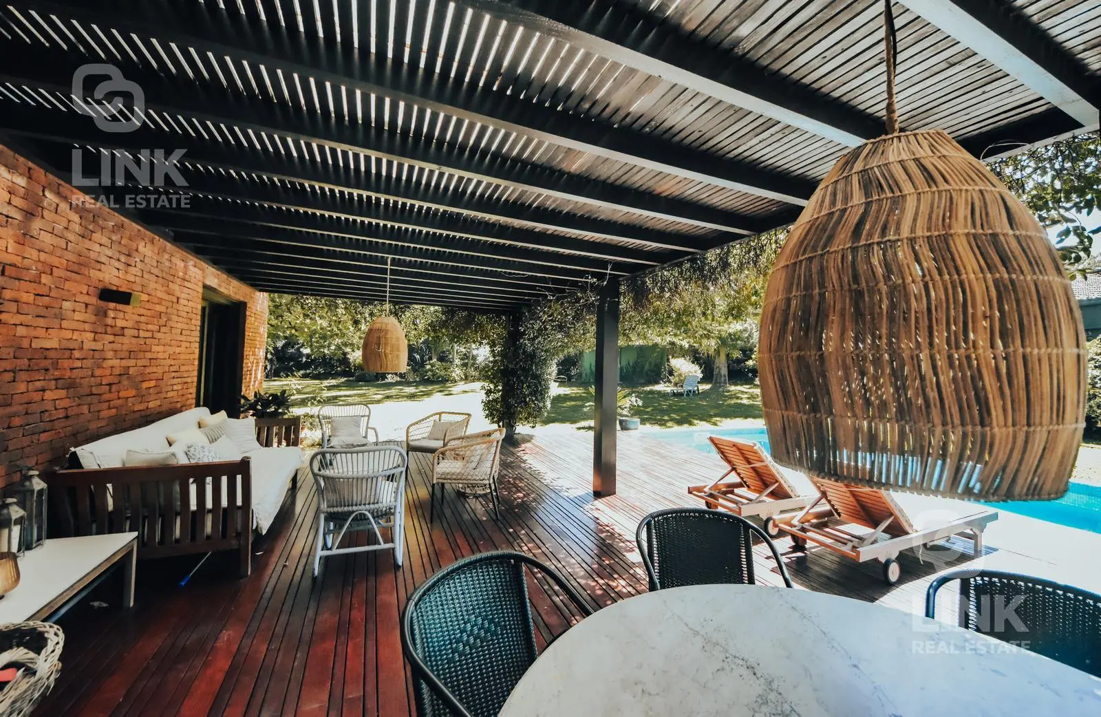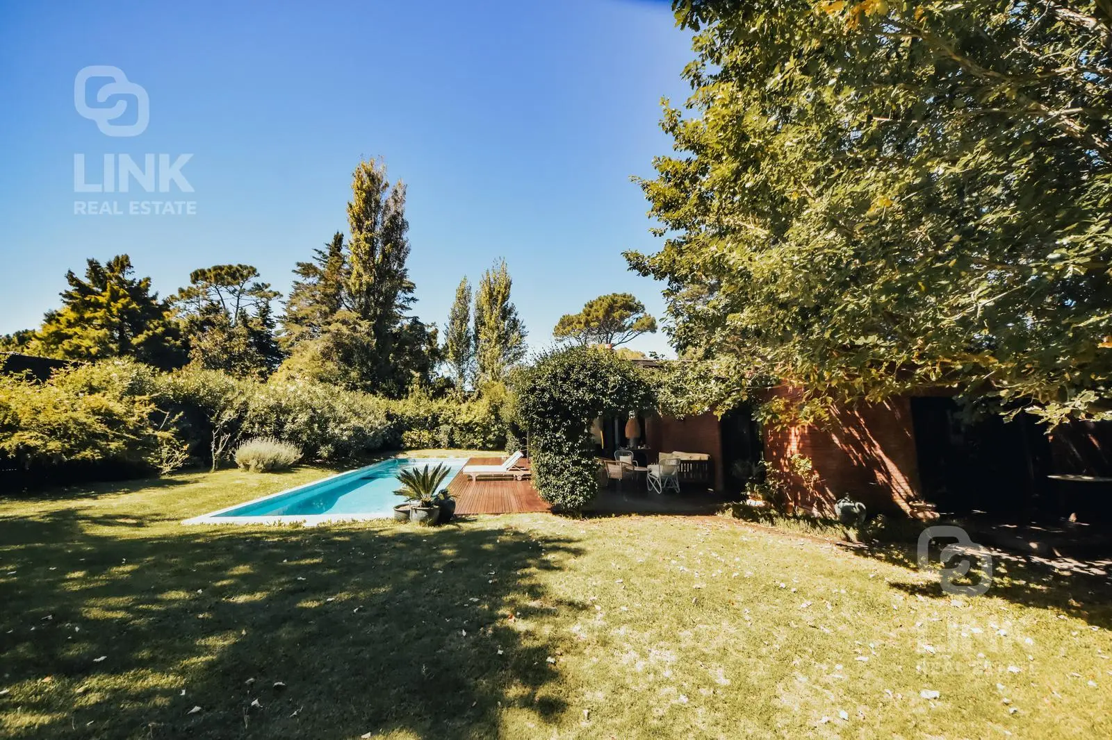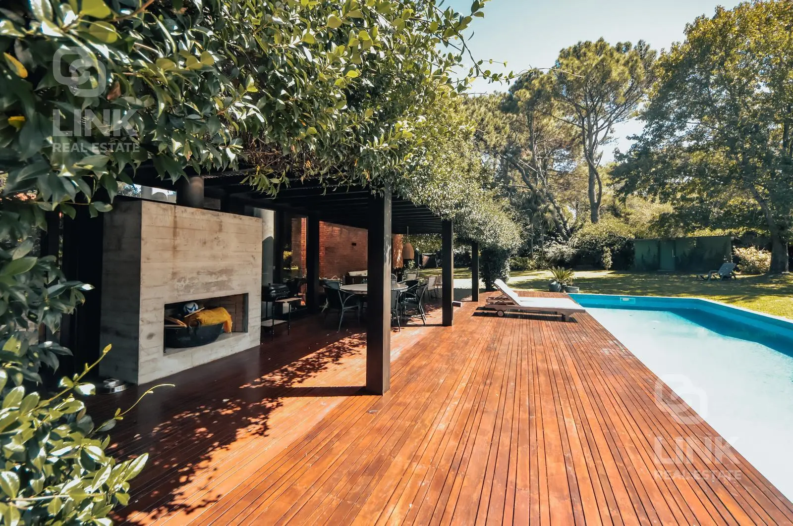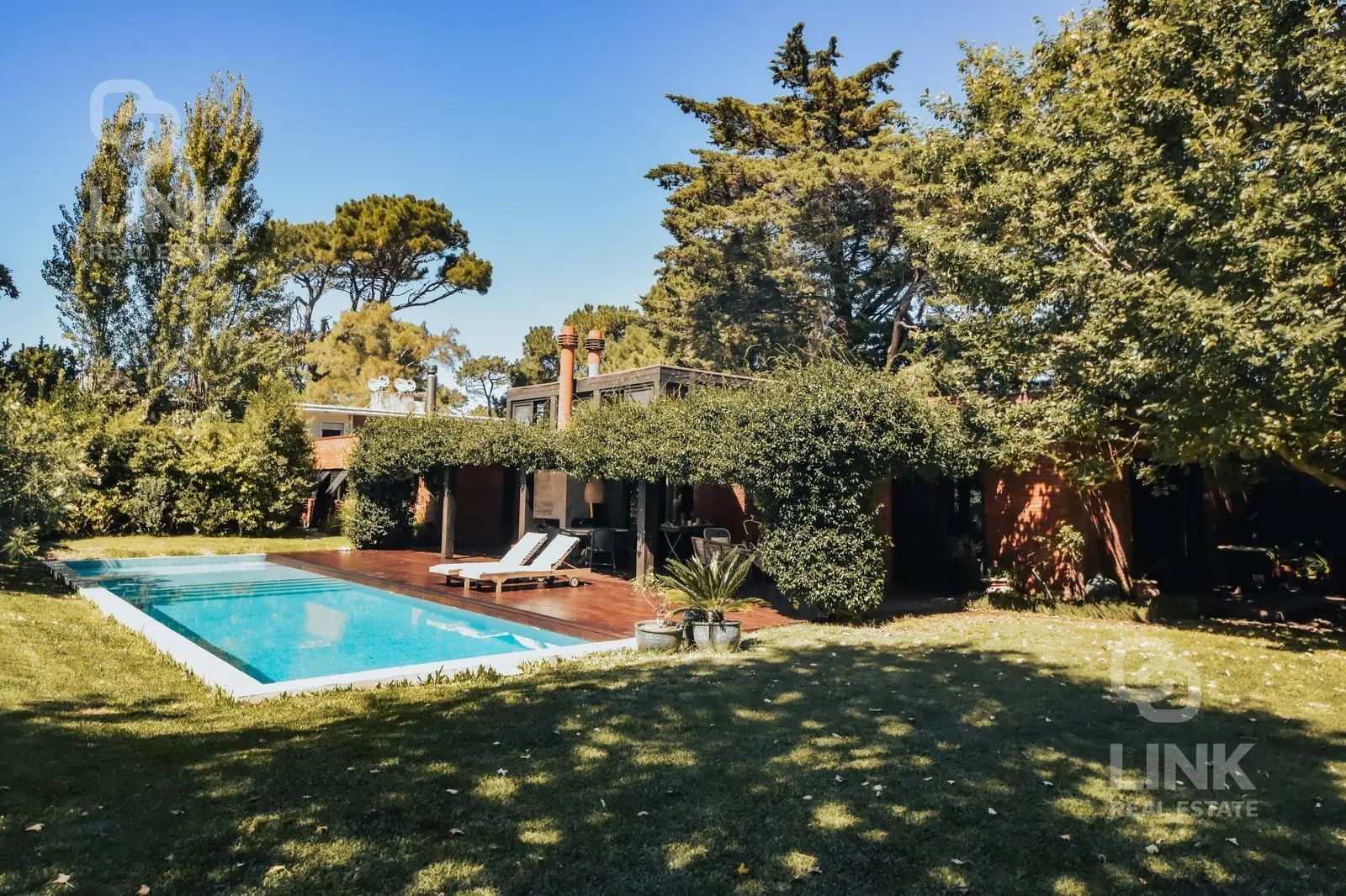 En el exterior, piscina recientemente construida y deck se integran de forma armónica con el jardín, creando un entorno ideal para el relax.