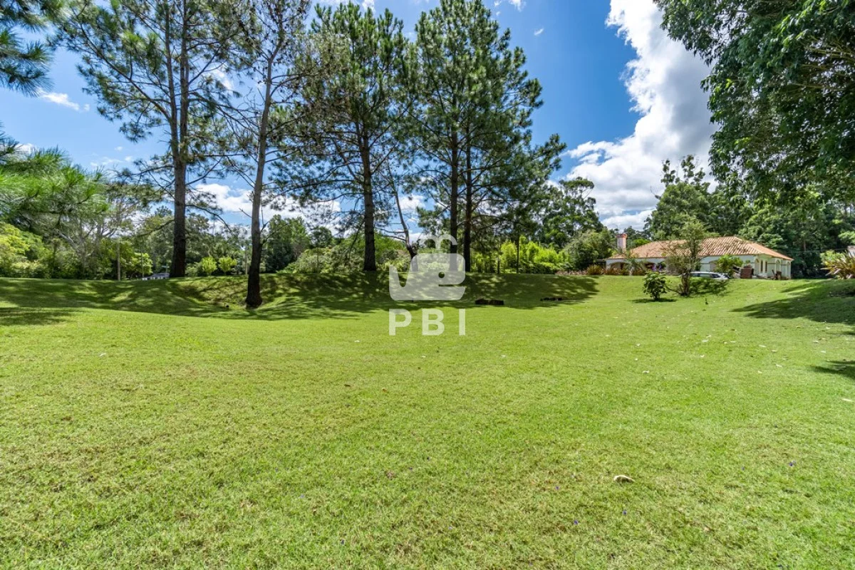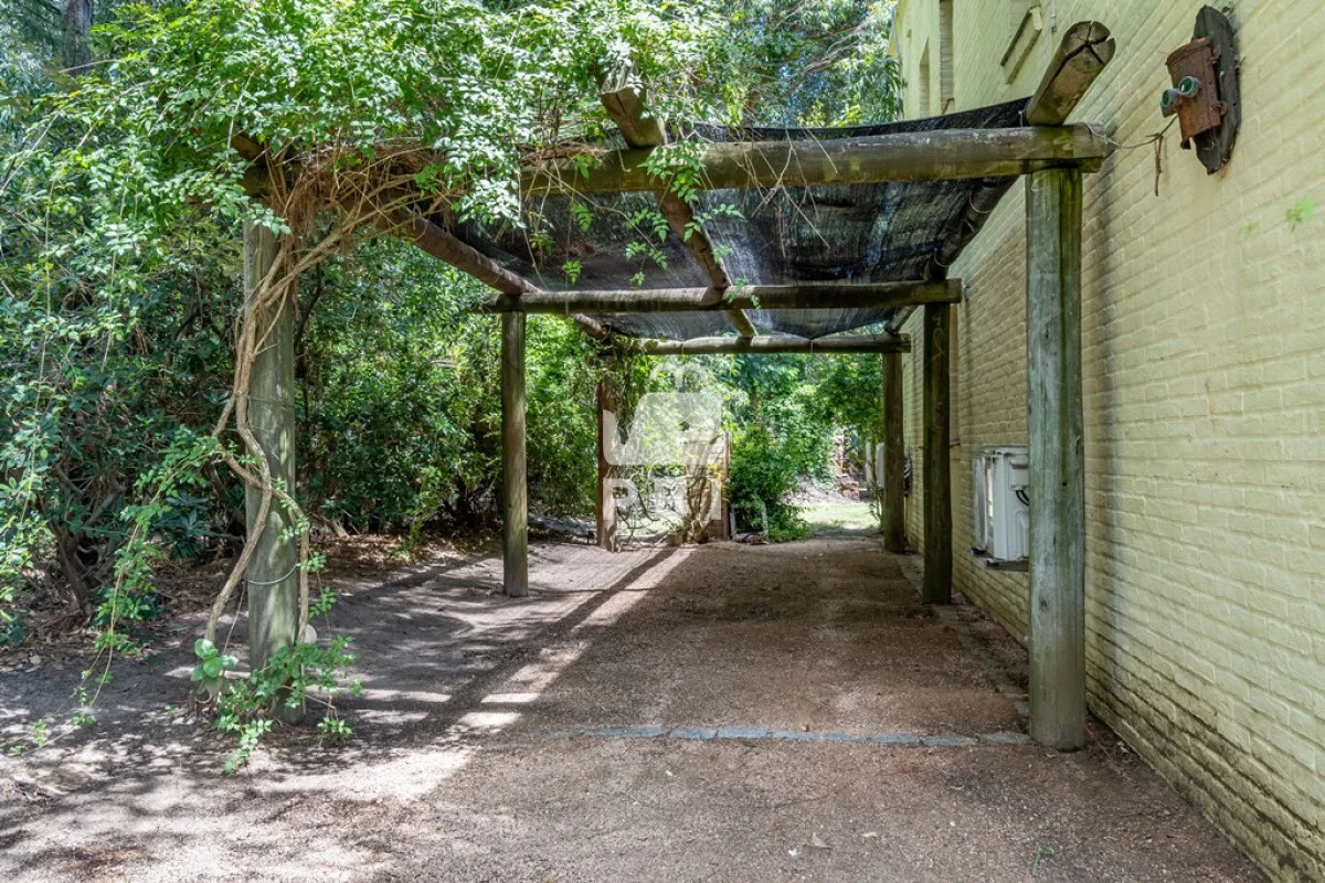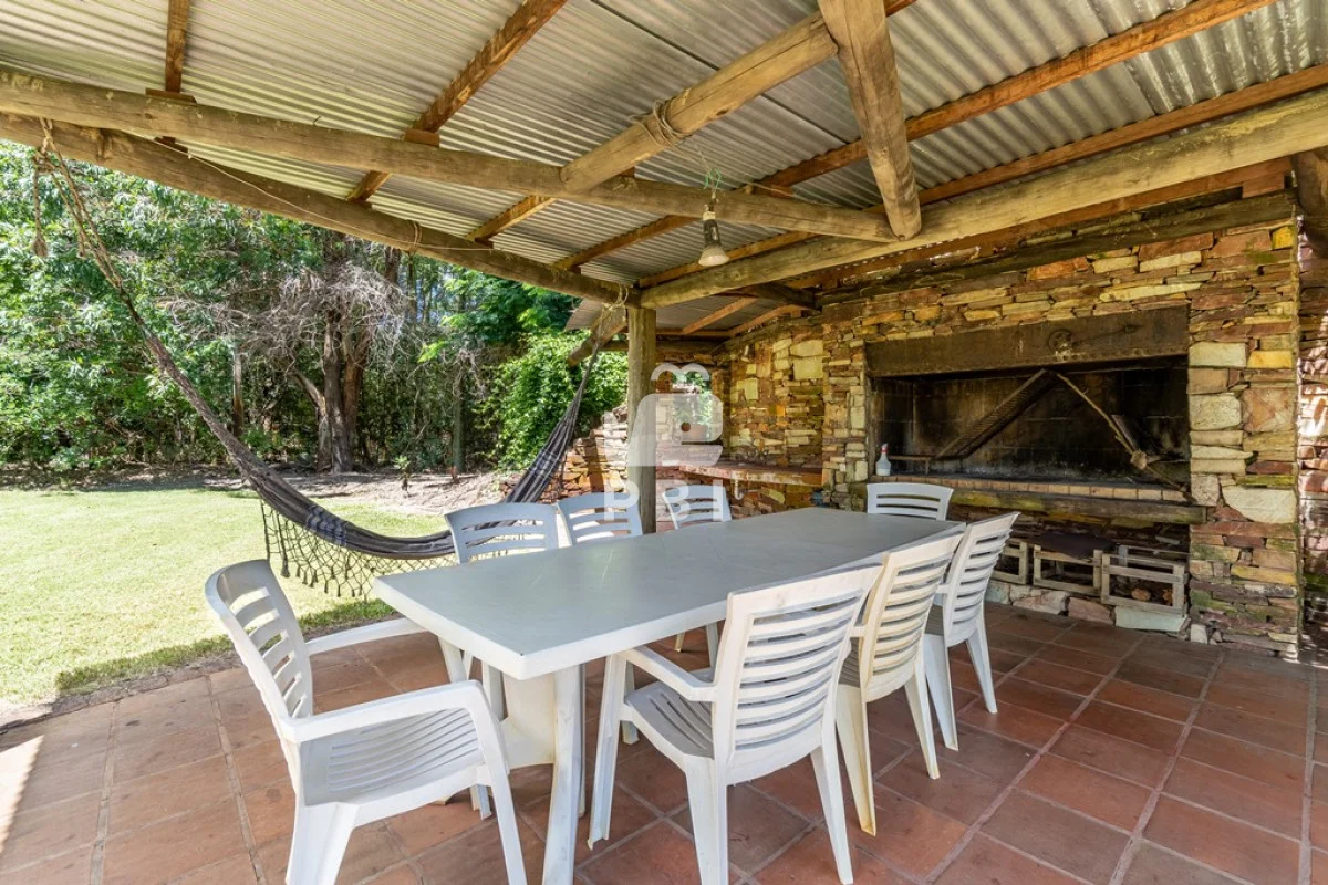 Amplio jardín con terraza techada y parrillero rodeado de un agradable entorno.