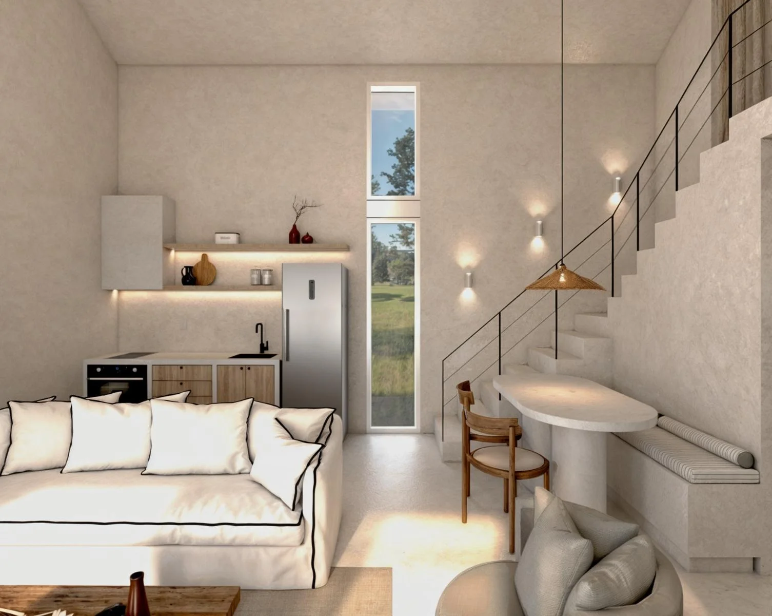 En planta baja, living comedor y cocina integrada, vista al jardín, recibe mucho sol por su orientación Norte. Un dormitorio en suite en planta baja con baño, tina para dos personas y ducha doble. En la planta alta un entrepiso de muy buen tamaño ideal para un segundo dormitorio.