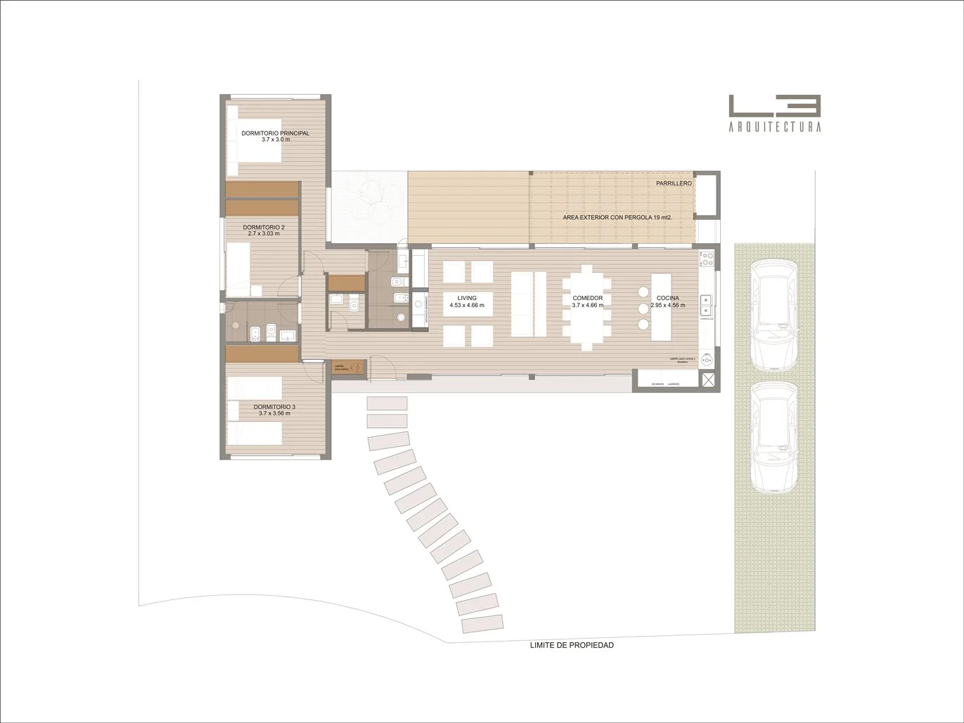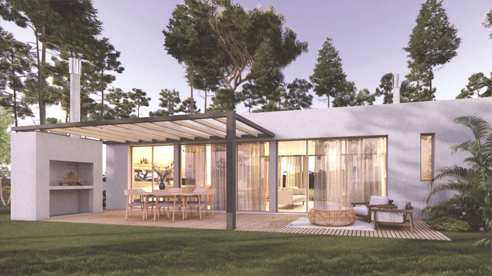 En el exterior se destacan el parrillero con pérgola, deck de madera, y la cochera doble en línea.