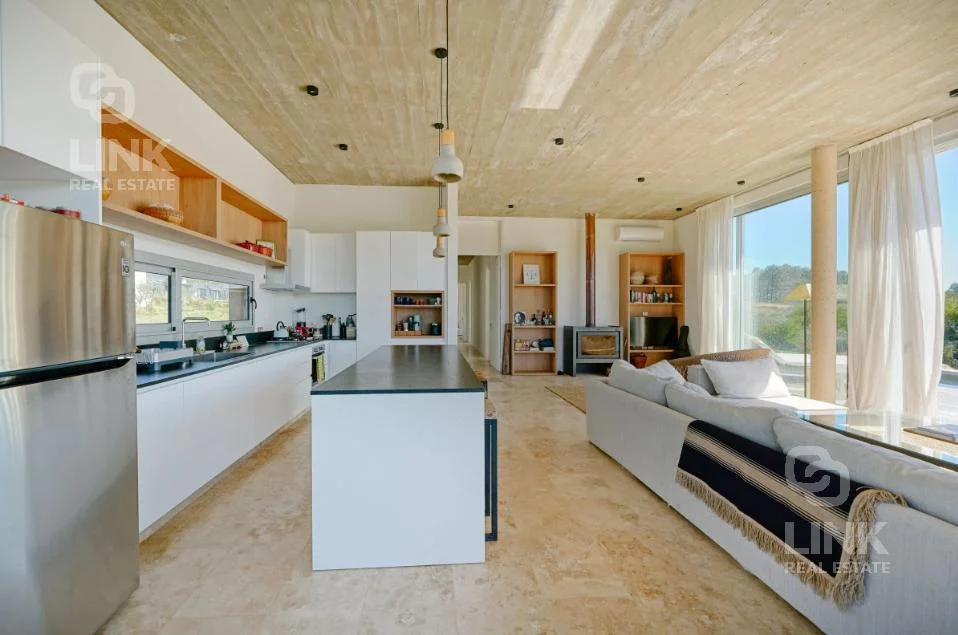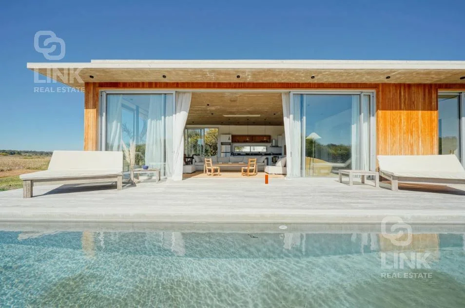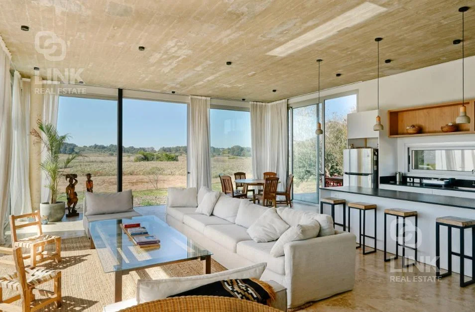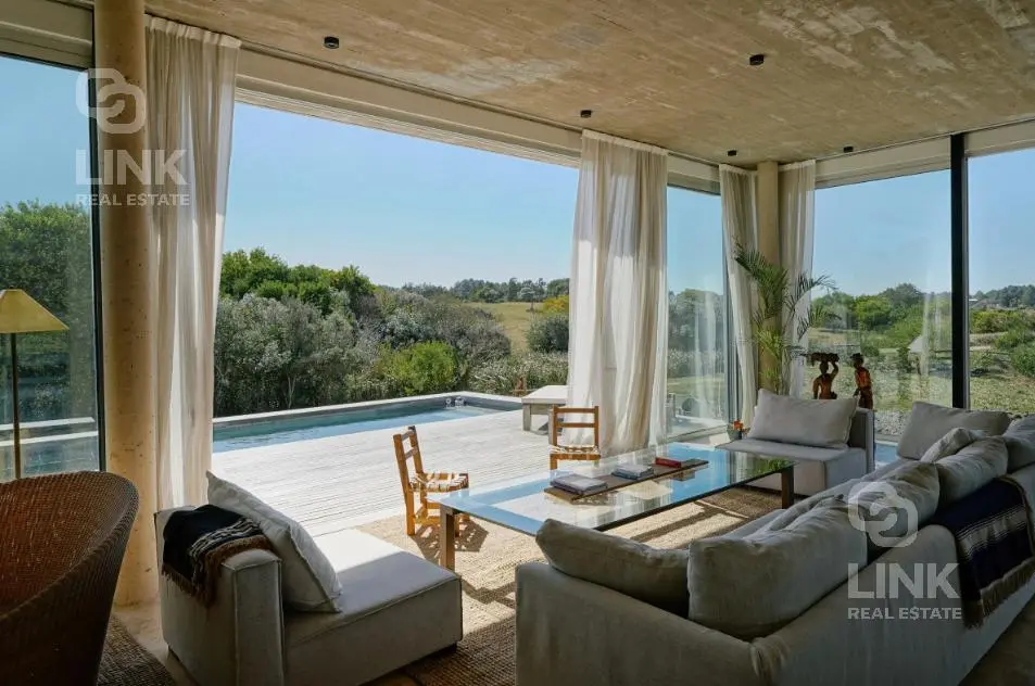 Con grandes ventanales y materiales nobles, la casa se integra al paisaje, ofreciendo una atmósfera cálida y relajada. Cuenta con 4 dormitorios en suite, amplio living con vistas abiertas, parrilla, piscina y lavadero.