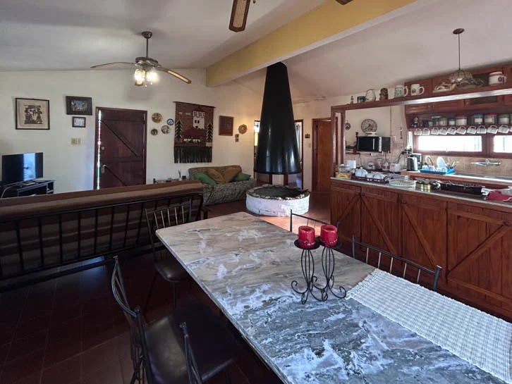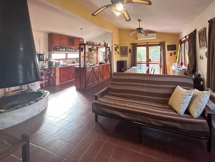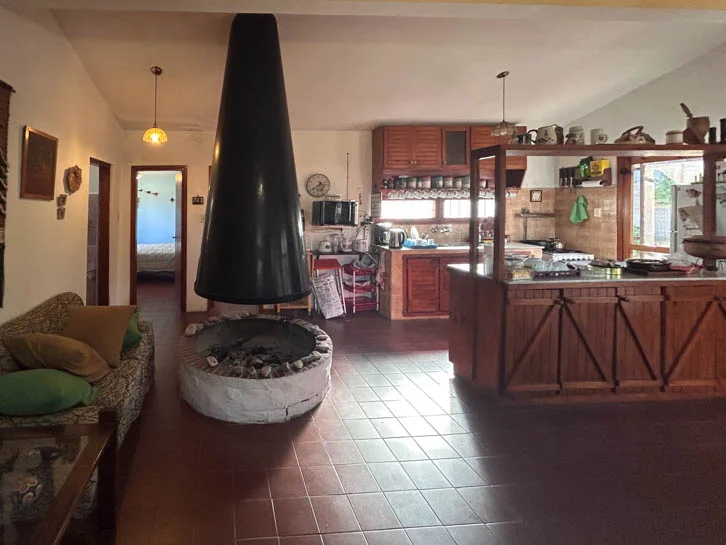 Distribuida en una sola planta y de construcción tradicional con techo de losa de hormigón y cubierta de chapa; cuenta con un amplio ambiente que combina living-comedor con estufa a leña y la cocina integrada, dos dormitorios y un baño completo.