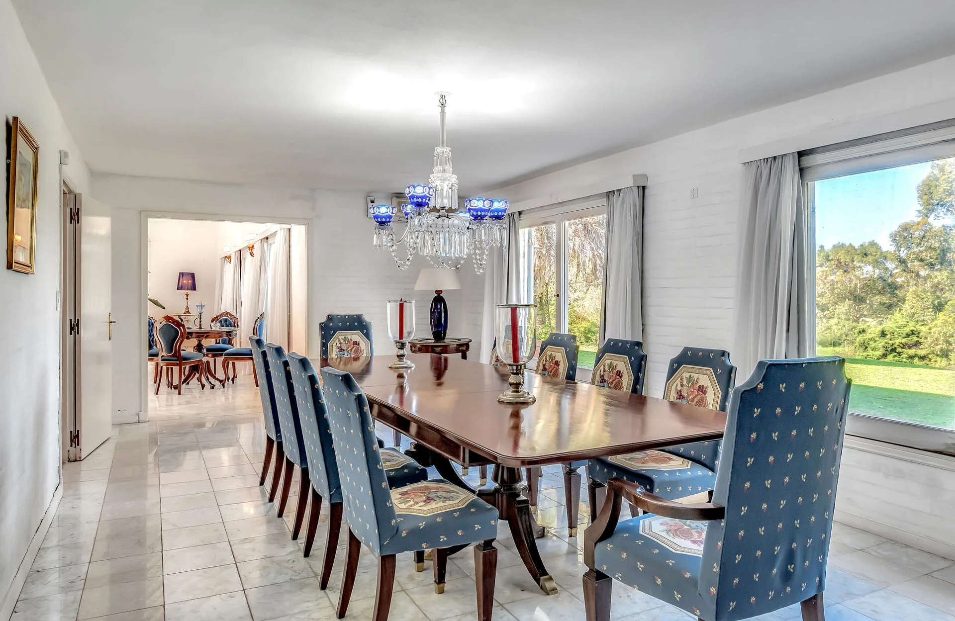 Comedor Principal con doble circulación para 10 personas, mesa, sillas y vajilla de estilo.
