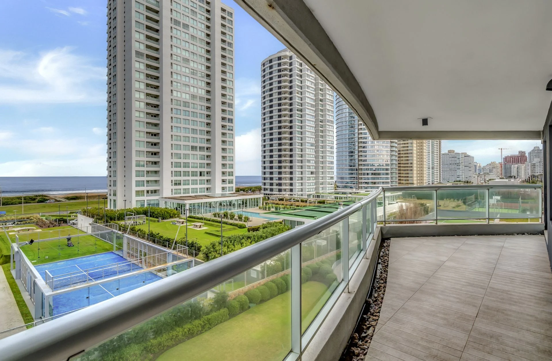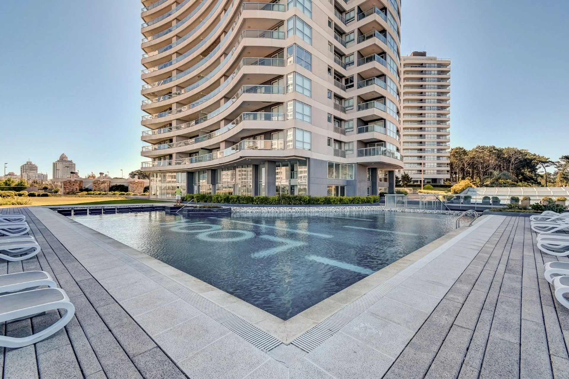 Planta baja exterior: piscina con deck solarium, piscina infantil, jardines y glorietas, plaza de juegos infantiles, canchas de tenis de polvo de ladrillo y superficie rápida multiuso (fútbol, básquet, etc.)