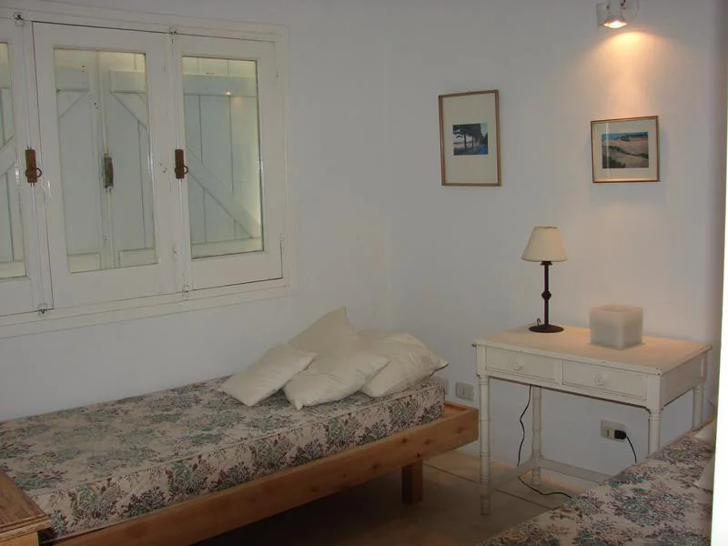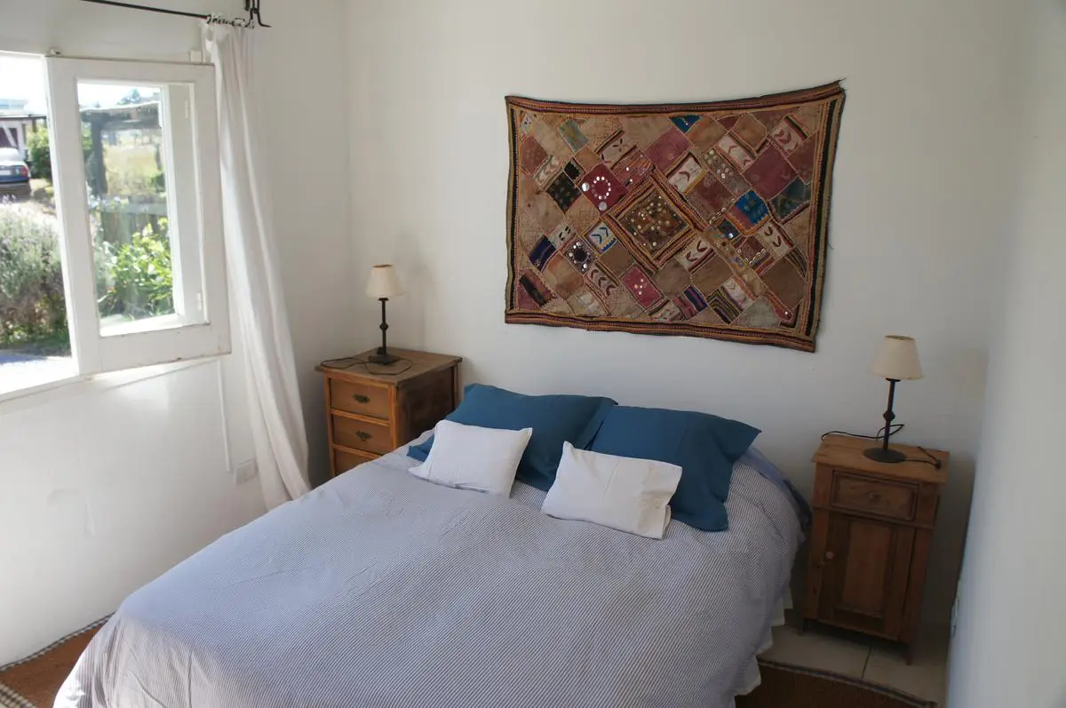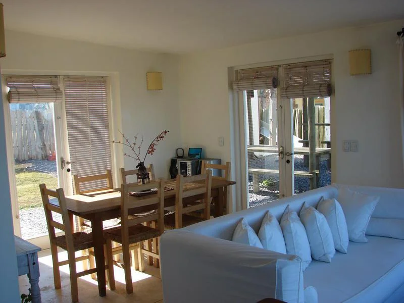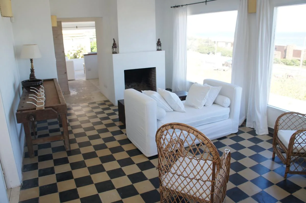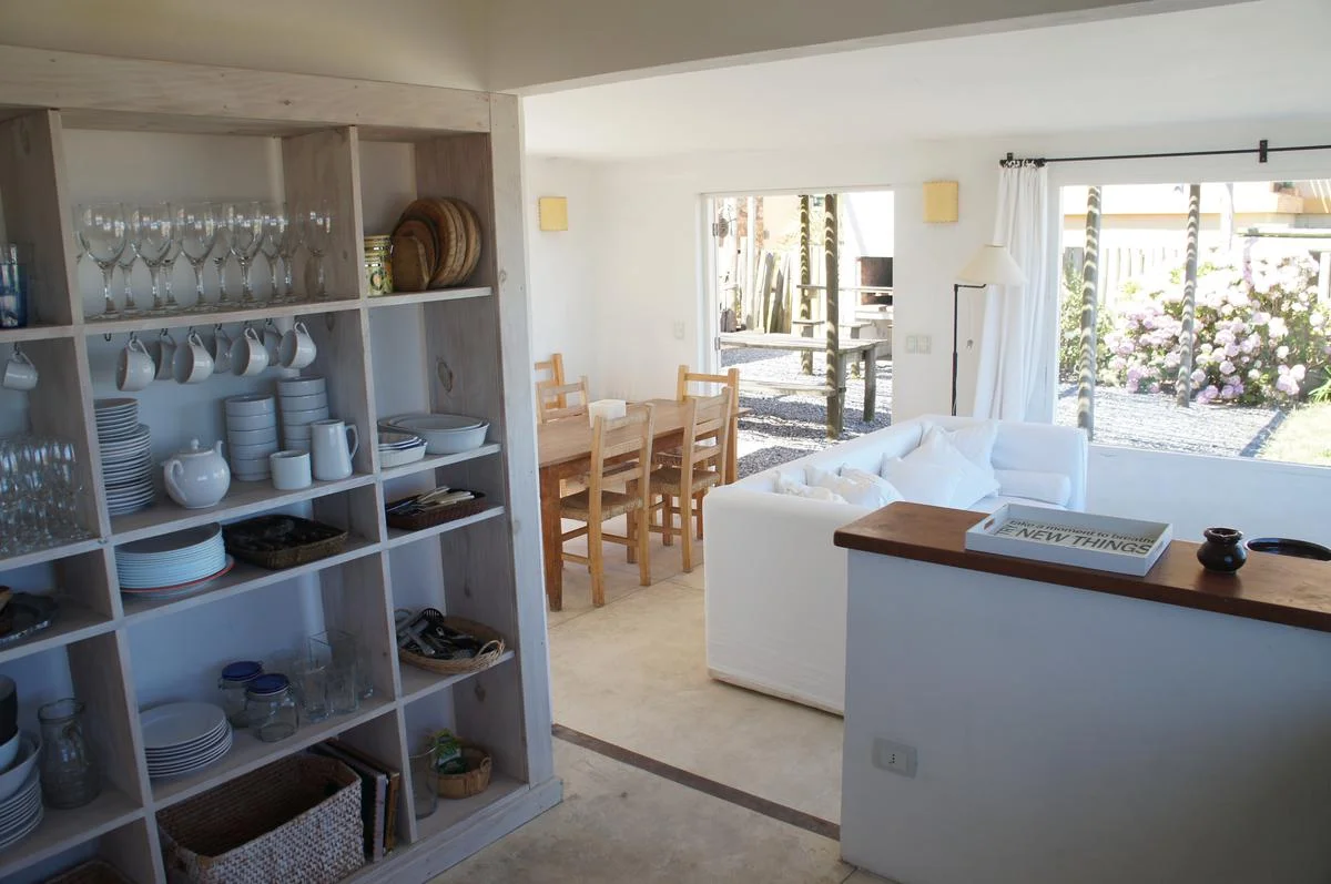 La casa cuenta con living comedor con chimenea, suite principal al frente, cocina abierta al comedor diario y dos dormitorios que comparten un baño.