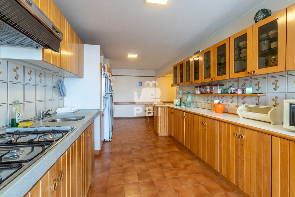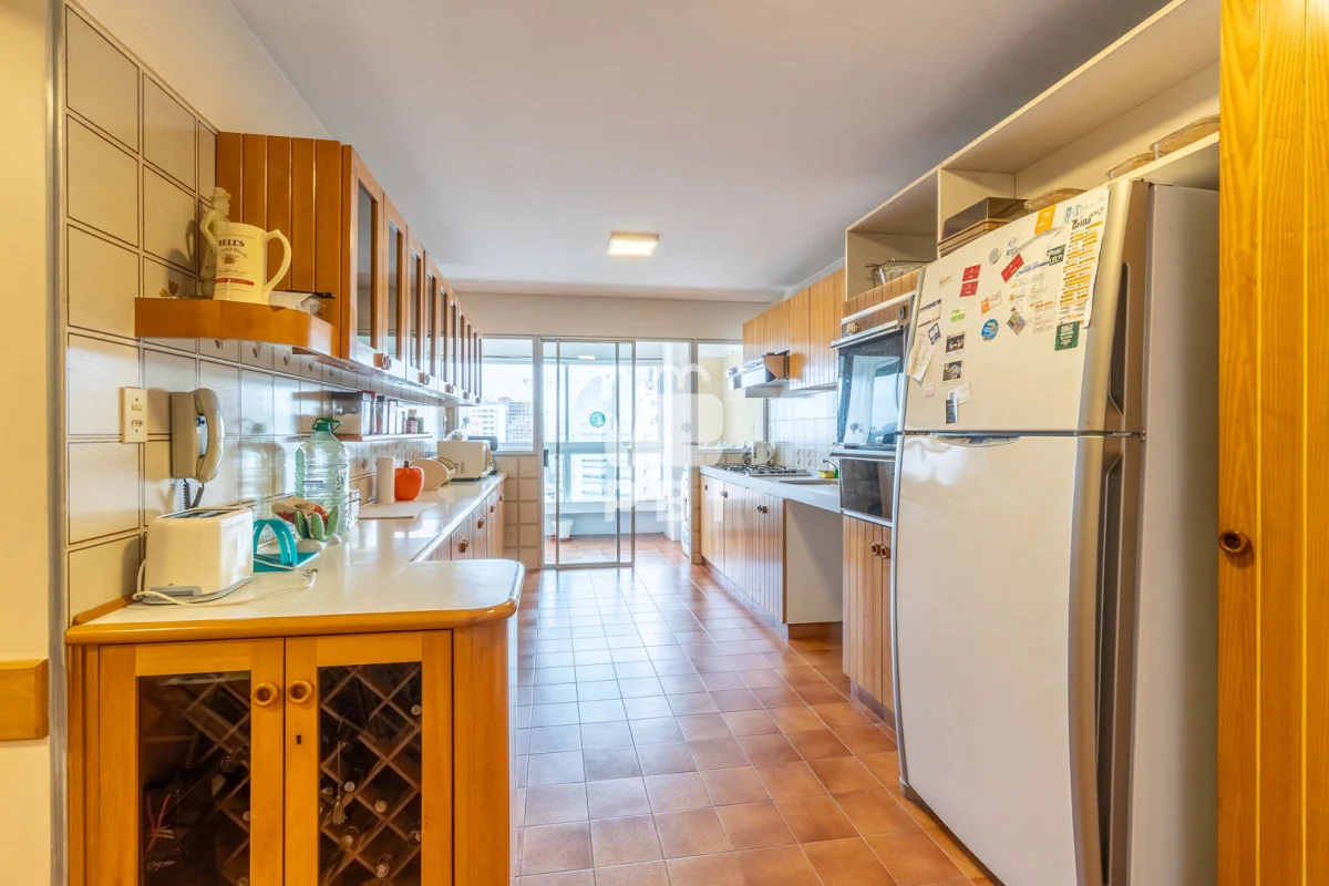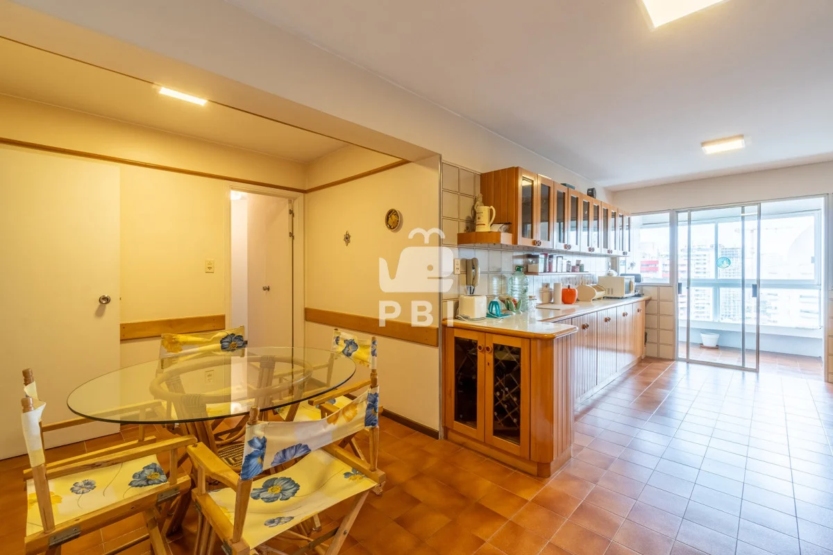 La cocina independiente está equipada con modernos electrodomésticos y cuenta con un comedor diario. El departamento también incluye un área de descanso con cómodos sillones y una dependencia de servicio, que podría fácilmente convertirse en un cuarto dormitorio adicional.