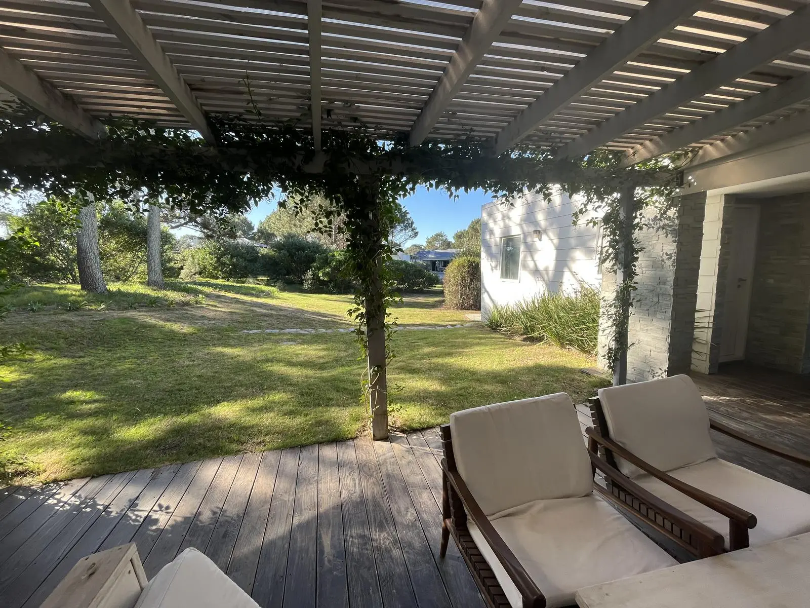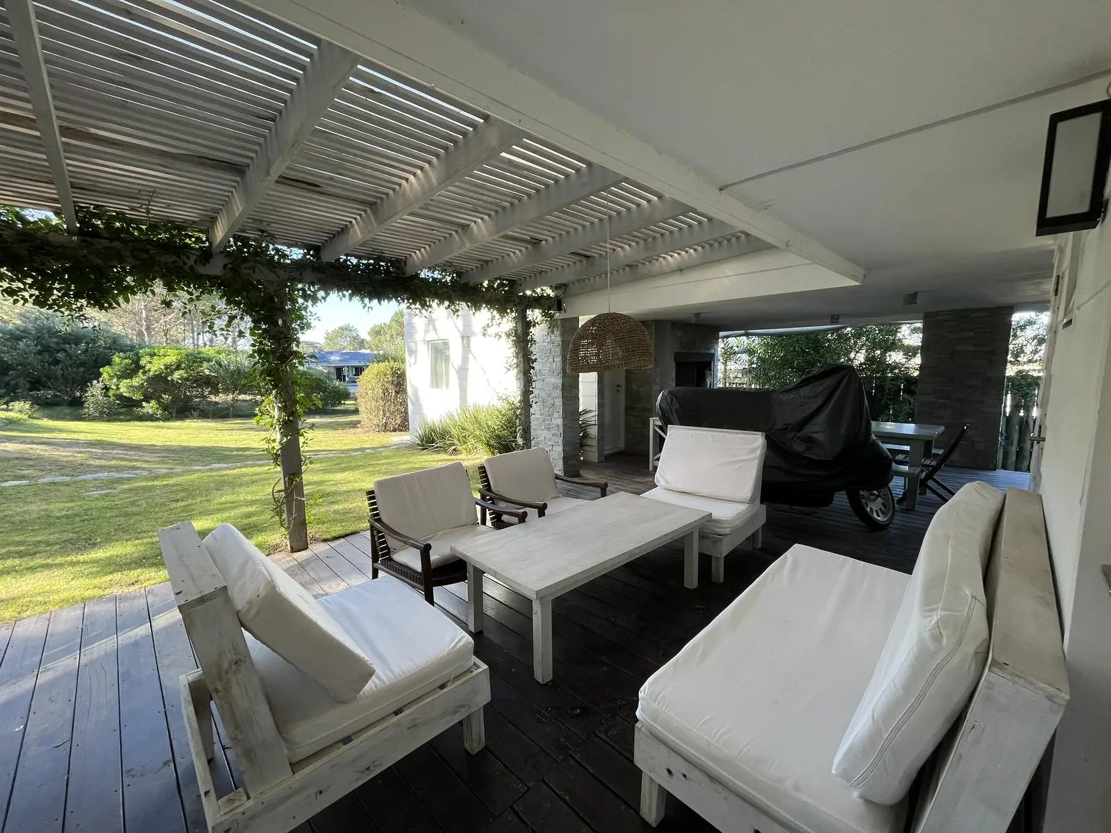 A covered barbecue area includes a living space and a dining area for comfortable outdoor meals.