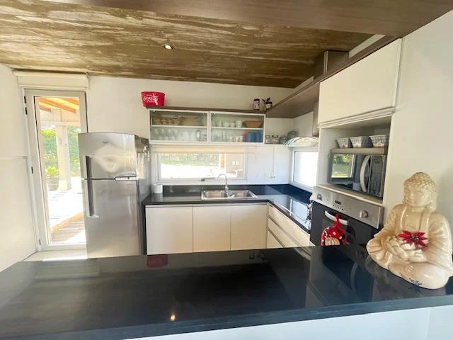 On the ground floor, we find a spacious living room with a garden view, a kitchen integrated into the dining room with a pass-through window, and access to the barbecue area and outdoor fire pit. There is also a toilette.