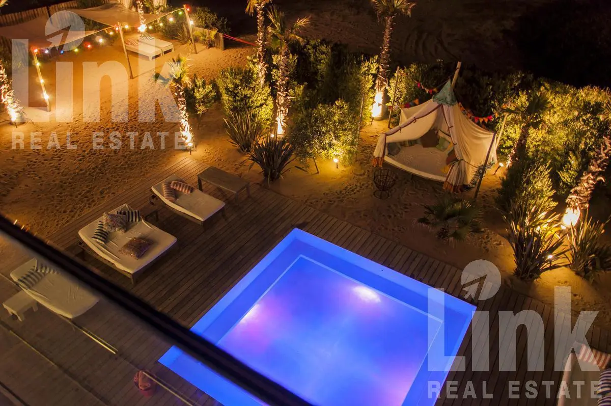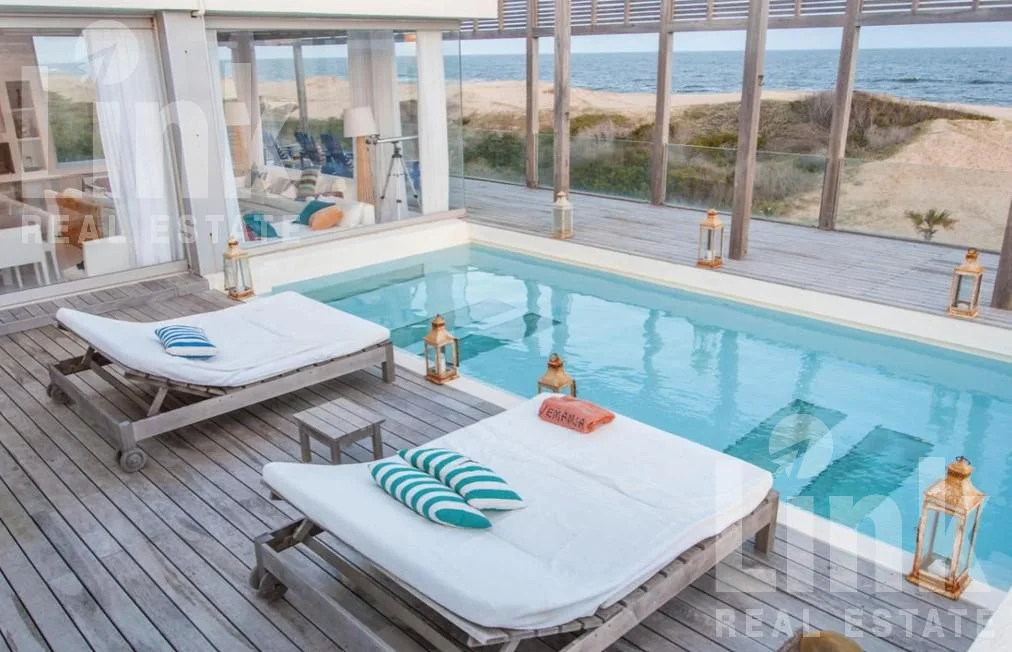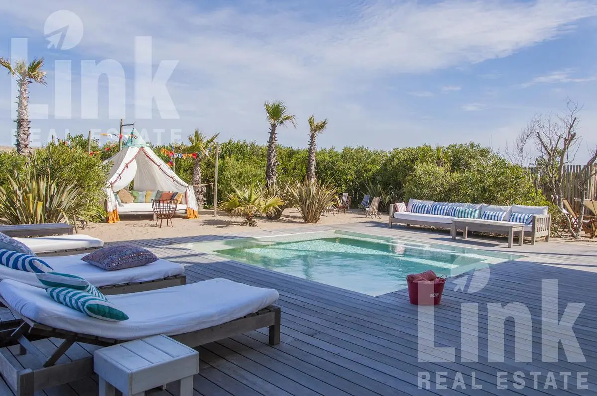 Hermoso jardín cercado al frente y fondo con galería, deck, pileta, camastros, reposeras y sector para fogones. Salida privada a la playa.