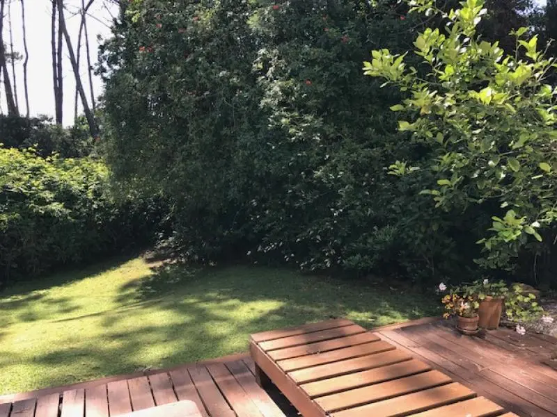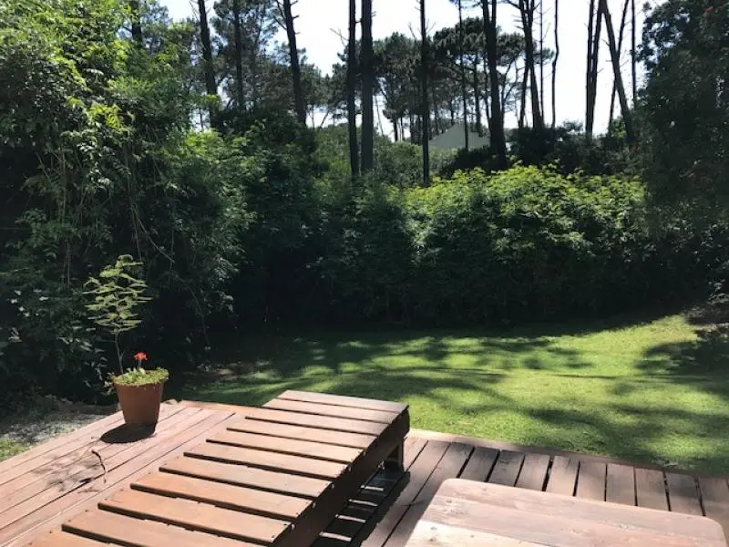 Hacia el jardín nos encontramos con un entorno de mucho verde para disfrutar desde el deck de la casa, con amplios ventanales que permiten el pase de luz natural todo el día.
