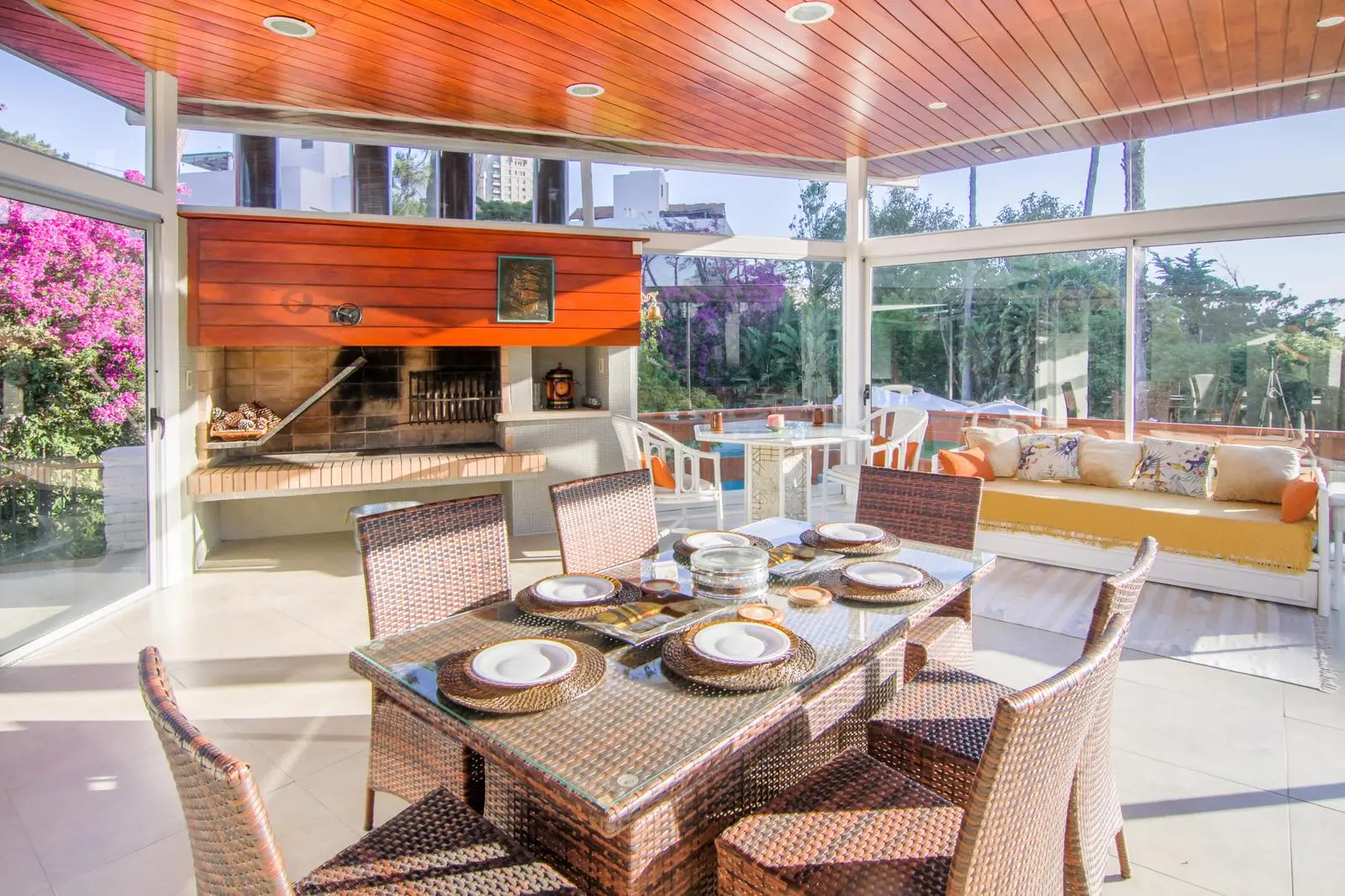 It offers a spacious living room with a wood-burning stove and a large terrace, a dining room, a TV room, a closed barbecue area with a terrace, and a kitchen with a comfortable island and a closed laundry room.