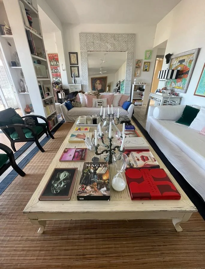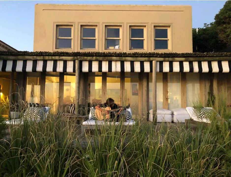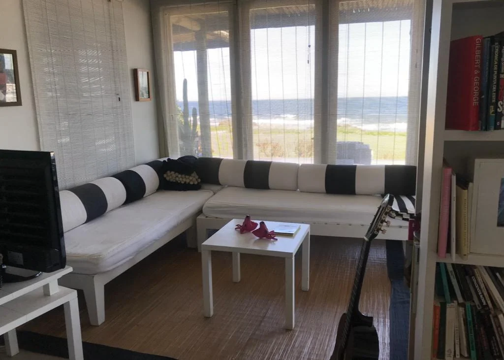 La recepción que comprende el living, estar , bar y toilette , se vuelca hacia el deck de madera que baja a la playa. La casa está decorada en colores fuertes y muy moderna, todo en completa armonía.