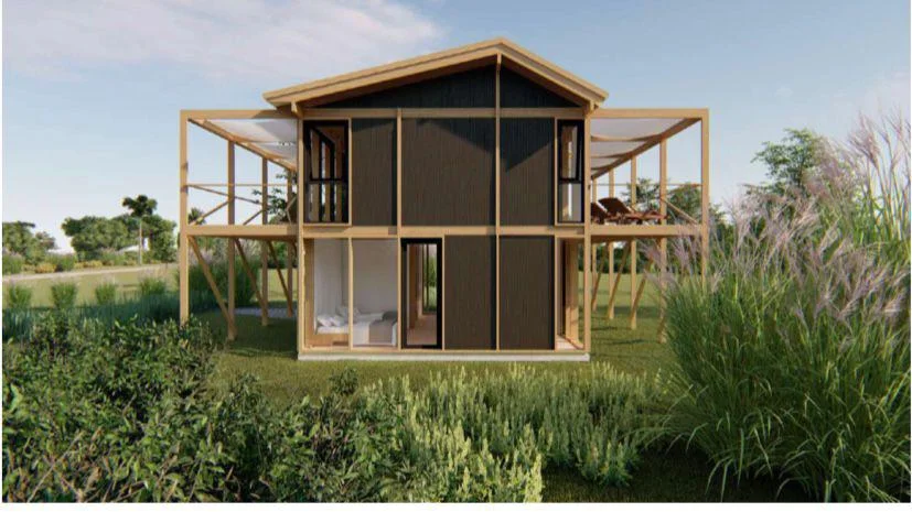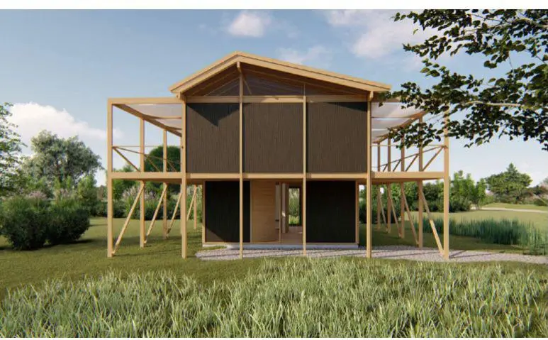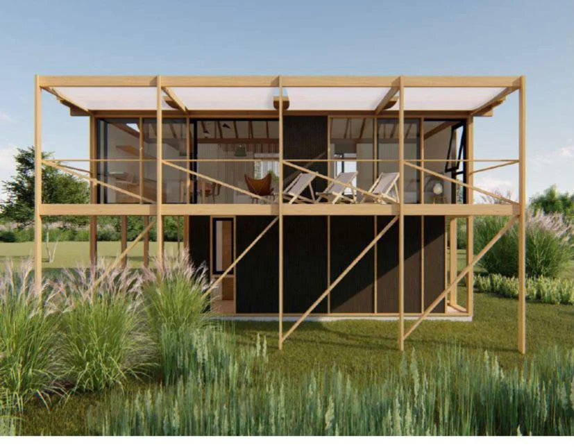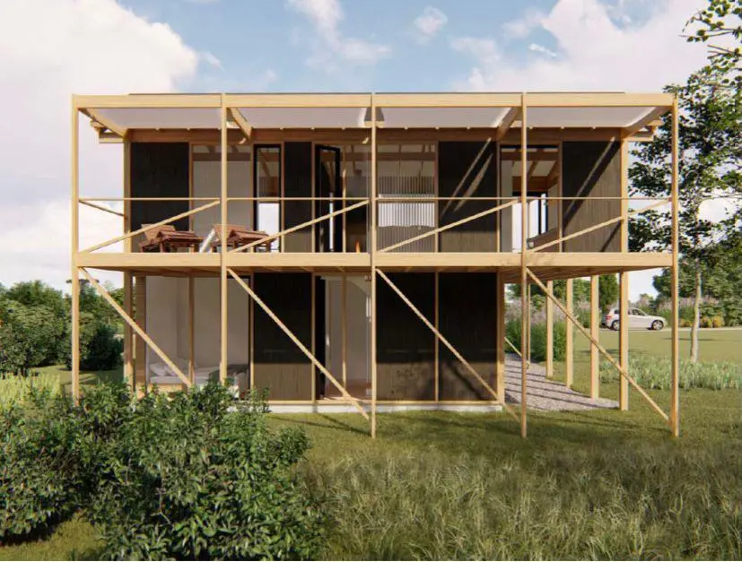La casa está construida en madera , wood framing . Se implanta en un terreno de 600m2.
