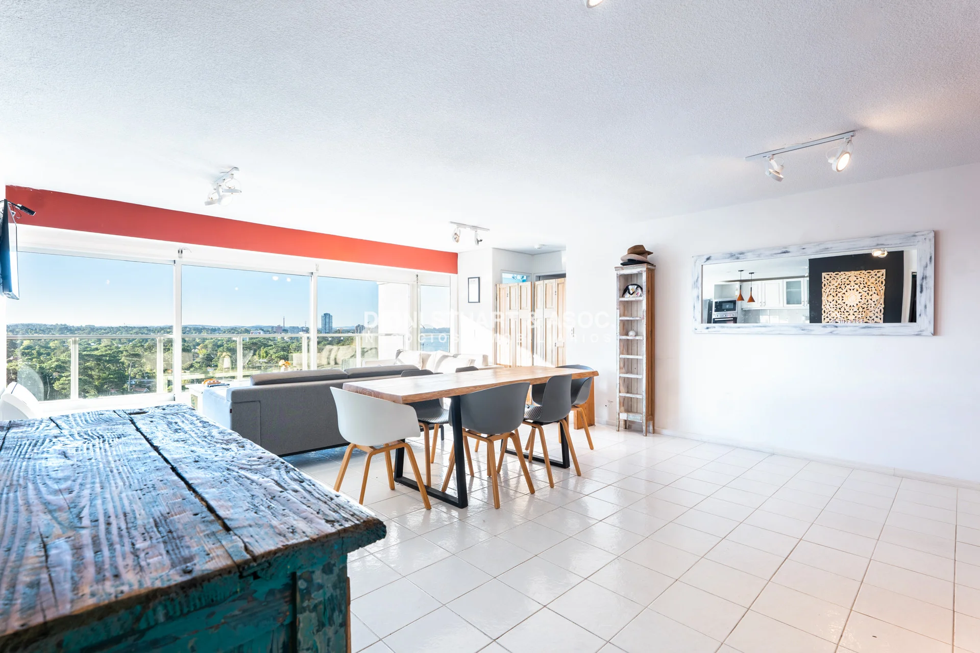 Presentamos este magnifico departamento ubicado en la Torre Wilson del Complejo Lincoln Center, unidad de 220 m2 totales y 174 m2 internos, distribuidos en dos pisos orientado hacia el NorOeste con una vista única a la mansa y Punta Ballena. En planta baja nos encontramos con un amplio living-comedor con una cocina con barra, dos dormitorios, dos baños, y dependencia de servicio con baño. La planta alta es otro departamento más, muy bien distribuido y equipado, con un amplio living comedor una estufa a leña instalada, parrillero, toilette, dos dormitorios (uno en suite), y una amplia terraza en forma de L con grandes sillones desde donde podemos disfrutar de una hermosa vista al mar y al bosque. El departamento cuenta con mejoras realizadas como vidrios DVH, aires acondicionados, rollers automatizados, luminaria nueva, estufa en el segundo nivel, piso vinilico, deck y una pérgola con toldos en la terraza. La unidad cuenta con dos cocheras, una techada y un garage en subsuelo.