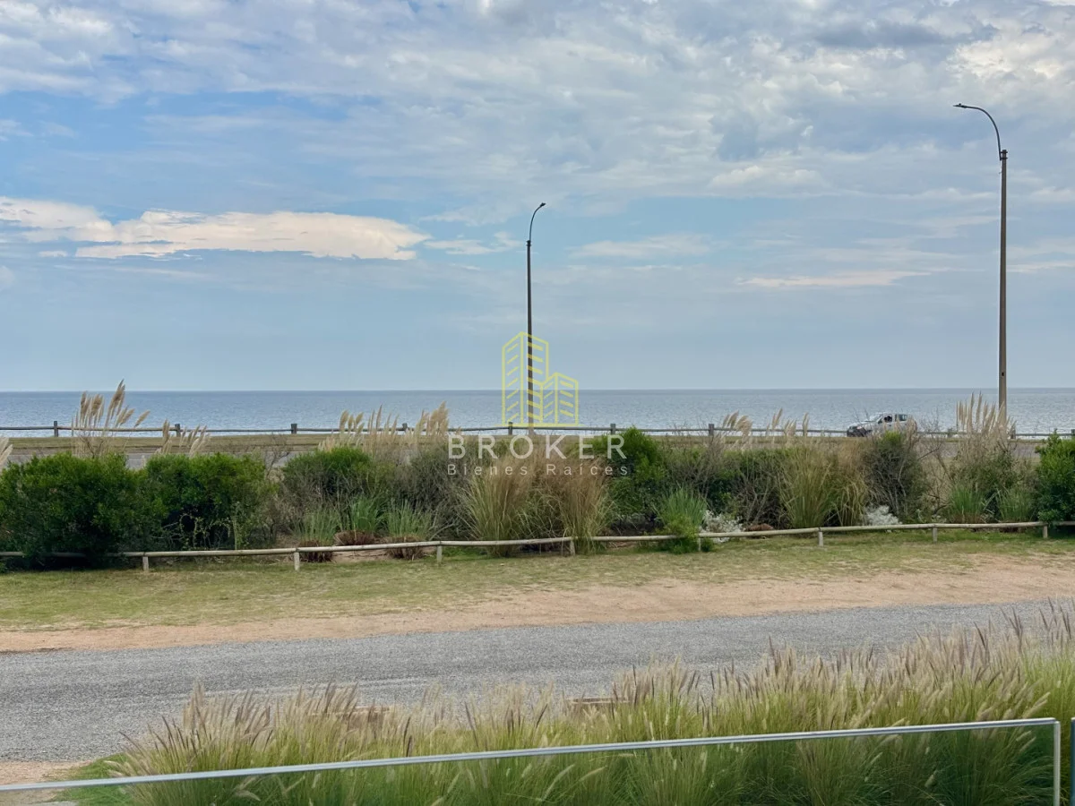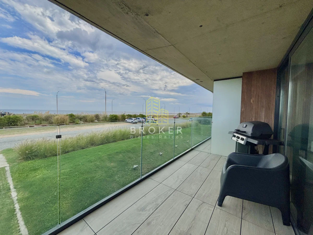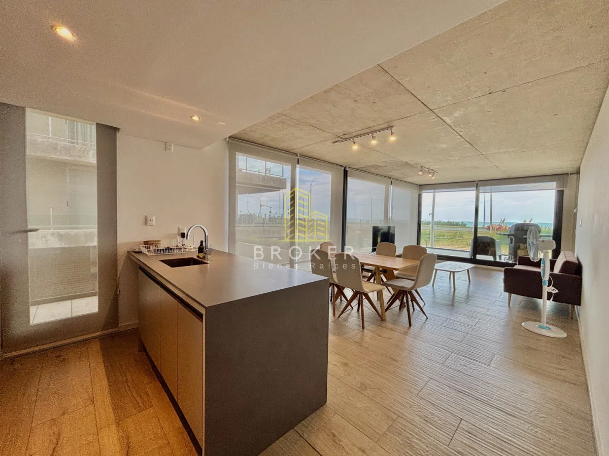 Confortable living comedor con salida a balcón con vista directa al mar, cocina integrada con barra, dos dormitorios (uno en suite), dos baños, y una segunda terraza de grandes dimensiones en el contra frente.