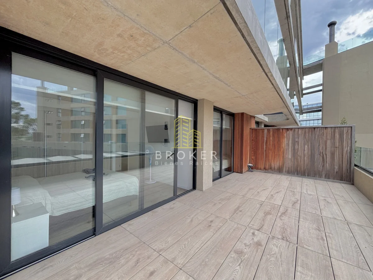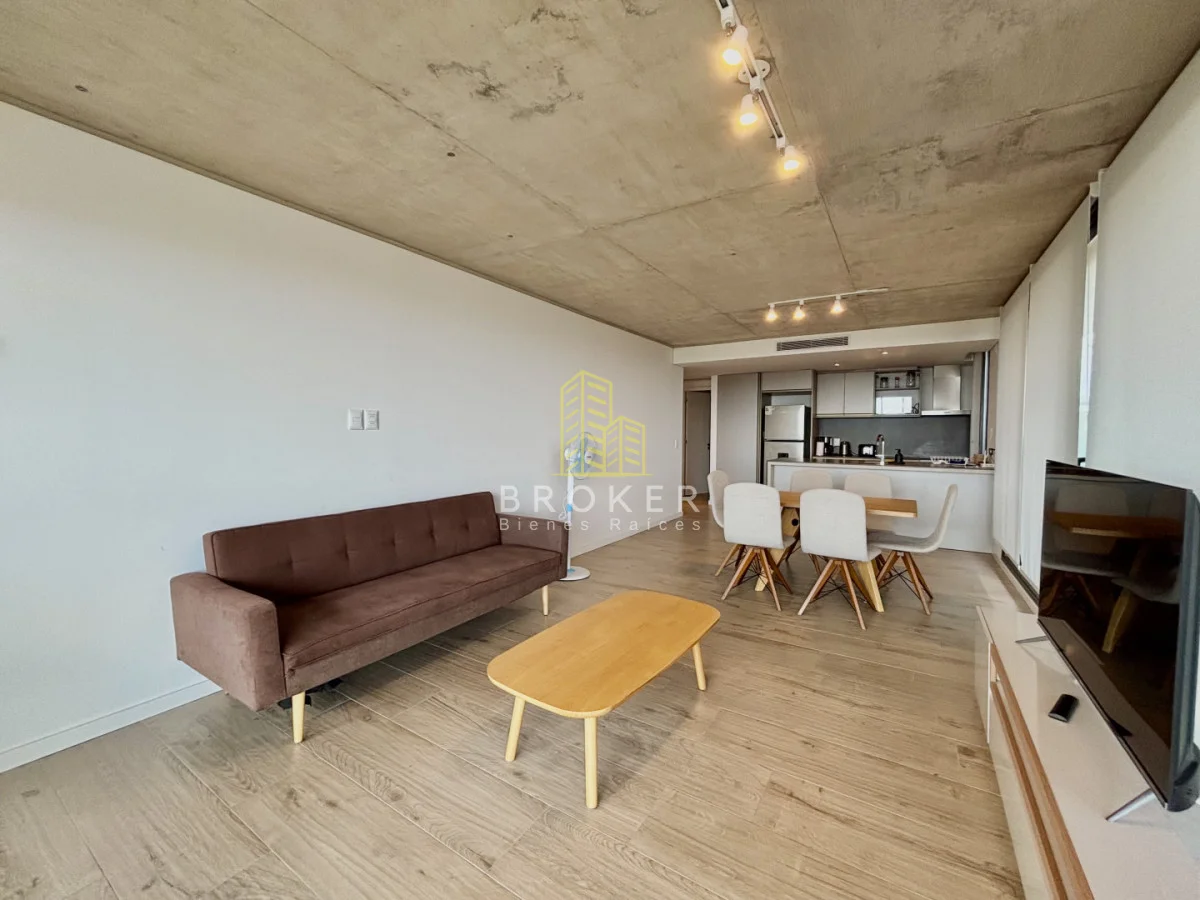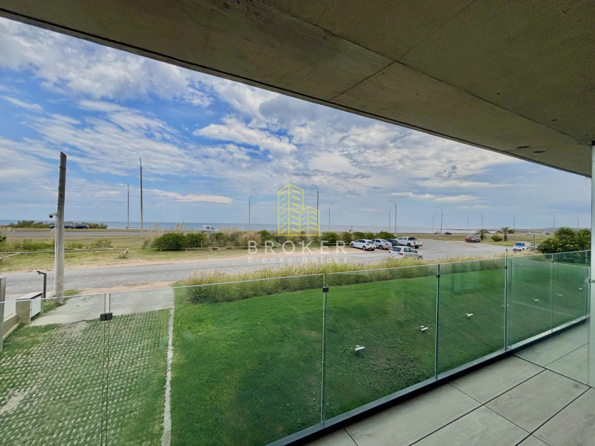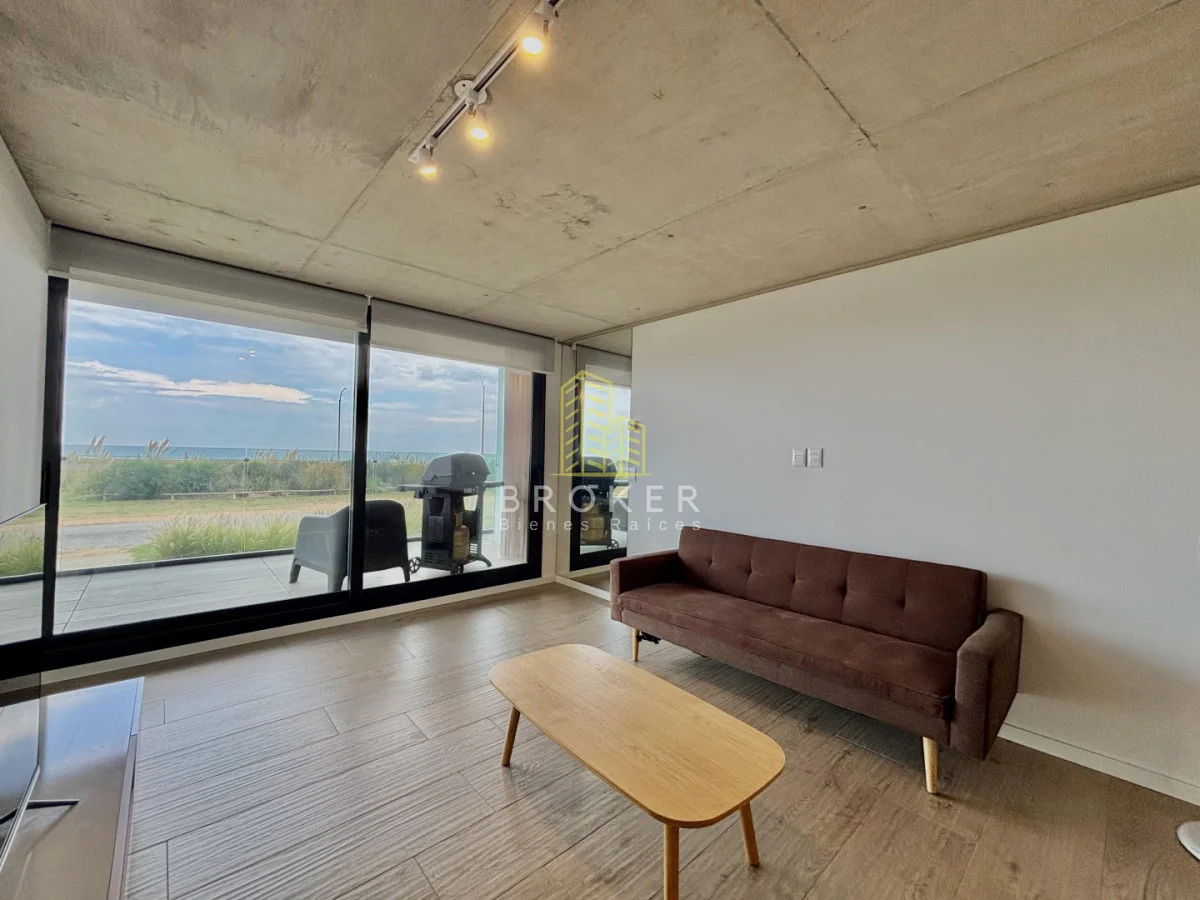 Confortable living comedor con salida a balcón con vista directa al mar, cocina integrada con barra, dos dormitorios (uno en suite), dos baños, y una segunda terraza de grandes dimensiones en el contra frente.