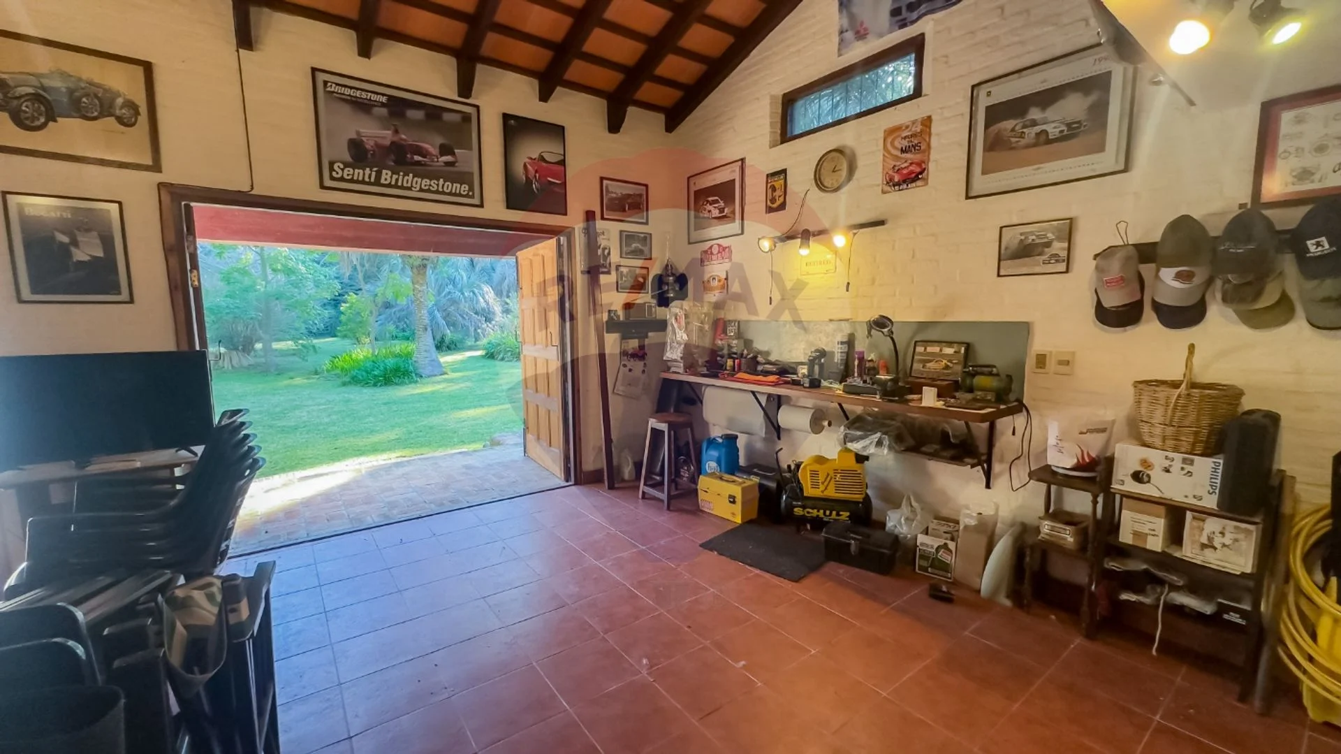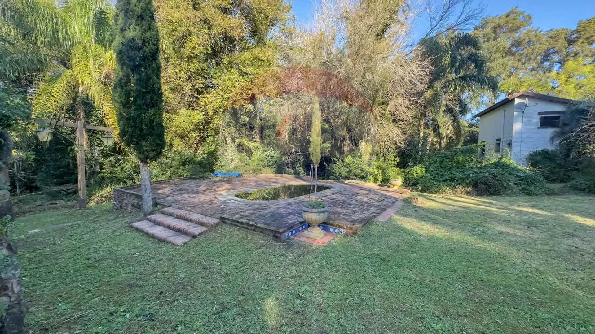 En el patio nos encontramos con una cochera abierta para 3 autos, una pérgola de madera, parrillero, piscina climatizada y el aljibe manantial desde donde se abastece de agua al tanque de suministro.