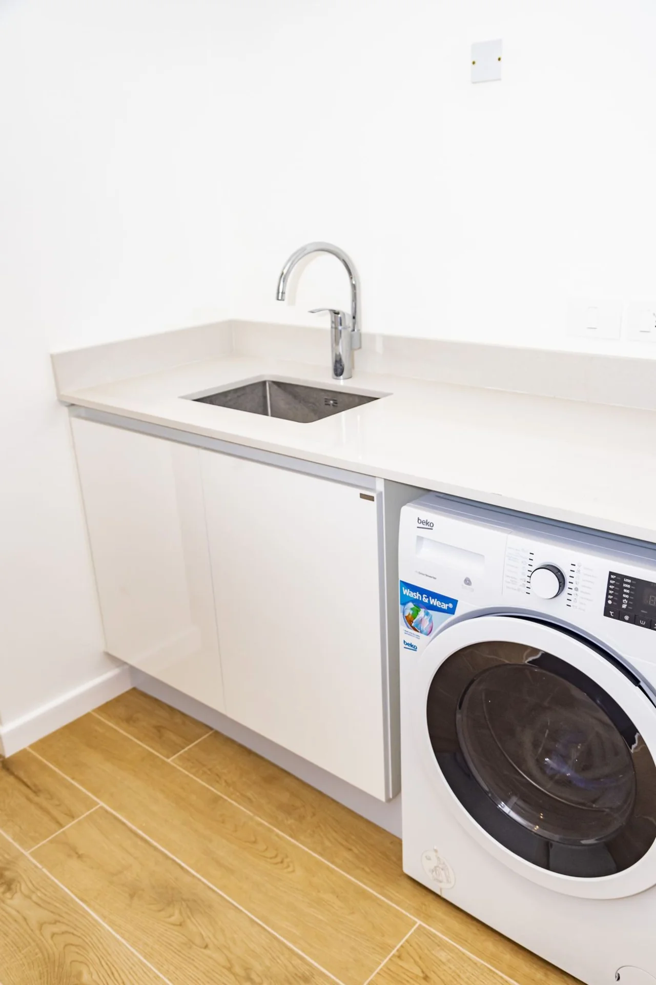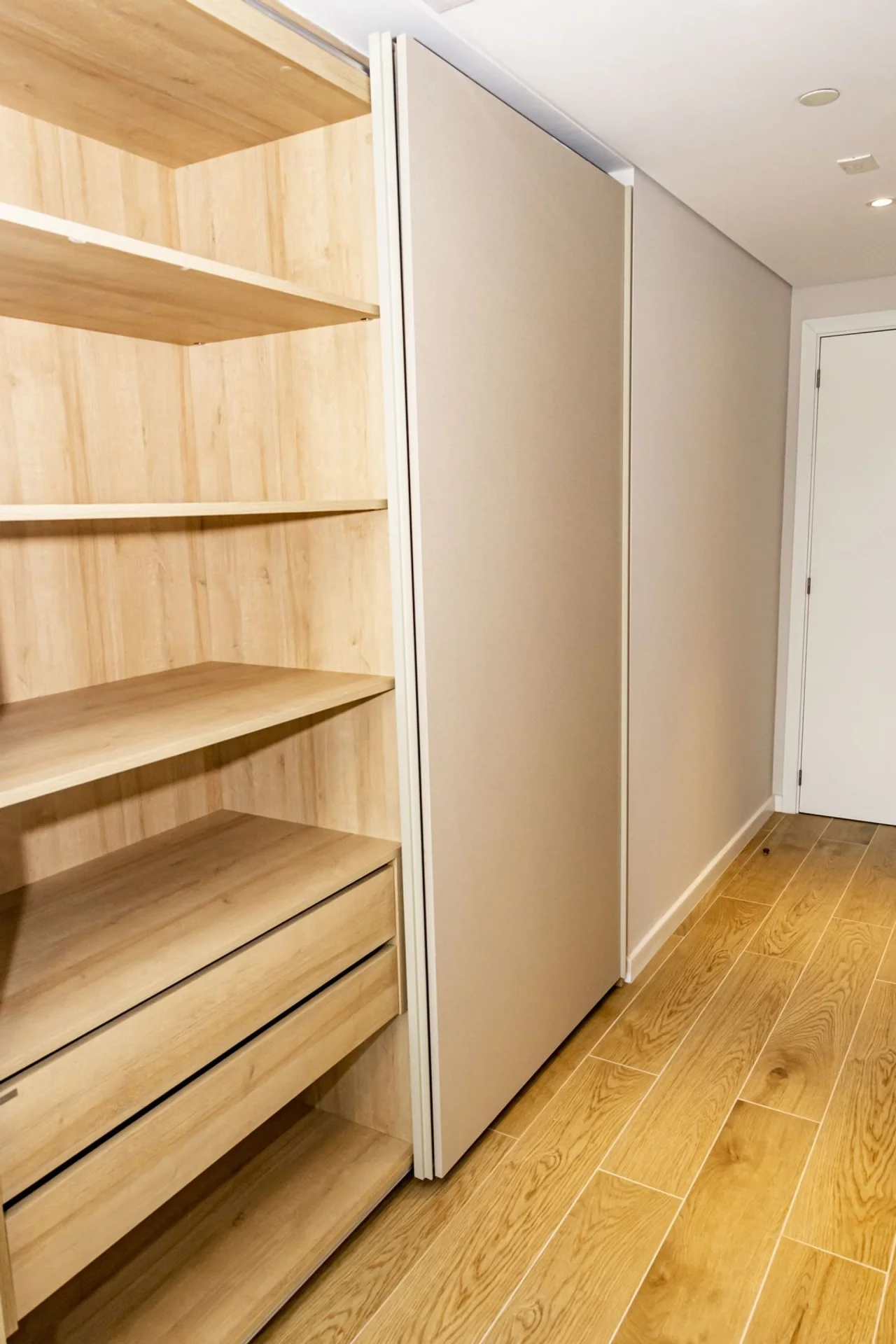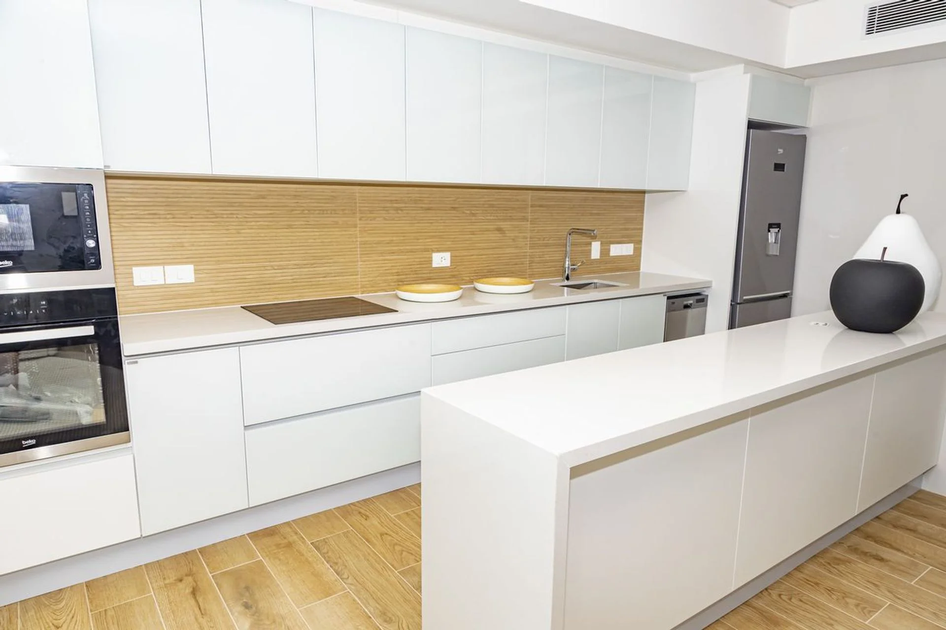 La cocina, concebida como el corazón del hogar, integra electrodomésticos de alta gama: frigorífico de acero inoxidable, lavavajillas, microondas, vitrocerámica, horno eléctrico empotrado y grifería de diseño que eleva cada detalle a la categoría de arte.