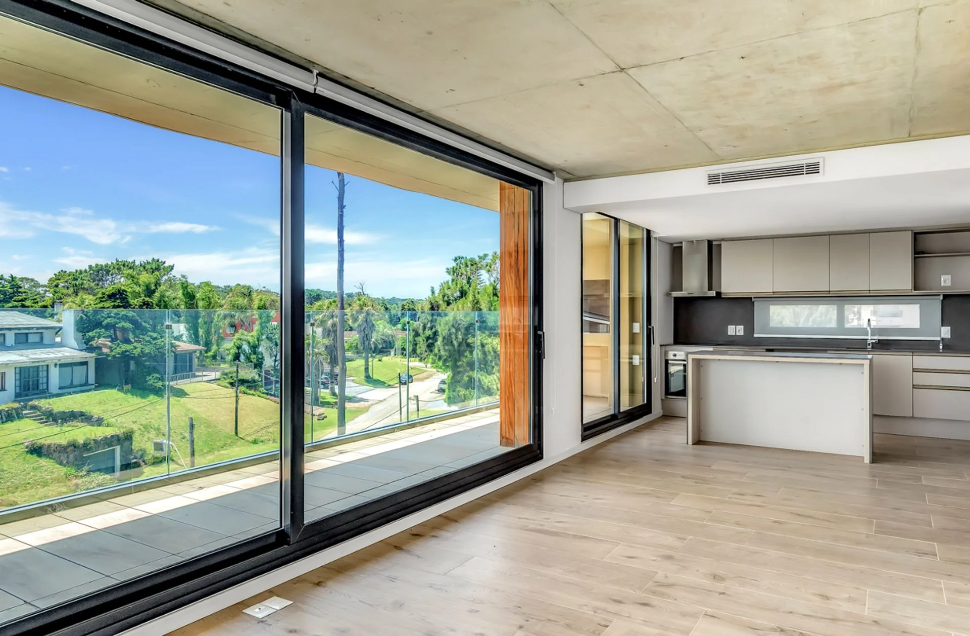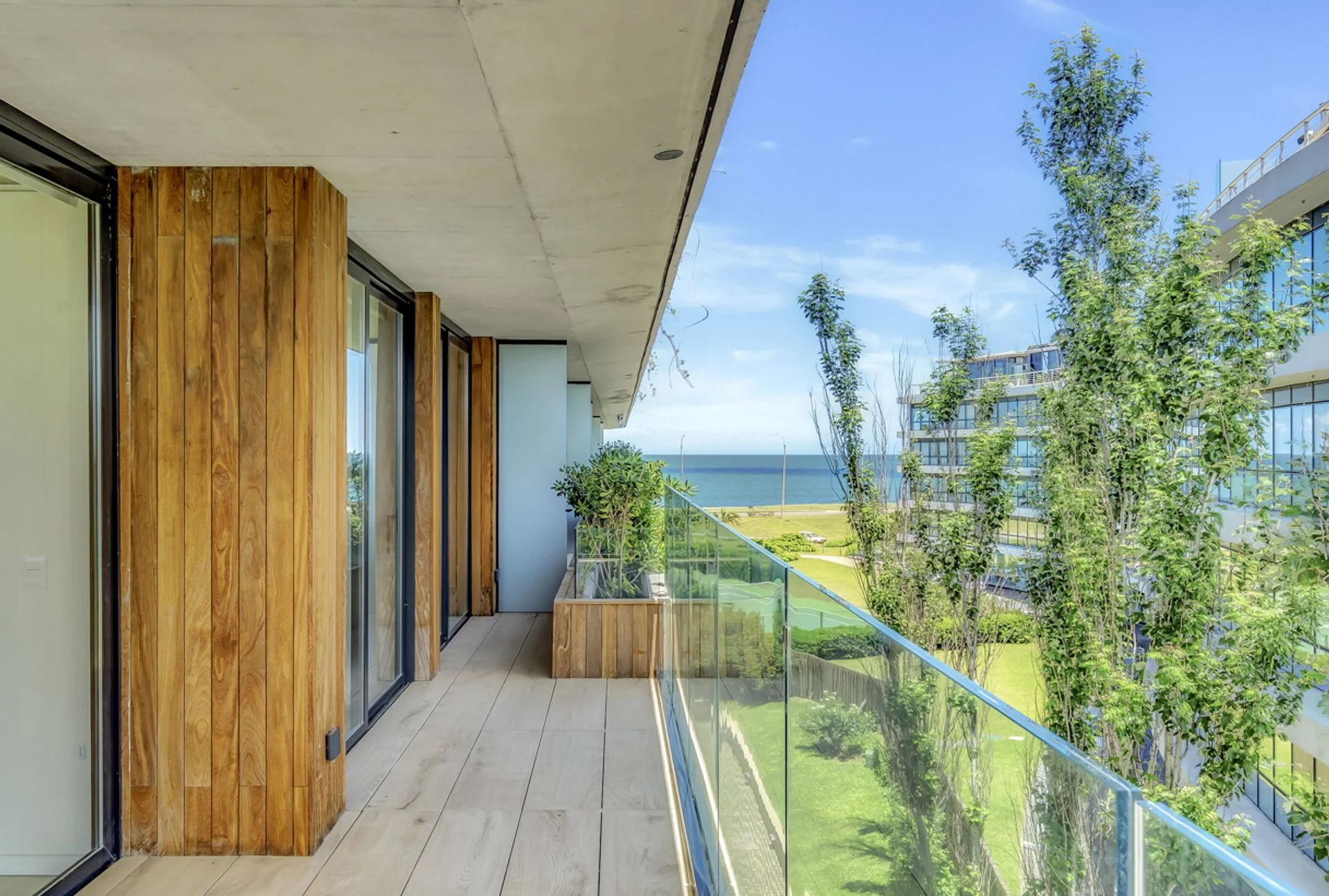 La terraza privada, accesible desde el living y los dormitorios, es el lugar ideal para relajarse, disfrutar de las vistas y preparar asados en su parrillero exclusivo. Los pisos de porcelanato con textura de madera aportan calidez, mientras que las aberturas de aluminio con doble vidrio garantizan confort térmico y acústico. Además, la losa radiante eléctrica en todos los ambientes asegura el clima perfecto durante todo el año.