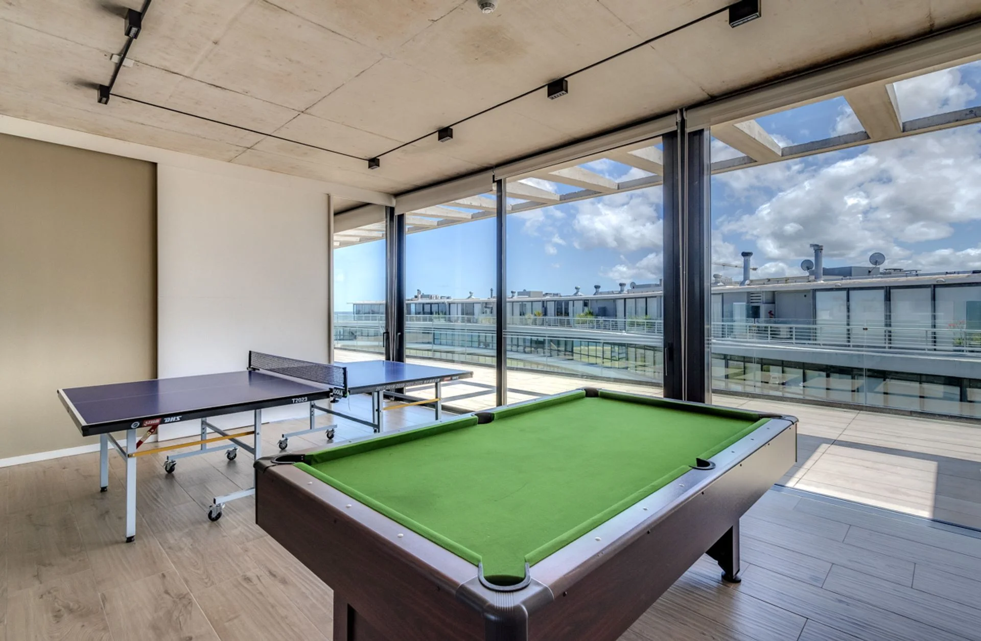 Espacios diseñados para cada etapa de la vida: salón de juegos para niños y un salón para adultos con mesa de pool y ping pong.