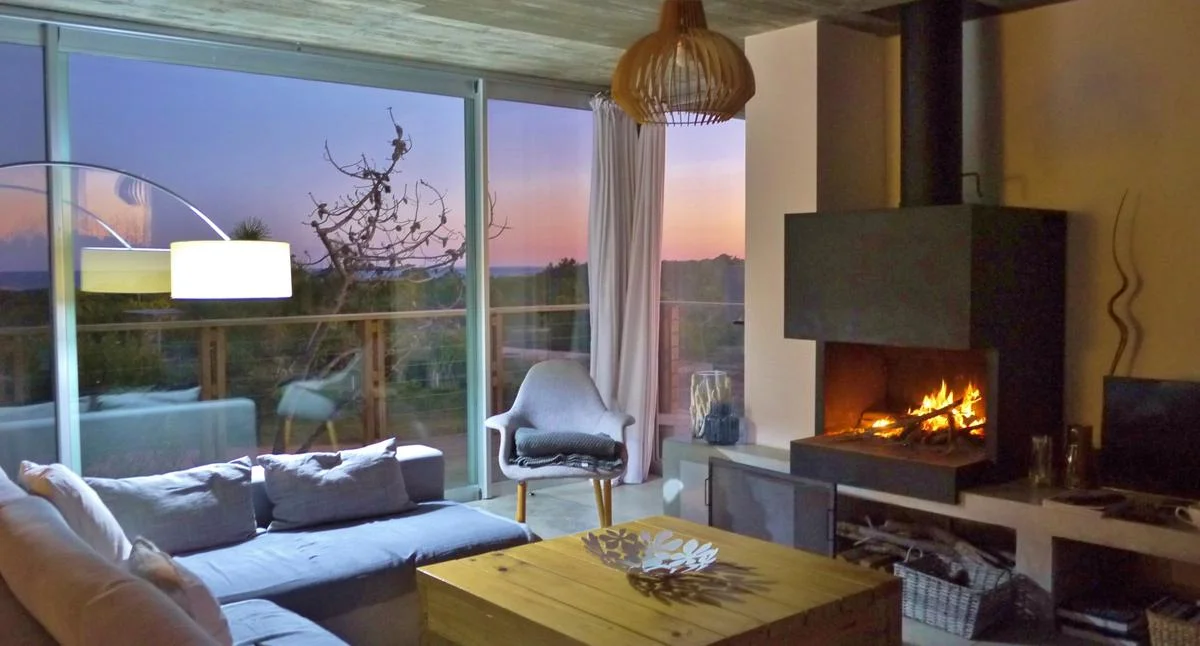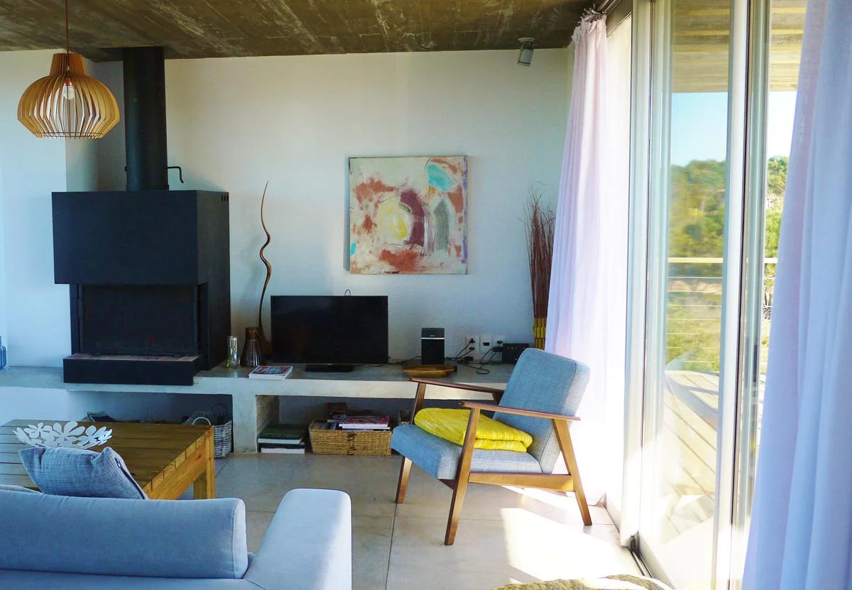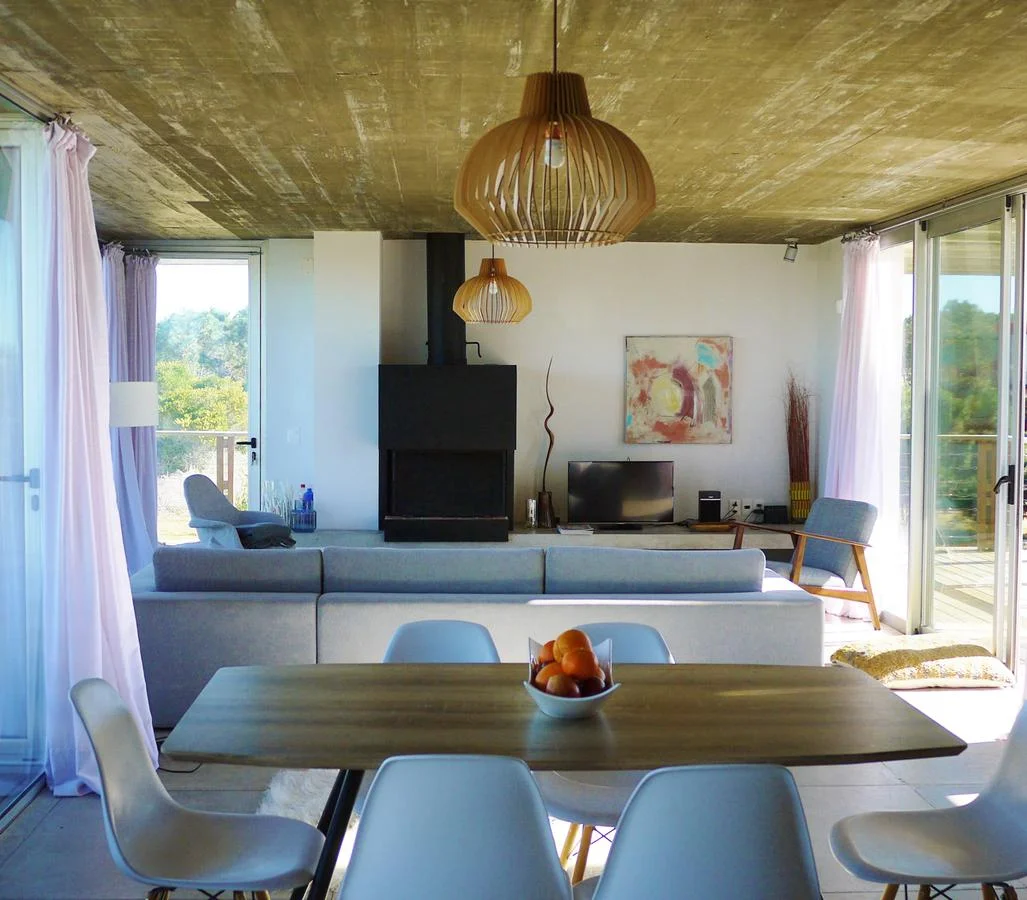 The spacious first-floor living room has floor to ceiling windows overlooking the ocean and Jose Ignacio lighthouse, comfortable sofa's, large wood burner, TV and speakers. Viejo Fox has a modern fully equipped kitchen and two dining areas, one in the large living area and a second relaxed eating area on the outside terrace by the large "parrilla" BBQ and pool.