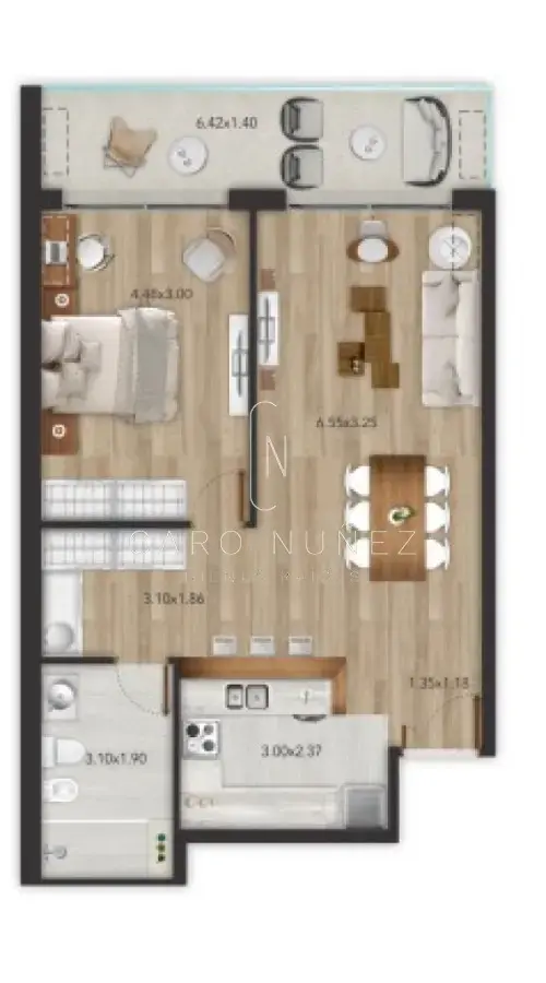 Espectacular planta con grandes dimensiones Calidad Premium Living comedor con terraza Cocina integrada Baño Dormitorio Barbacoa con parrillero Se entrega con equipamiento parcial: luminarias, campana, aires, mampara de baño y calefon.- Referencia Interna : Tera-385