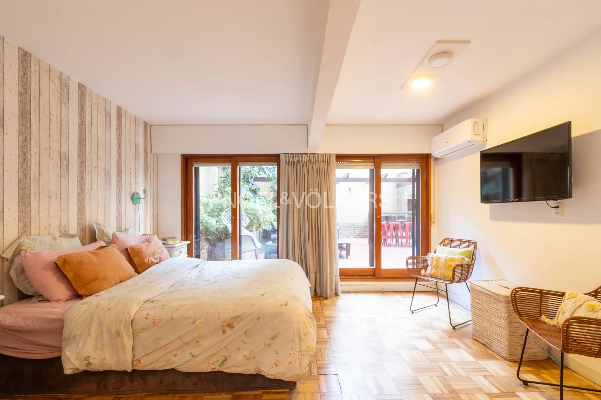 En el área íntima de la casa se encuentran los dormitorios, ambos en suite. La master con gran tamaño y amplios placares tiene salida al patio, lo que la hace luminosa y privada. El segundo dormitorio dispone de placares y tiene salida al balcón del frente. Todos los dormitorios tienen persianas y el principal cuenta con aire acondicionado. Baños con calefones.