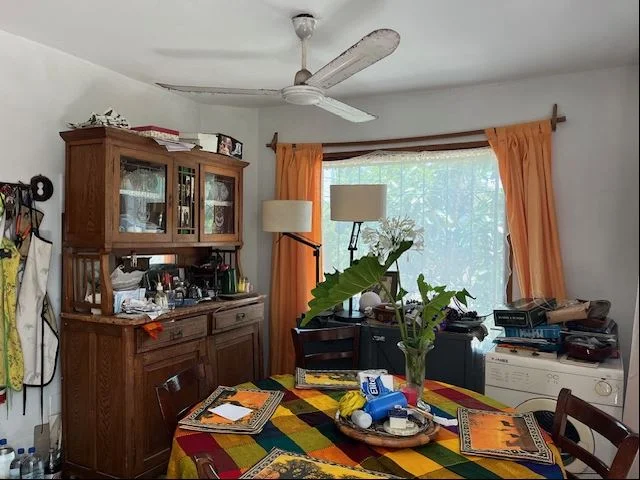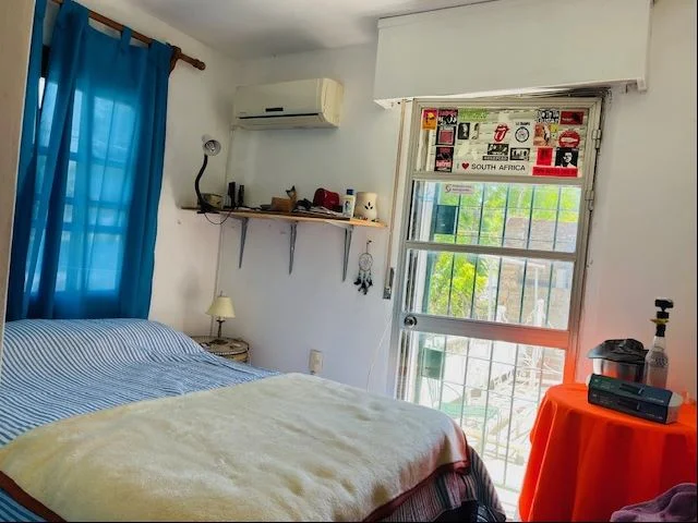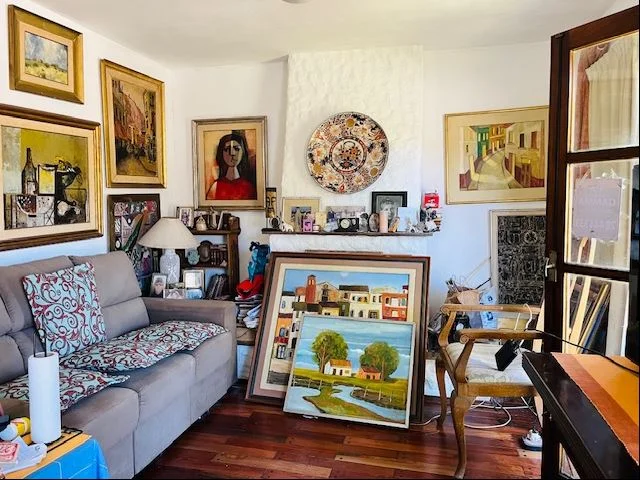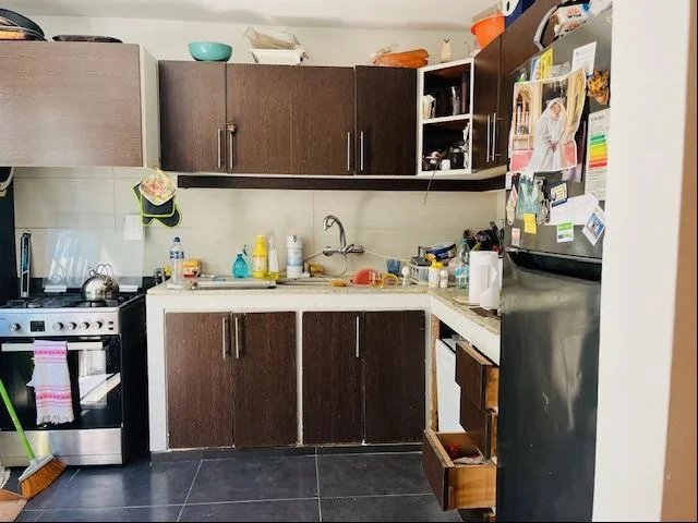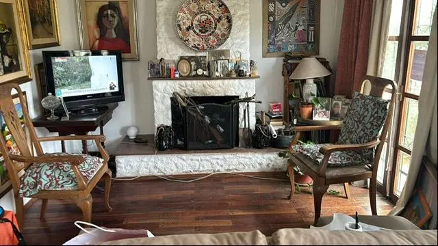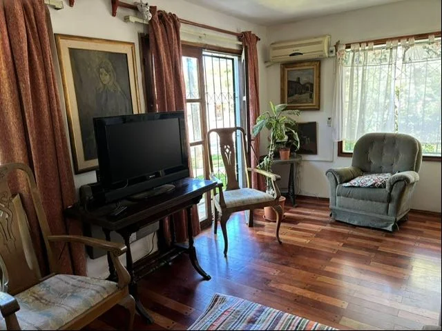 Living comedor con pisos tarugados y estufa a leña, cocina comedor amplia con salida a patio y cochera.