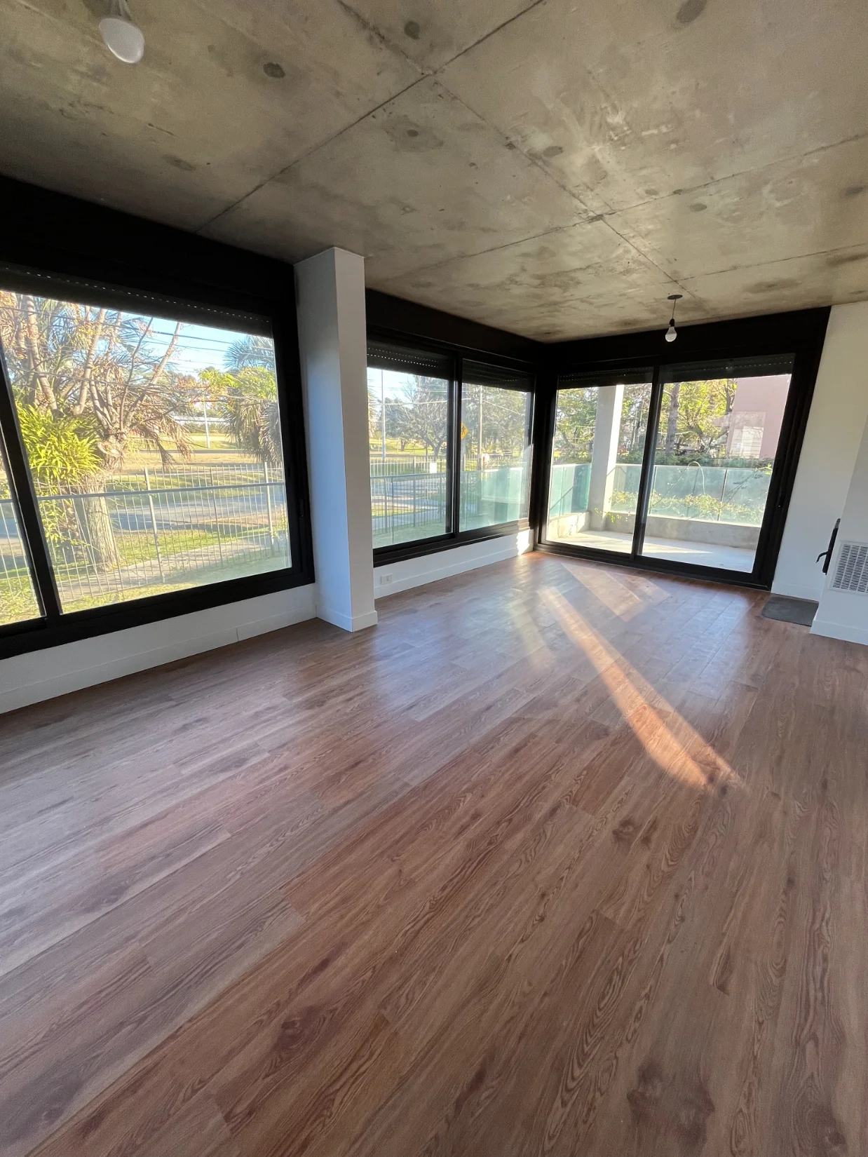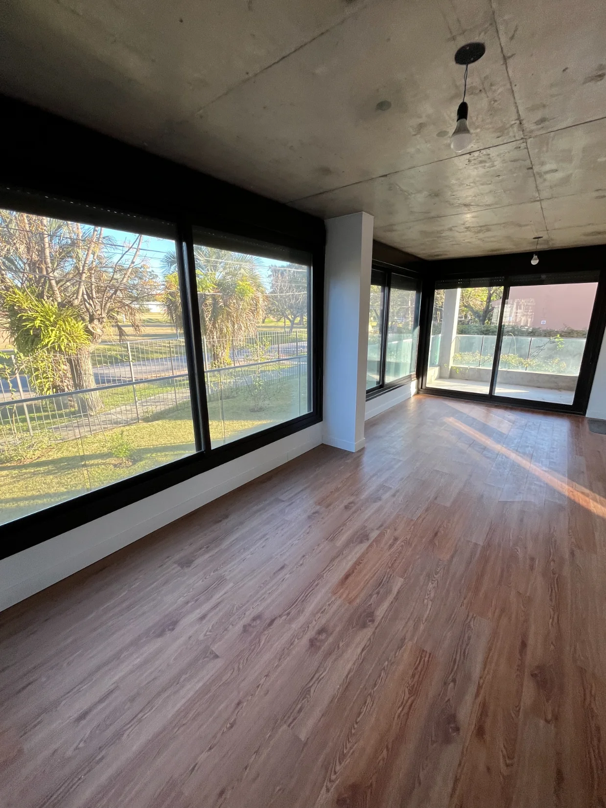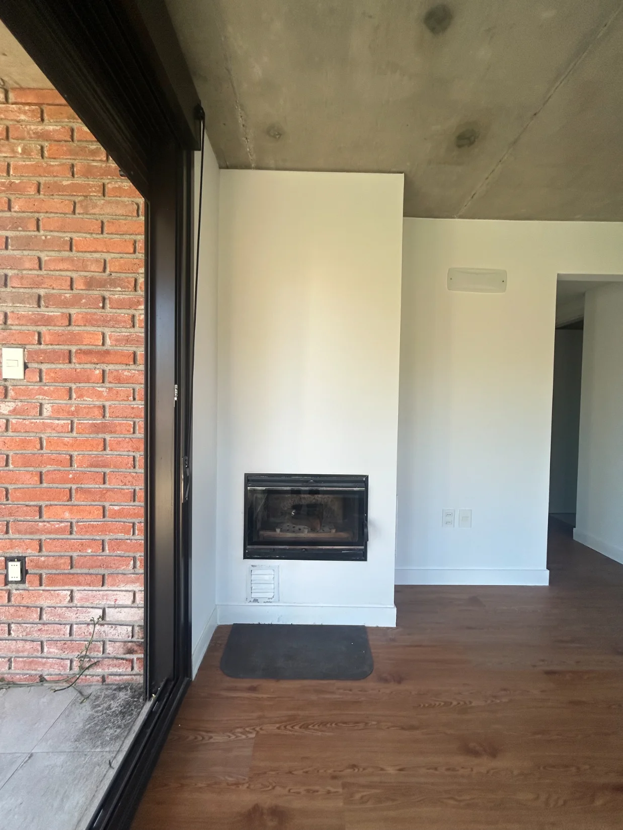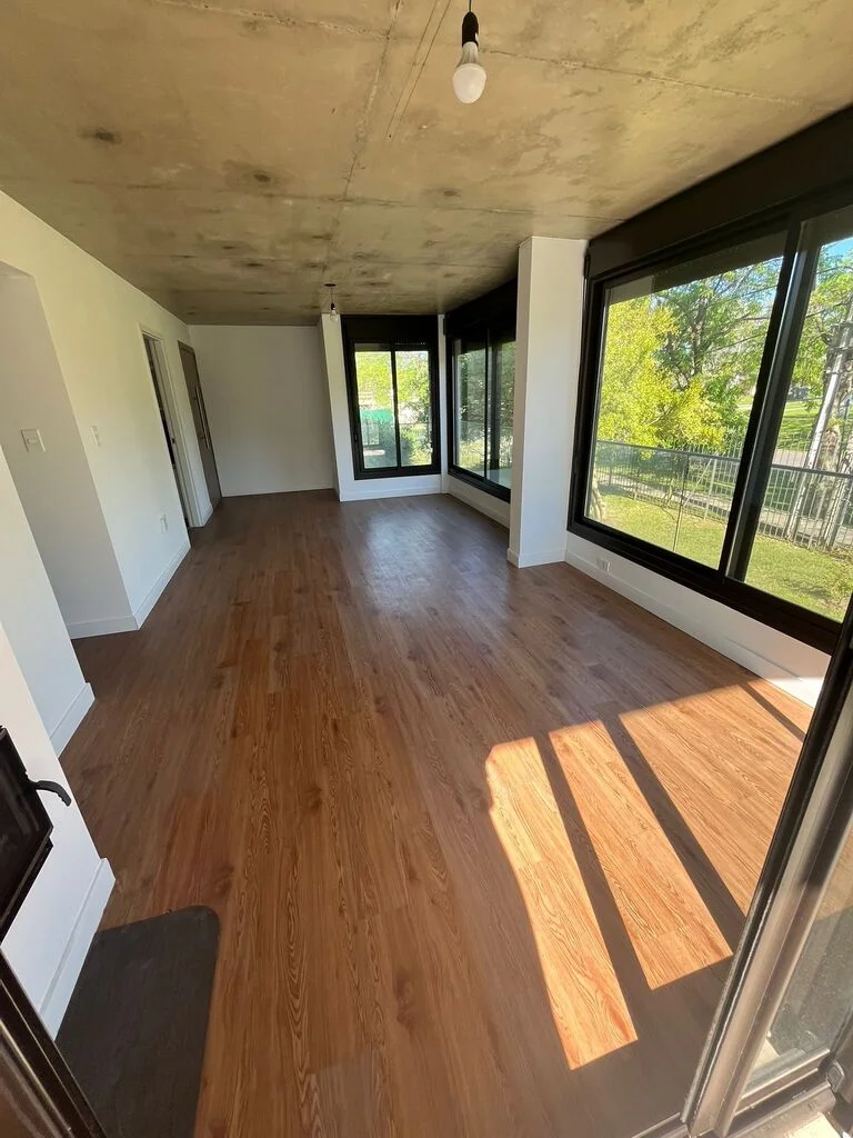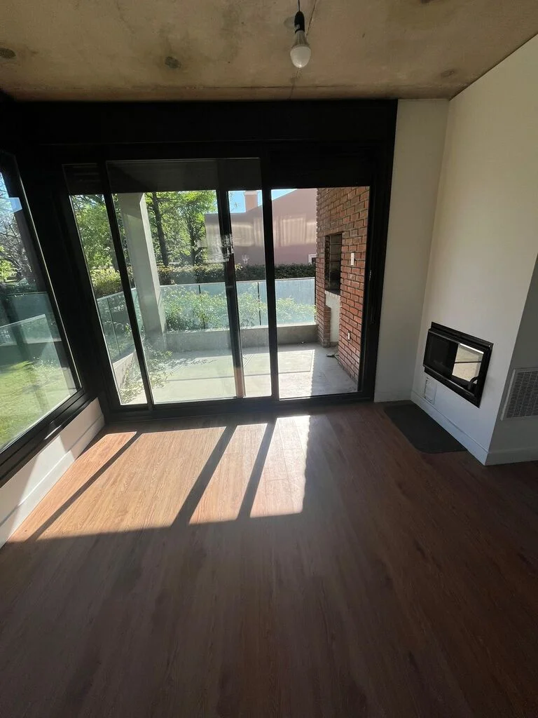 Living comedor amplio con grandes ventanales y estufa de alto rendimiento con salida a terraza con parrillero.